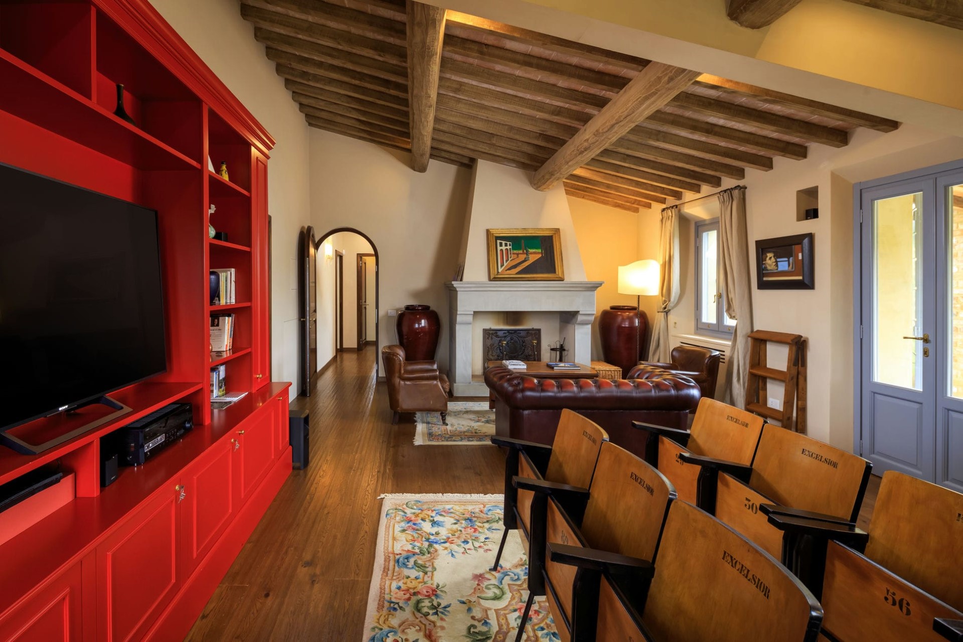 Guests can relax in three separate living rooms, all decorated with plush sofas and crackling fireplaces for cosying around on cooler evenings. The first floor living room features a home cinema with a large flat-screen TV and traditional cinema seating, perfect for a family film night. Additionally, there is a home office corner for those catching up on emails during their stay.
