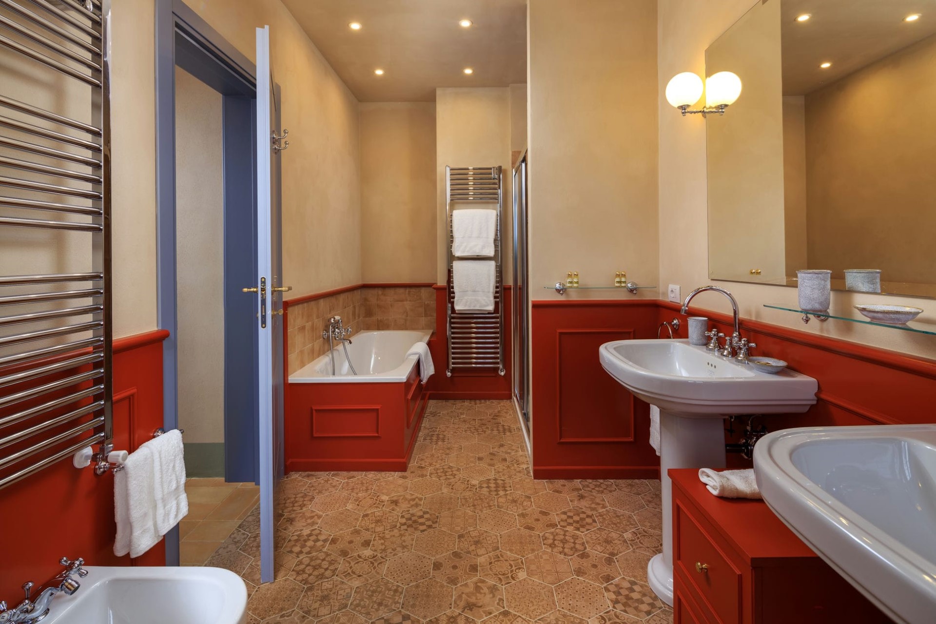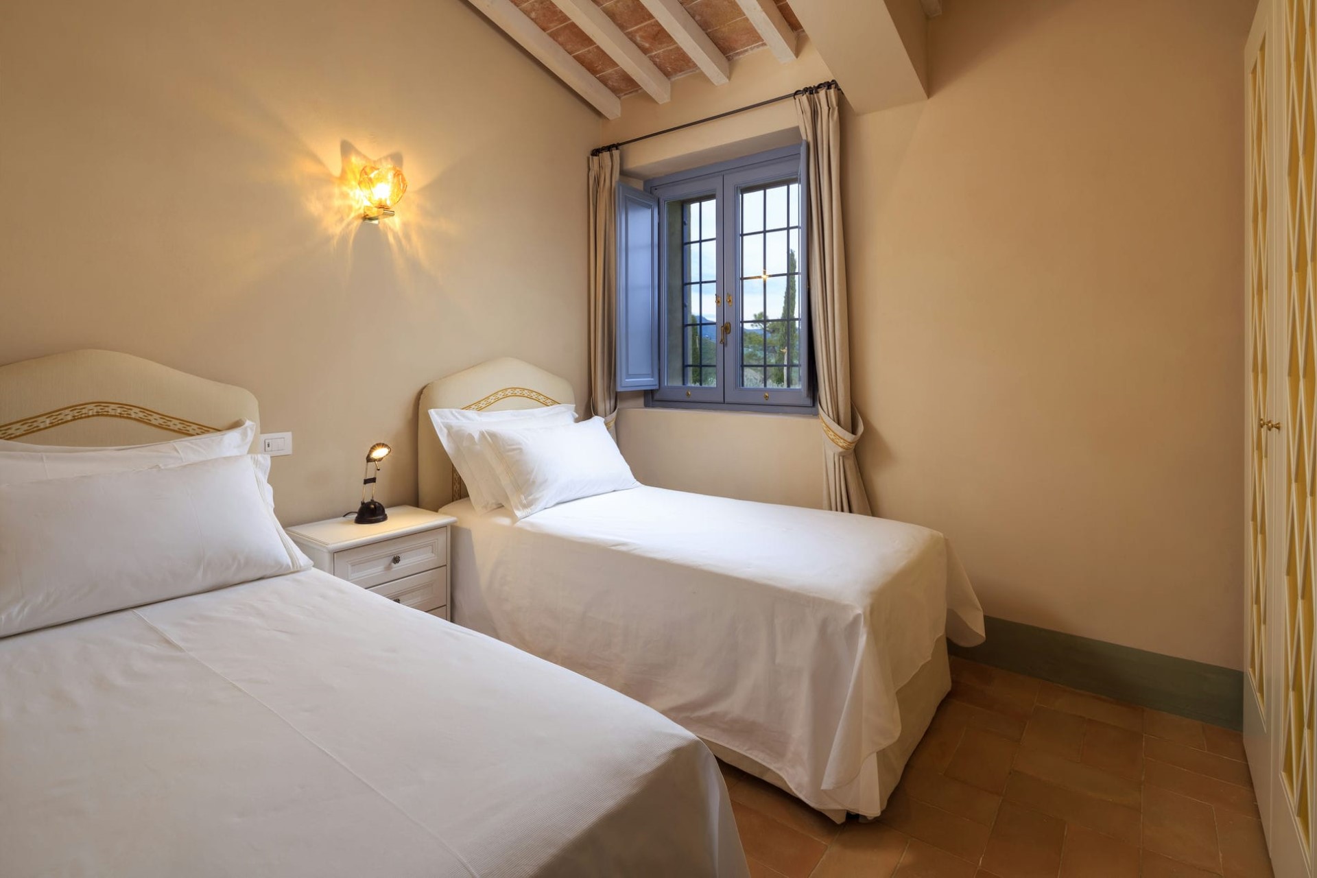 Bedroom 7 – twin beds (+ third single bed for child, on request) and shared bathroom with bathtub/shower