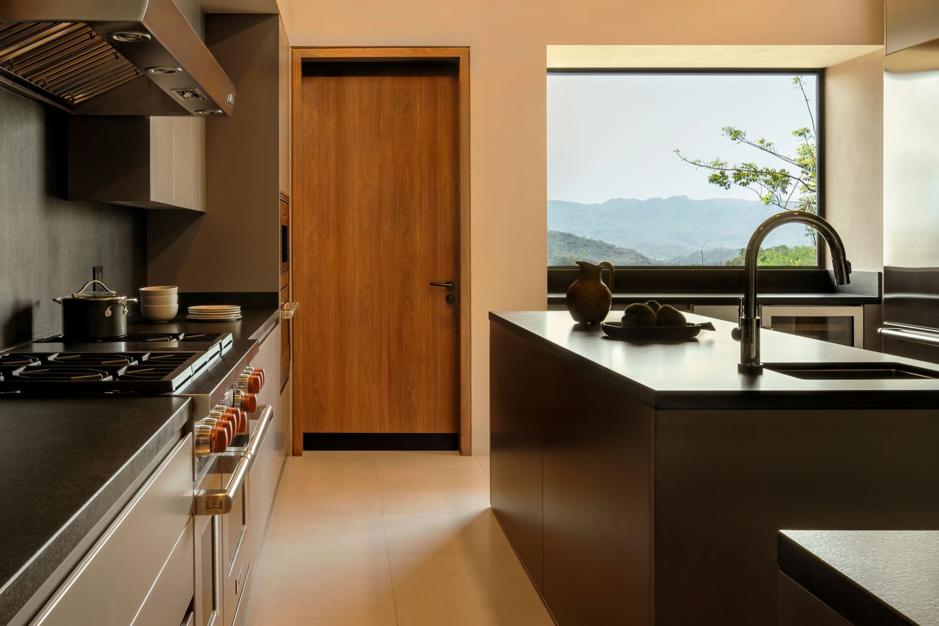 Indoors, a minimalist aesthetic, combining an earthy colour palette with natural materials, creates a refined atmosphere. Hand-laid stone floors and soaring hardwood ceilings are complemented by expansive glass walls that flood the interiors with light and frame panoramic views of the ocean, flatlands, and mountains beyond.