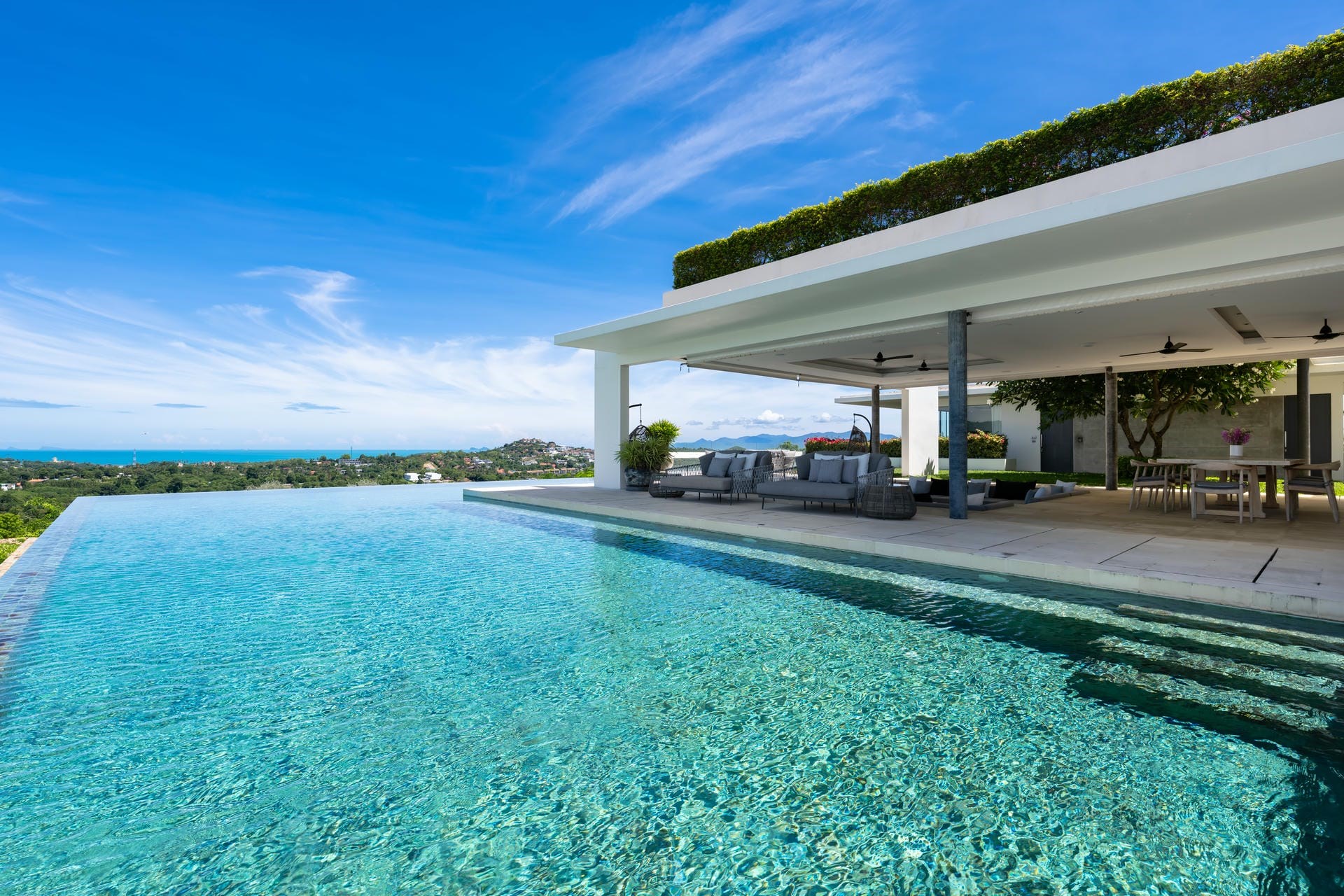 The villa boasts a large, L-shaped infinity pool that stretches across two sides of the terrace, perfect for a refreshing swim or soaking up the sun from a poolside lounger. A shaded sunken lounge offers a cosy spot for relaxation and socialisation, while the outdoor bar is great for enjoying a freshly brewed coffee or a tropical cocktail. The beautiful wooden dining table creates an idyllic atmosphere for al fresco meals and relaxed barbecues with family and friends.