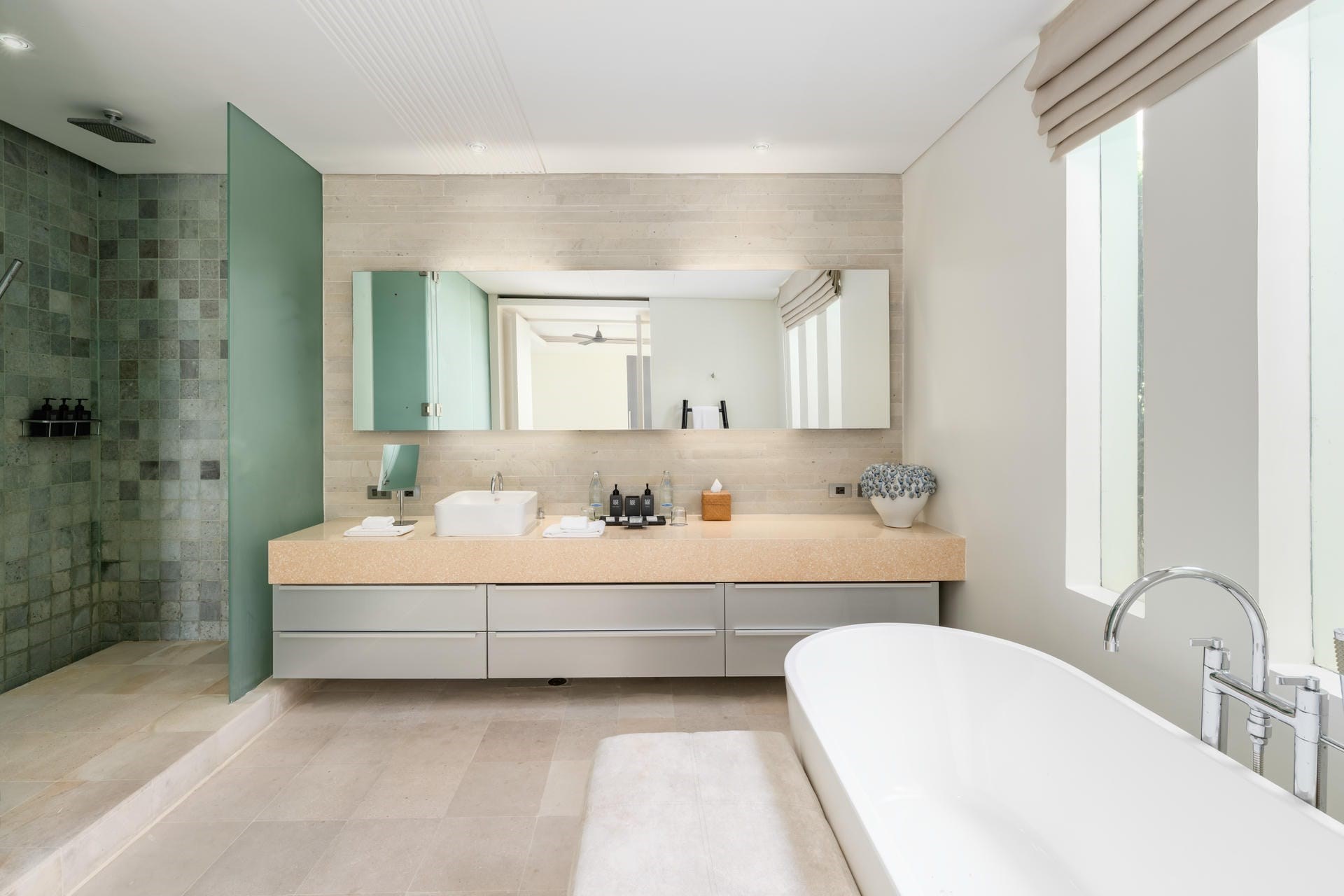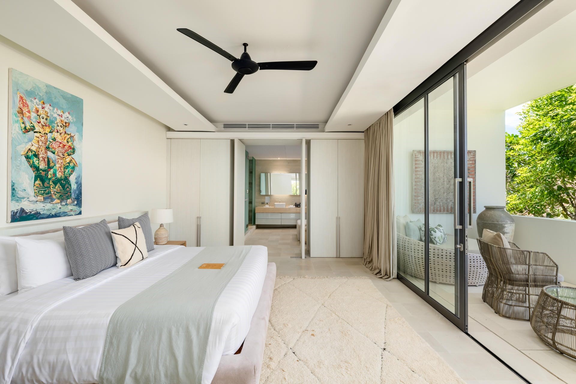 Each of the four spacious bedrooms provides a private sanctuary with a king-size bed, a large en-suite bathroom, and a private terrace offering ocean and island views, ensuring a comfortable and relaxing stay.