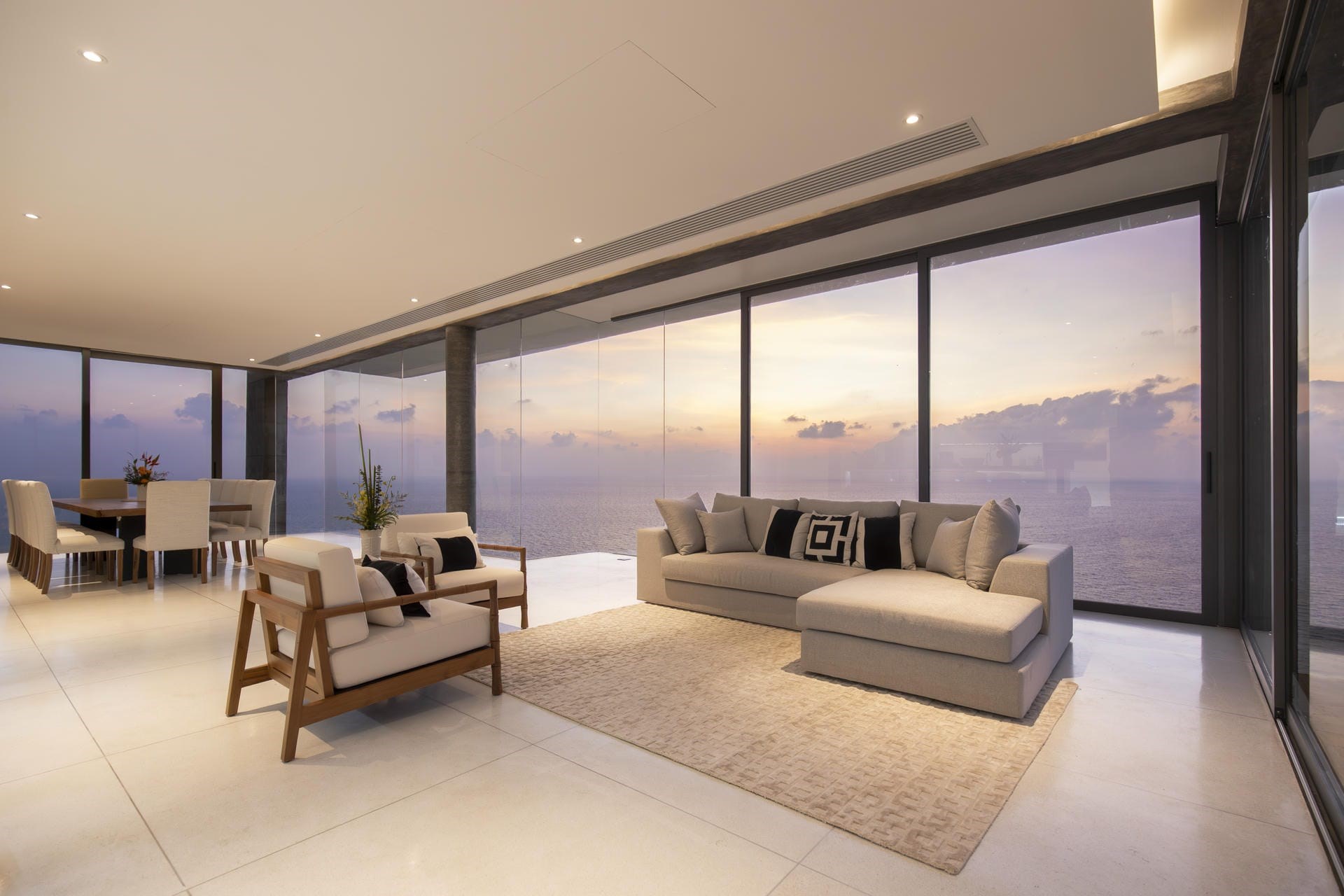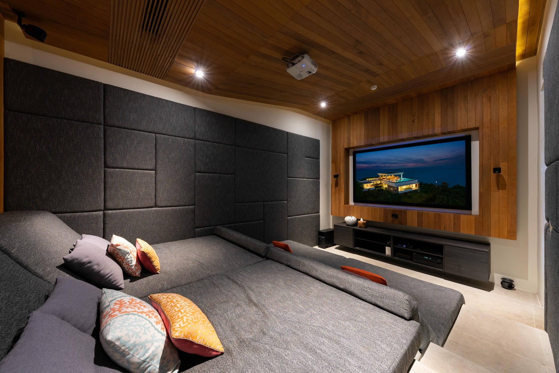 The villa’s top floor is a haven for relaxation and socialisation. A sprawling terrace with a wraparound infinity pool is the ideal place to take in the 360-degree views. Guests can soak up the rays from sun loungers or relax in the shade on plush outdoor lounge seating. A fully equipped kitchen and dining table complete the al fresco living space.
