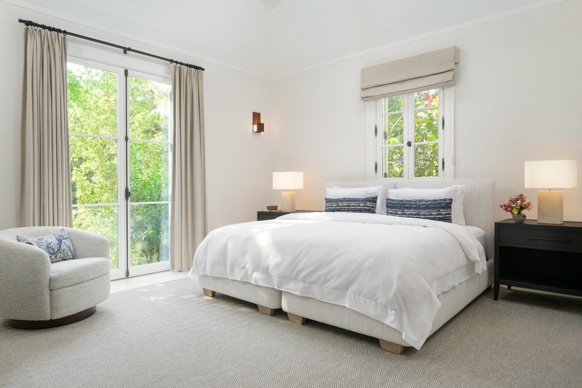 Bedroom 4 – king-size bed, en-suite bathroom with dual vanity & shower, garden access, and ocean views