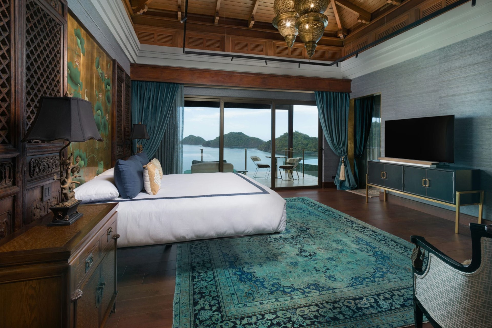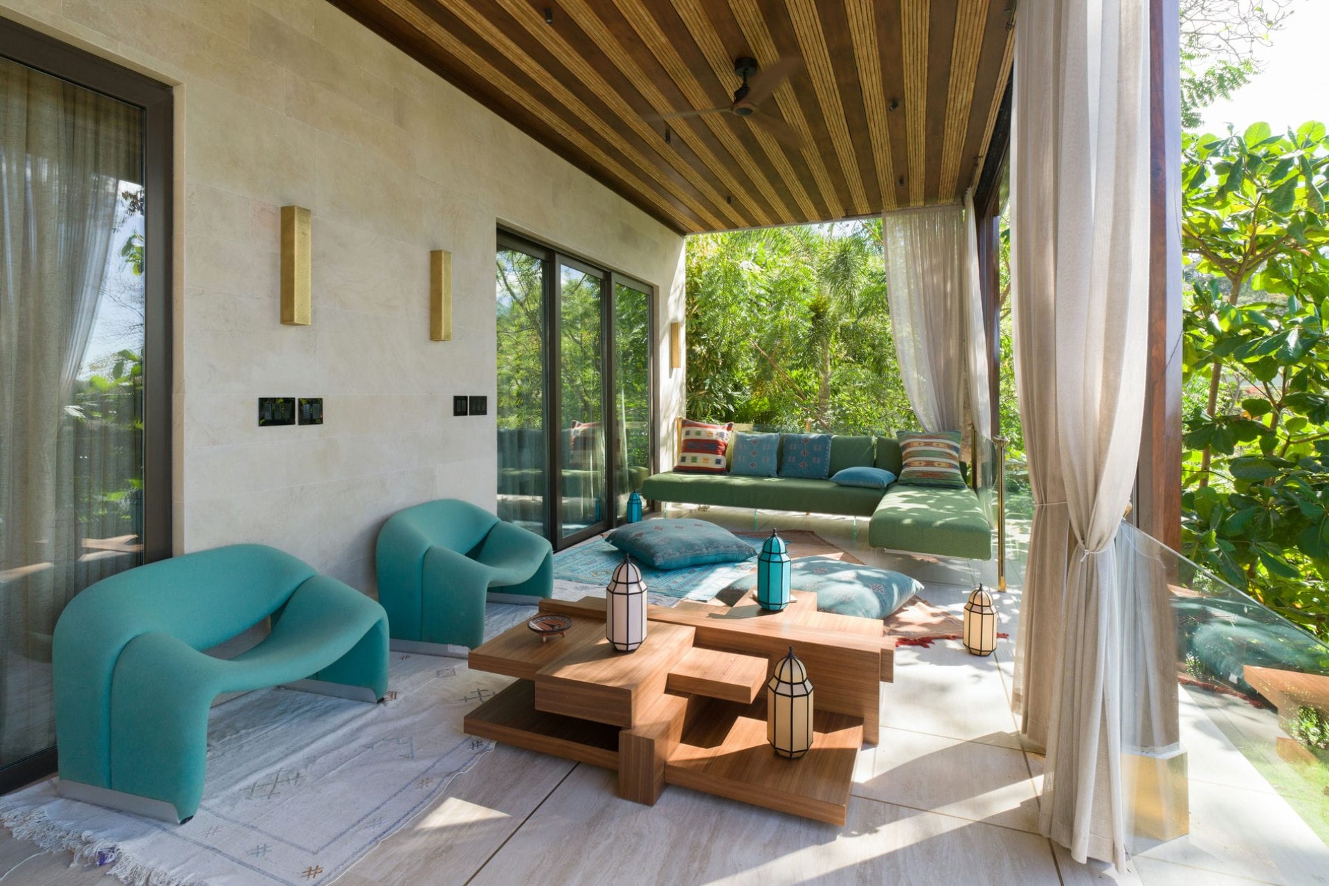Indoors, an expansive open-plan layout creates a spacious feel throughout the villa. Floor-to-ceiling windows open to the terrace, offering spectacular views from the living areas and allowing sunlight and fresh ocean breezes to flow through. A plush lounge area invites relaxation, while an elegant dining table sits between the vibrant show kitchen and the pool terrace for an immersive dining experience.