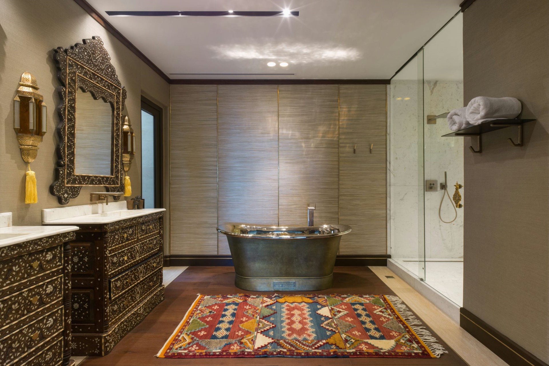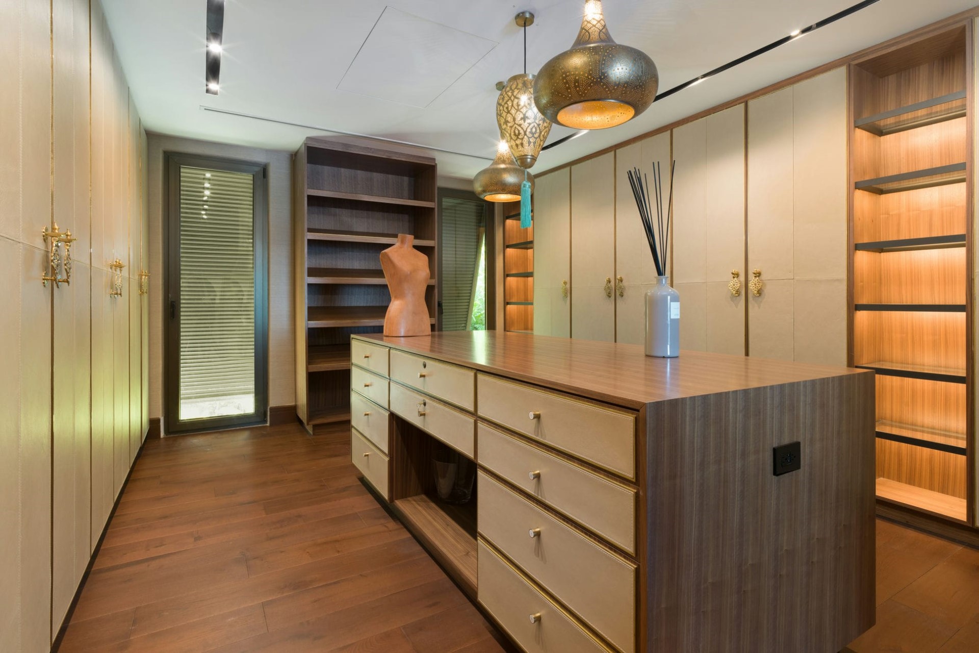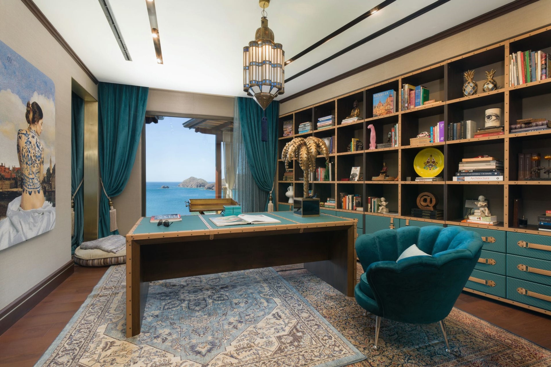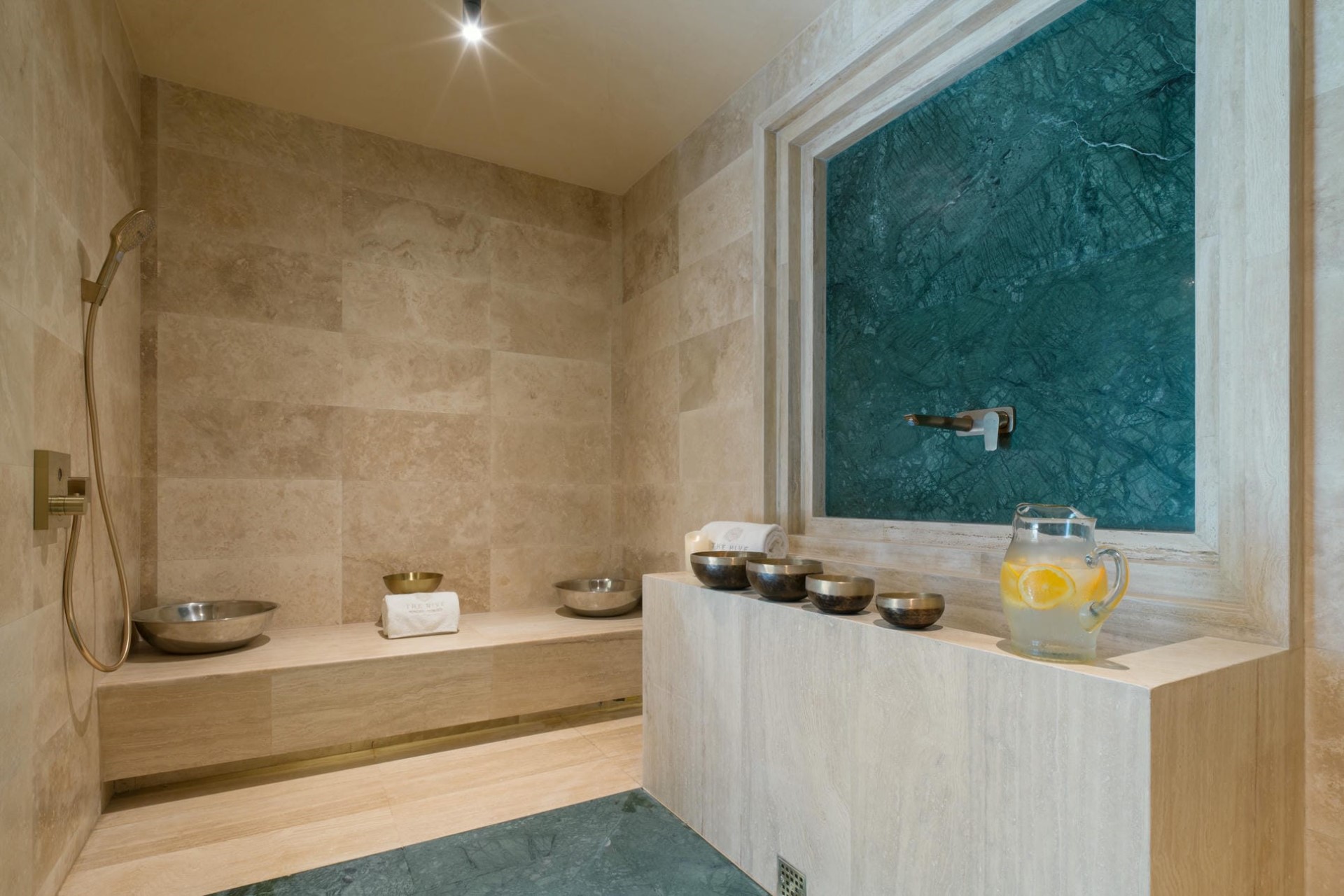 A fully-equipped gym features panoramic windows for a workout with a view. Post-workout, guests can make use of the villa’s private spa, complete with a hammam and relaxing treatment rooms.