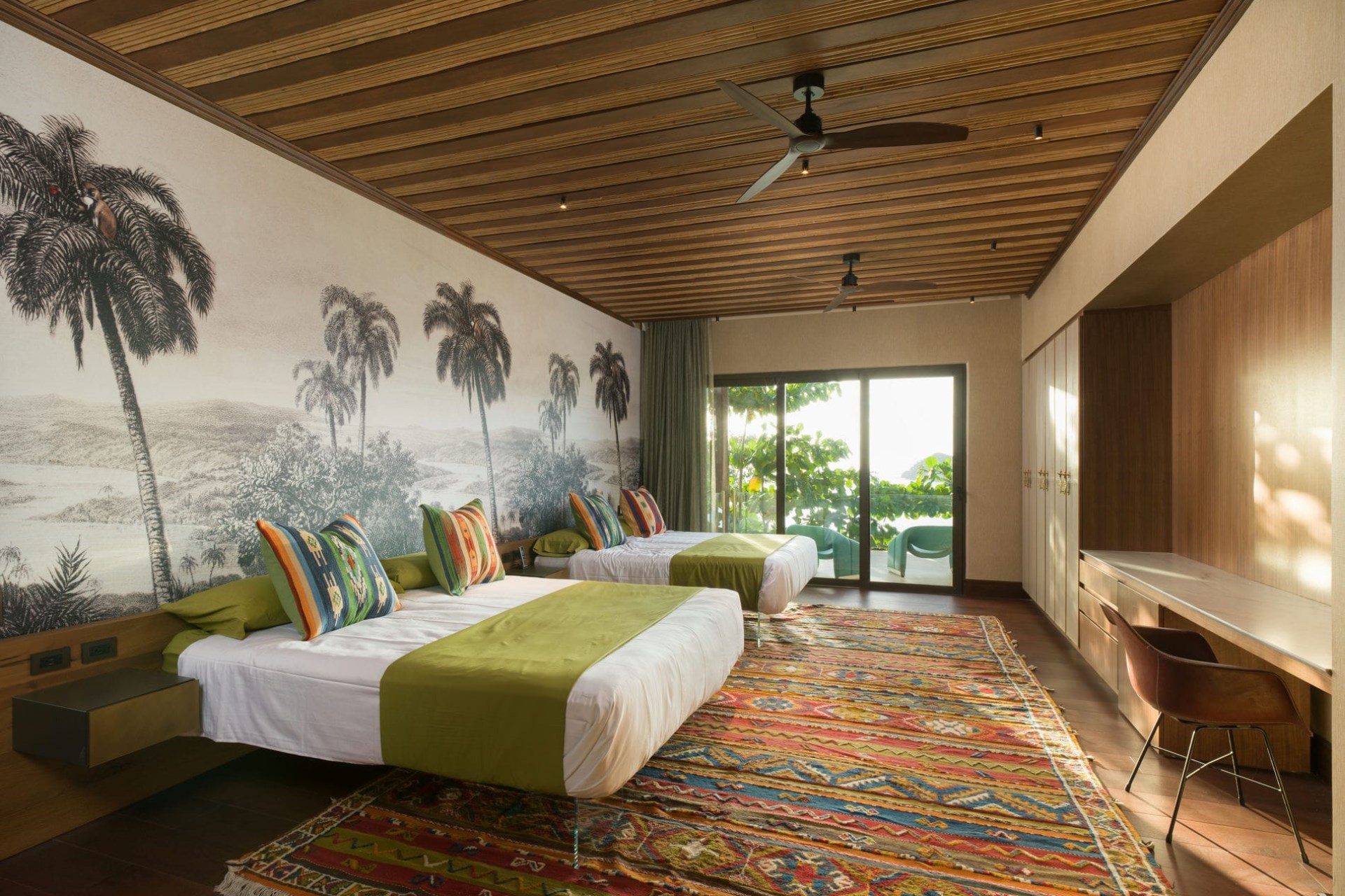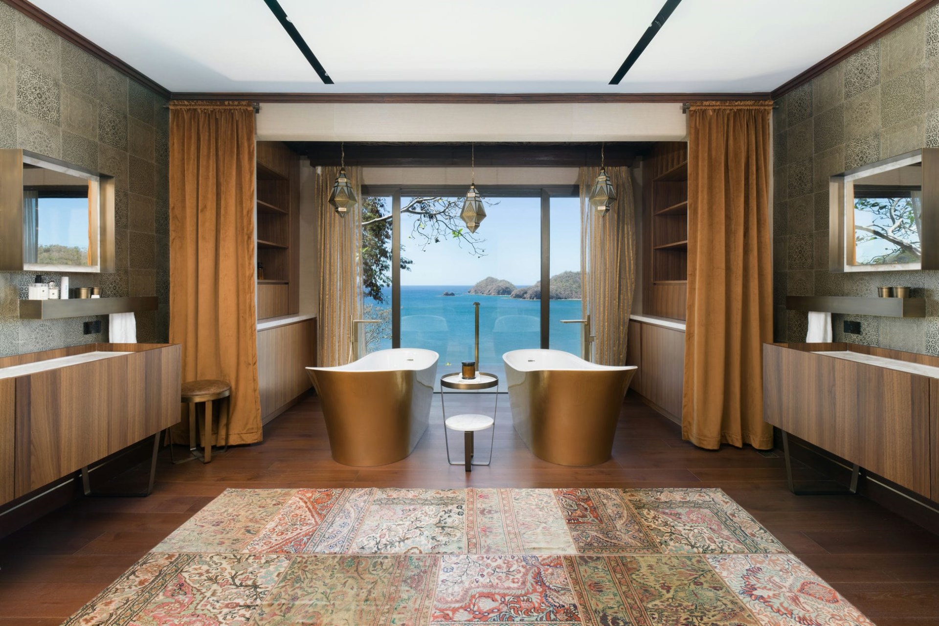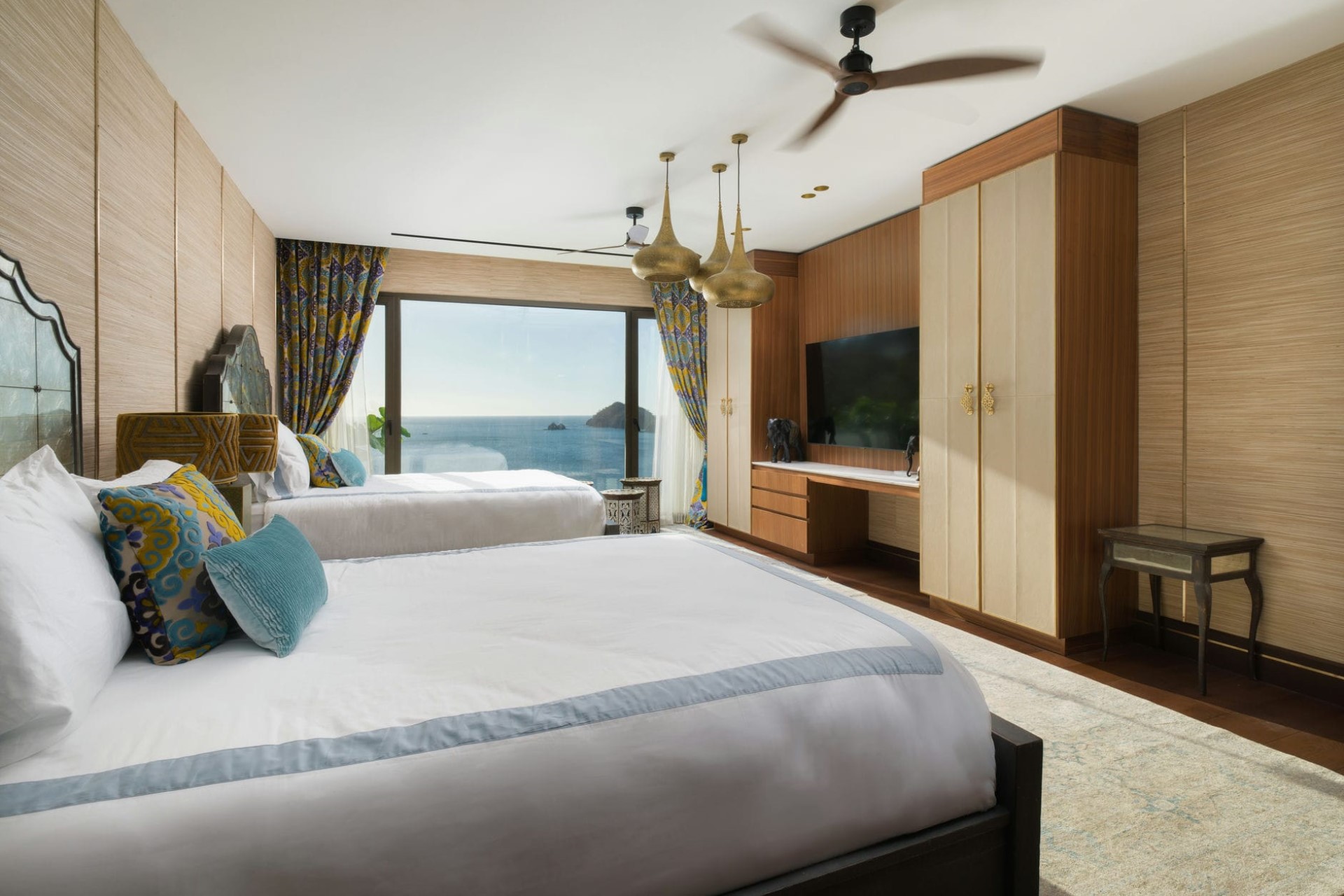 Bedroom 2 – 2 x king-size bed, en-suite bathroom with dual vanity, bathtub & separate shower + outdoor shower, shared terrace, and ocean views