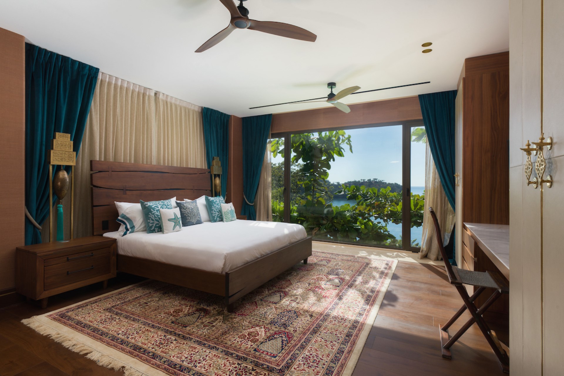 Bedroom 4 – king-size bed, walk-in wardrobe, en-suite bathroom with shower, and ocean views