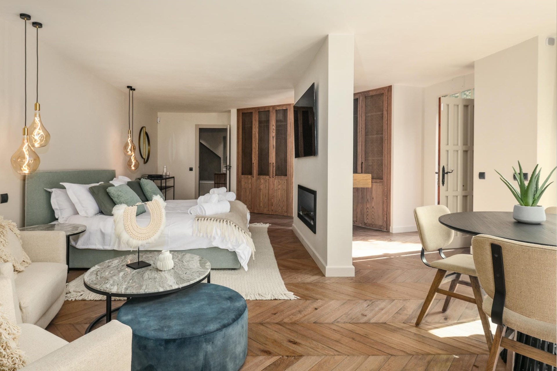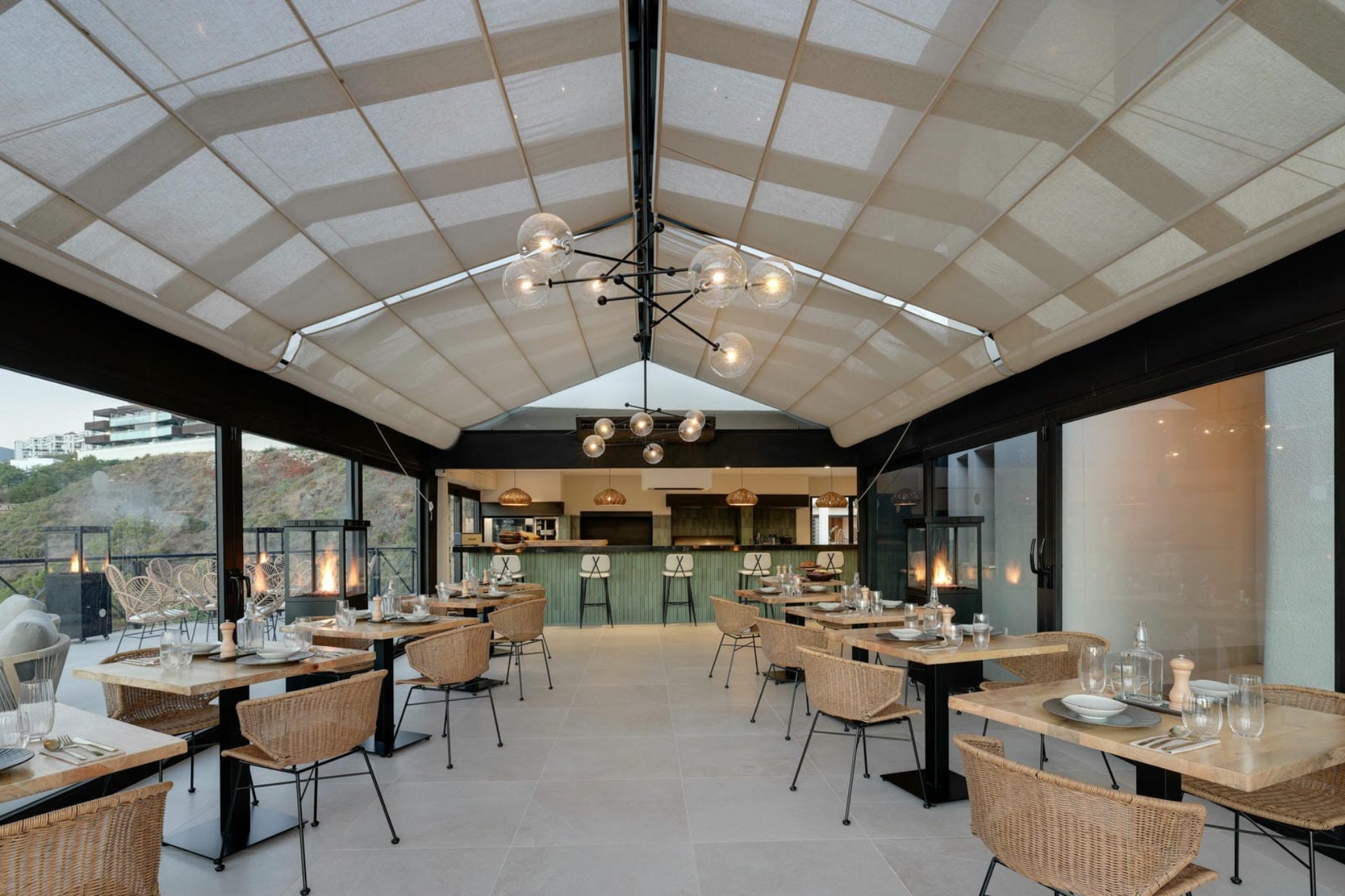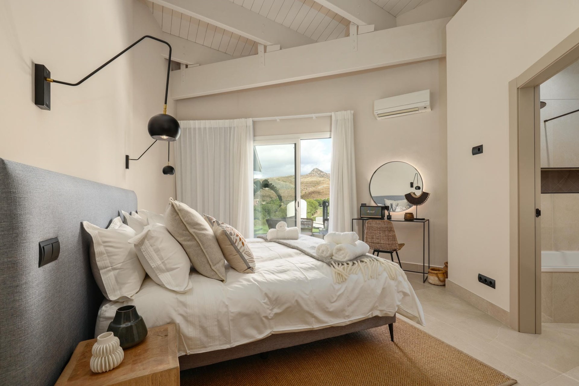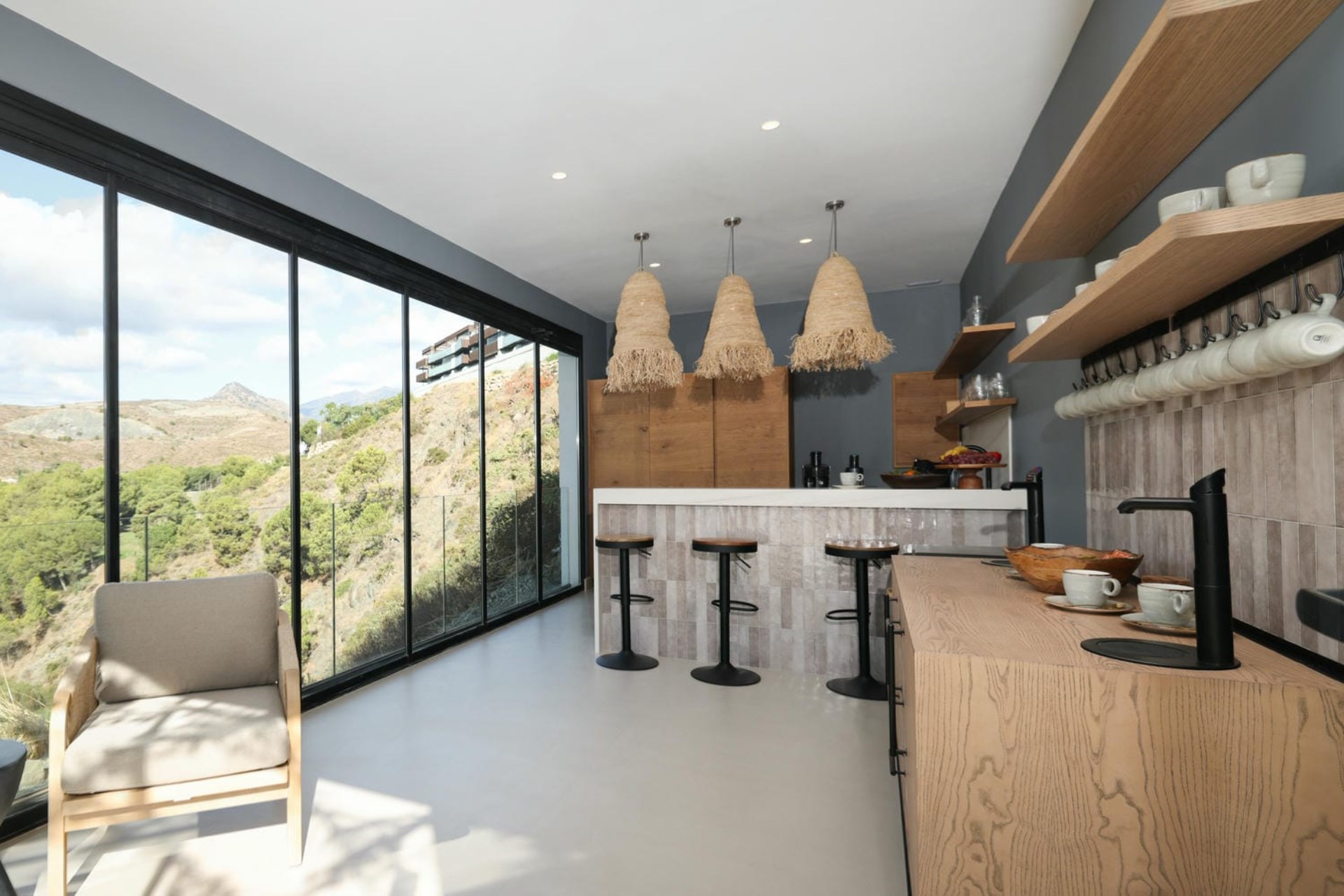 The villa itself is a masterpiece of contemporary architecture, seamlessly blending sophisticated interiors with the natural beauty of its Andalusian surroundings. Every indoor space has been thoughtfully curated to provide ultimate comfort and sophistication while maximising natural light. From the bright lounge areas with their high ceilings and bi-fold doors to the private restaurant, which boasts both indoor and outdoor seating with spectacular views across the rolling hills, to the sparkling sea beyond, there are plenty of spaces for relaxing and socialising.