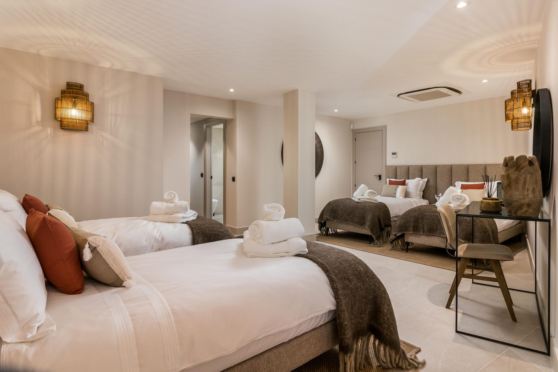 Bliss Bedroom 5 – twin beds (converted to 1 x super-king-size on request), en-suite bathroom with bathtub & separate shower, and private terrace