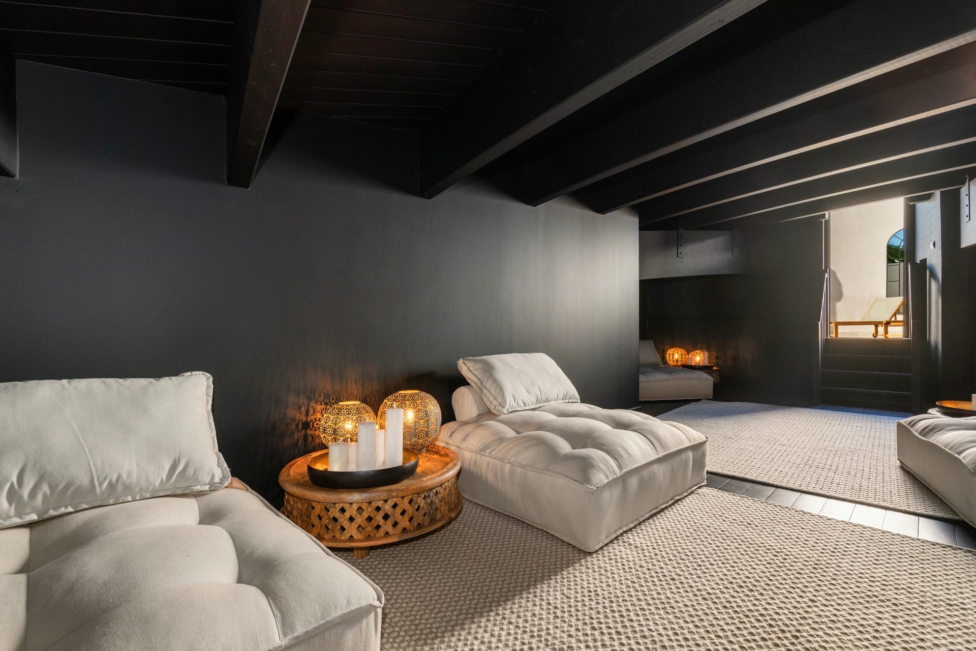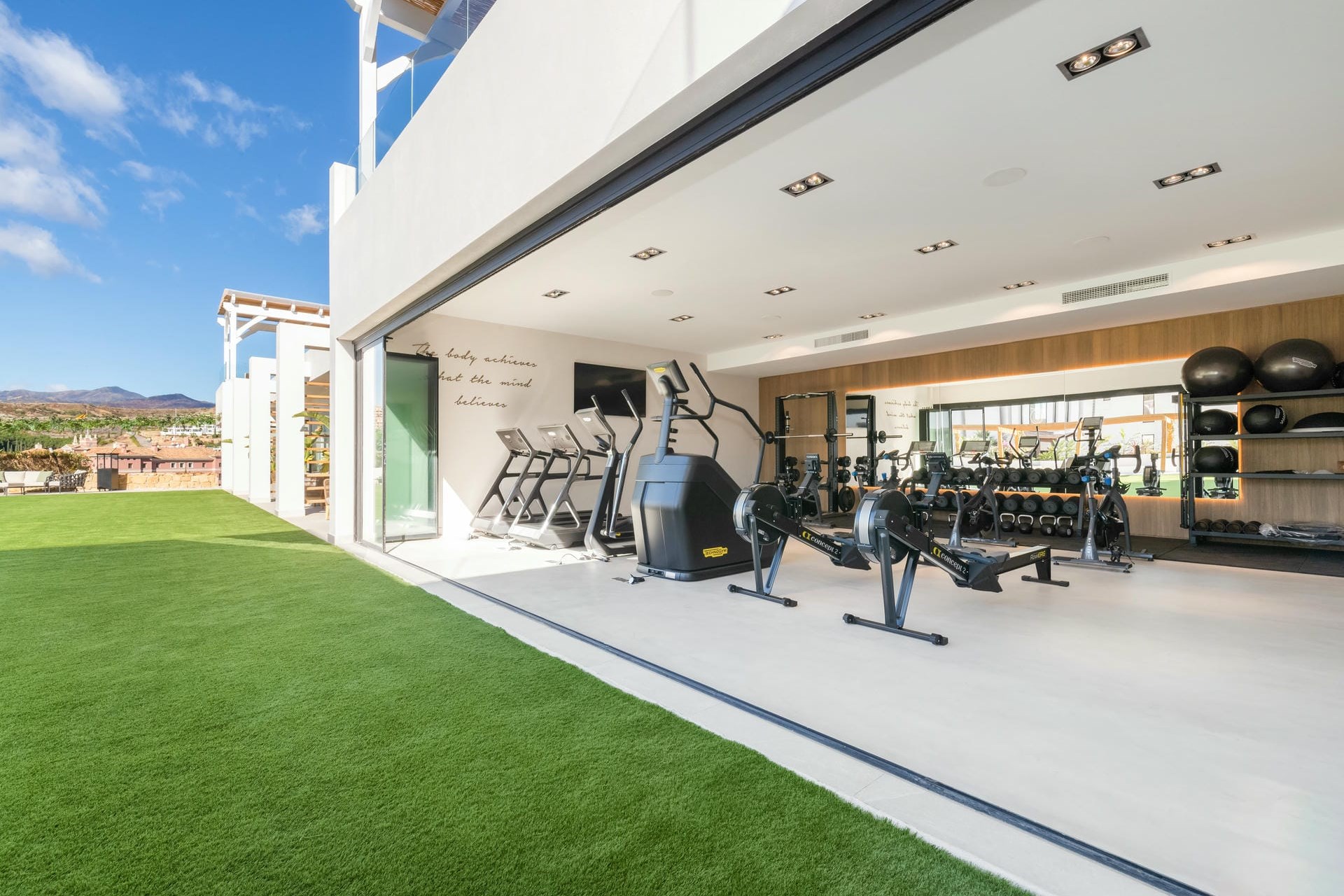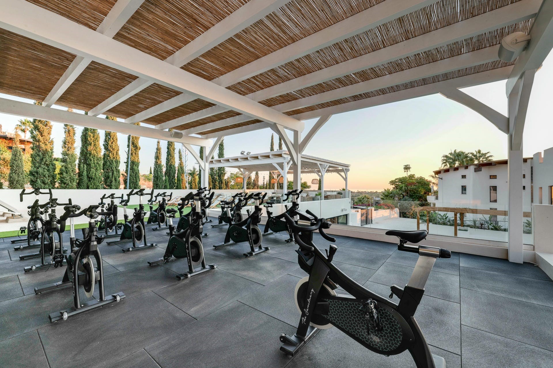 An expansive courtyard garden separates the main villa from the guest house. Surrounded by lush greenery, this versatile space is ideal for a range of activities, from outdoor fitness classes to weddings and special events. Overlooking the courtyard, the expansive roof terraces provide additional space for outdoor living. One section of the terrace is designated for an outdoor cinema, complete with comfortable seating and ambient lighting—ideal for private screenings under the stars. Another section features a rooftop spin studio equipped with numerous bikes, catering to those seeking a fitness retreat or simply wanting to enjoy a spin session while taking in the beautiful surroundings.