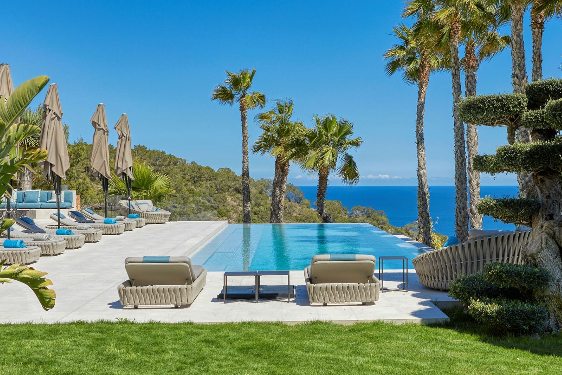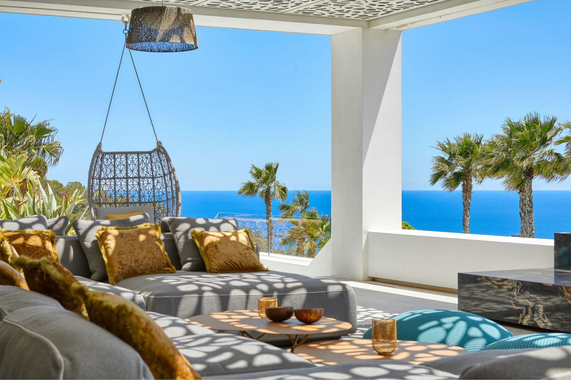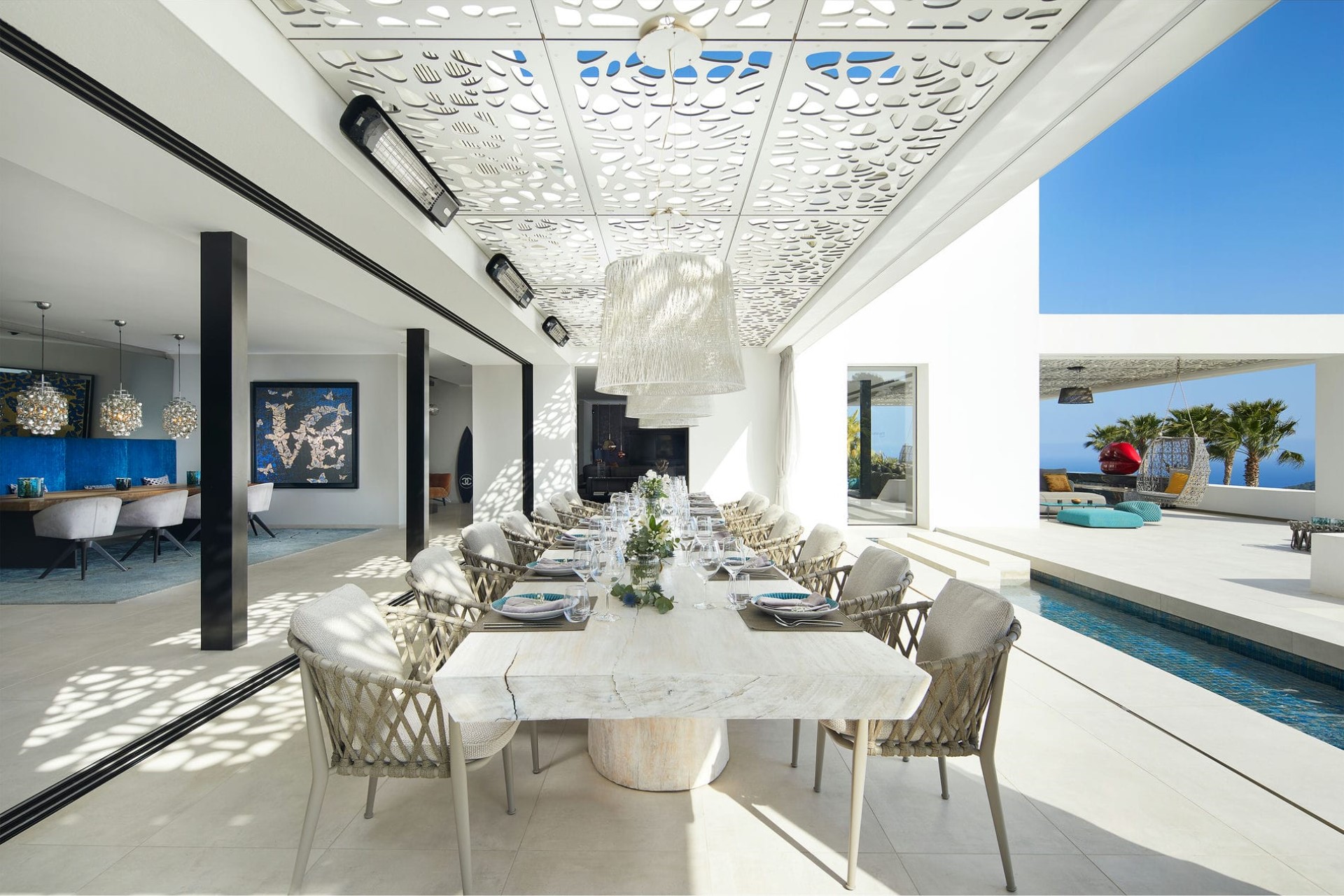 Indoors, the villa’s design is a harmonious blend of modern aesthetics and natural elements, seamlessly integrating the interiors with the stunning outdoor landscape. Floor-to-ceiling windows throughout flood the villa with natural light and showcase the mesmerising vistas of the turquoise waters and the neighbouring island of Formentera.