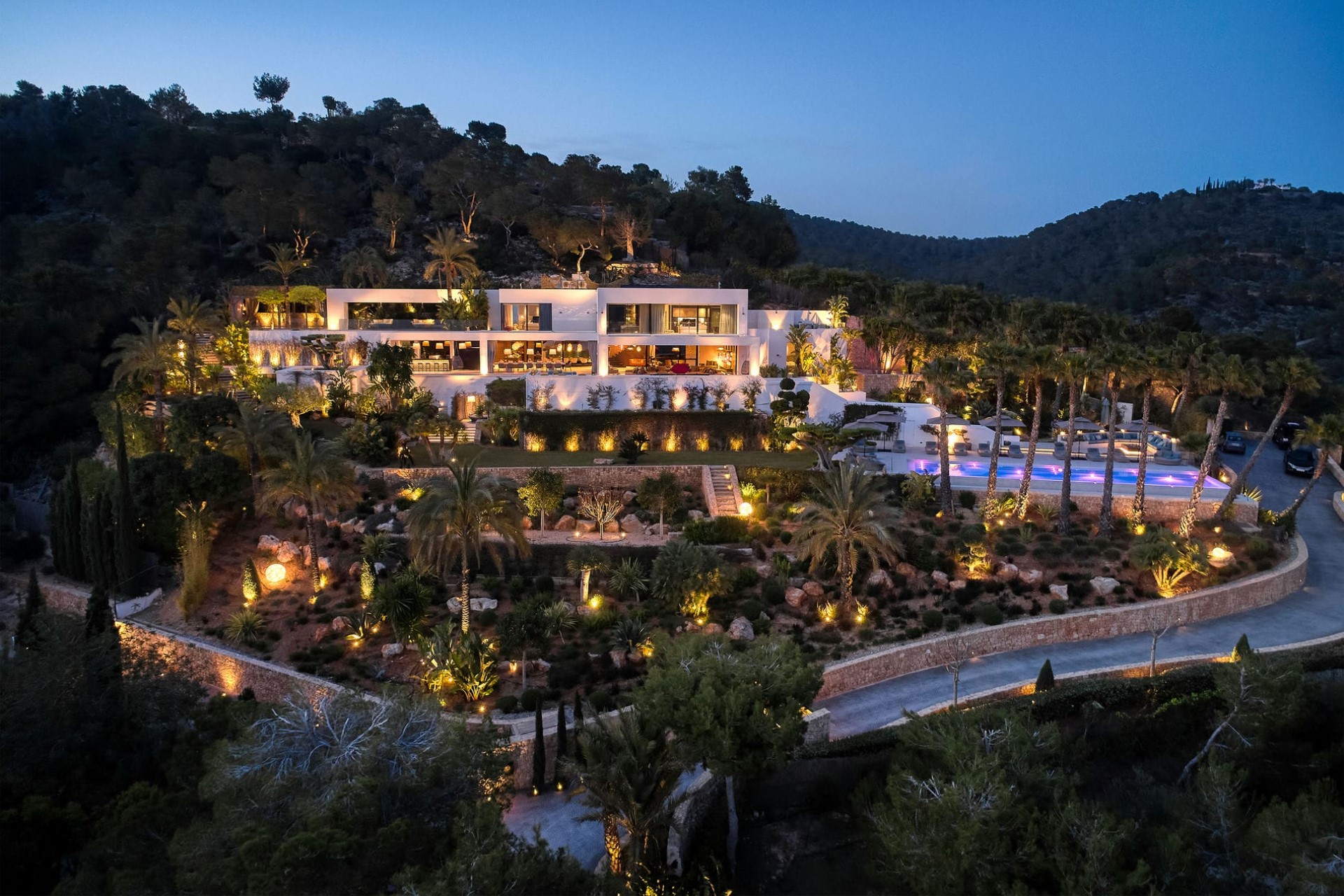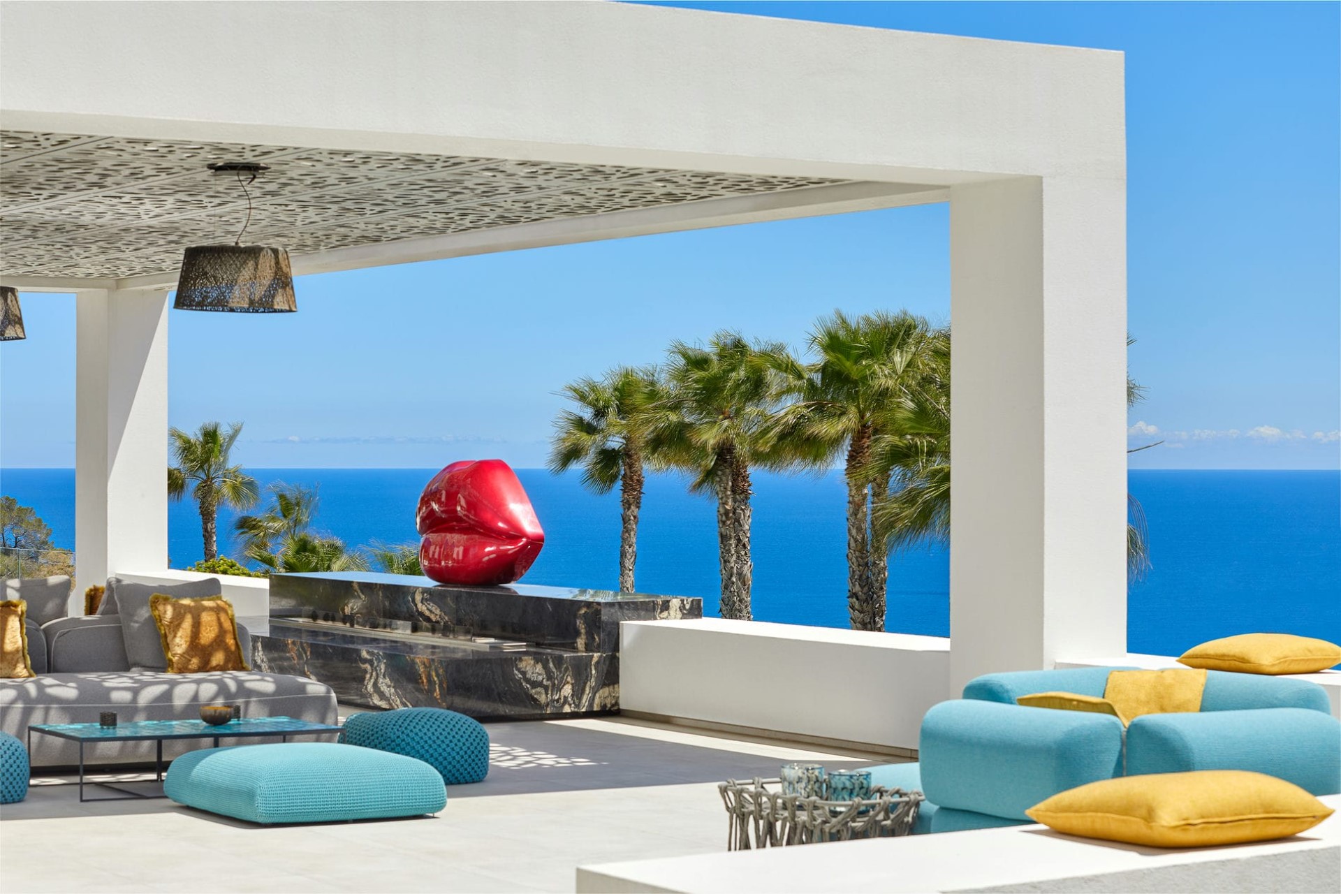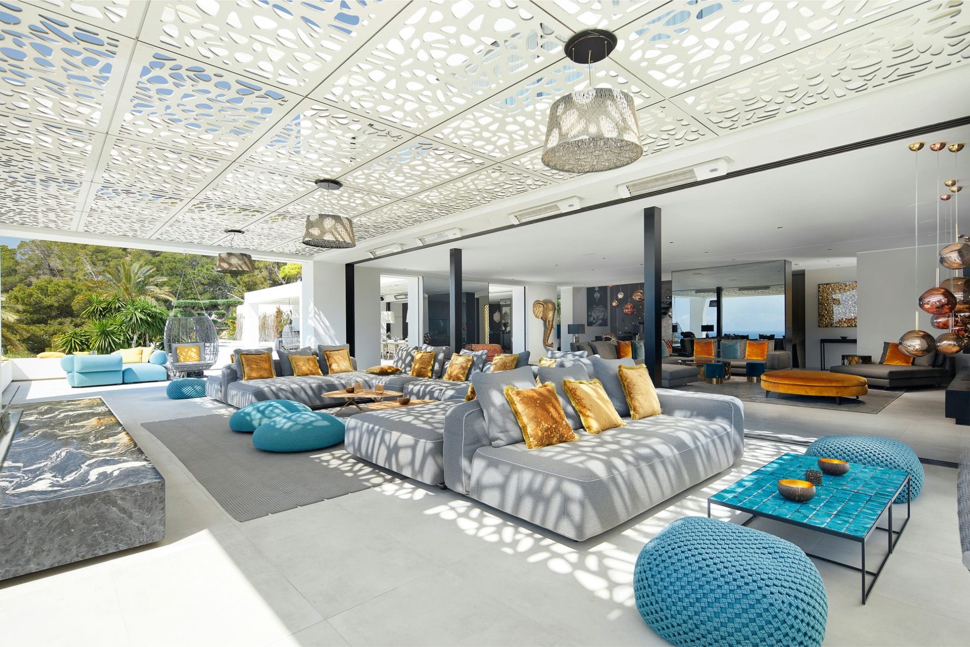 Indoors, the villa’s design is a harmonious blend of modern aesthetics and natural elements, seamlessly integrating the interiors with the stunning outdoor landscape. Floor-to-ceiling windows throughout flood the villa with natural light and showcase the mesmerising vistas of the turquoise waters and the neighbouring island of Formentera.