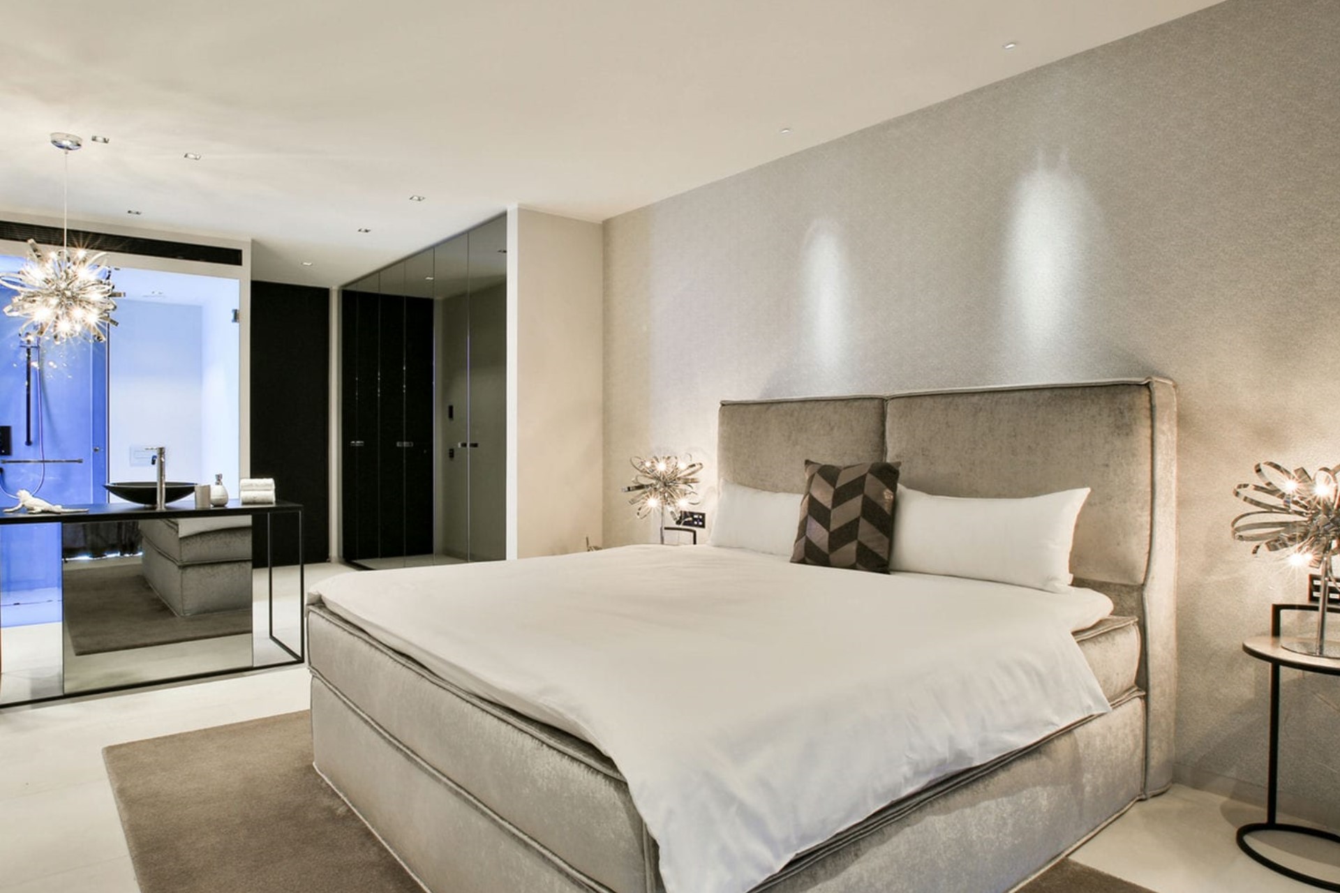 The heart of the villa is the expansive and stylish living area, featuring a spacious open-plan layout that combines the living room, dining room, and kitchen. Plush sofas and armchairs are arranged around a fireplace in the living room, creating an inviting space for relaxation and socialising. The adjacent dining area boasts a grand table that can comfortably seat up to 14 guests, perfect for hosting lavish dinner parties. Moreover, the state-of-the-art kitchen is a chef’s dream, equipped with top-of-the-line appliances and a sleek island that doubles as a breakfast bar.