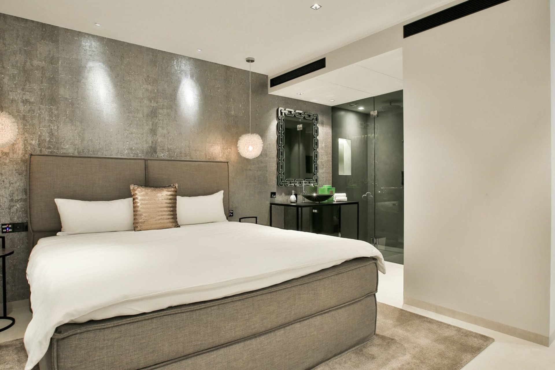 Bedroom 4 – king-size bed, en-suite bathroom with shower, and terrace access