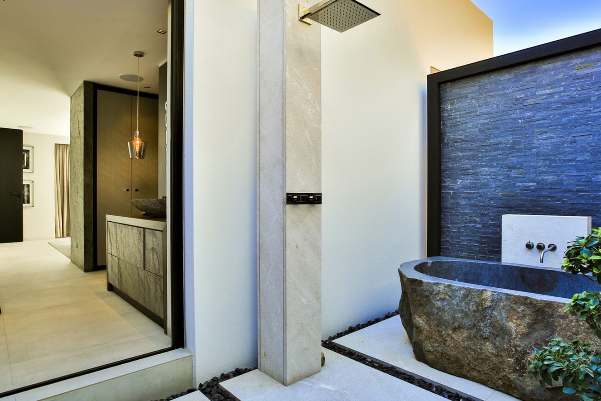 Master Bedroom 1 – super-king-size bed, en-suite bathroom with shower + outdoor bathtub & separate shower, private garden, and sea views