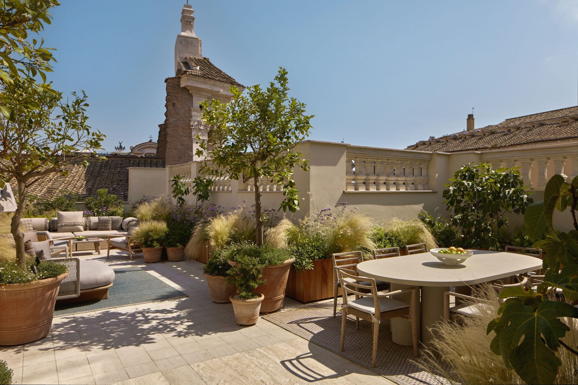 This 126-square-metre apartment on the hotel’s fourth floor overlooks the carefully restored façade of the San Marcello al Corso Church below. It boasts a private terrace with lounge and dining areas surrounded by greenery, perfect for a morning coffee in the sunshine or a glass of wine at sunset.
