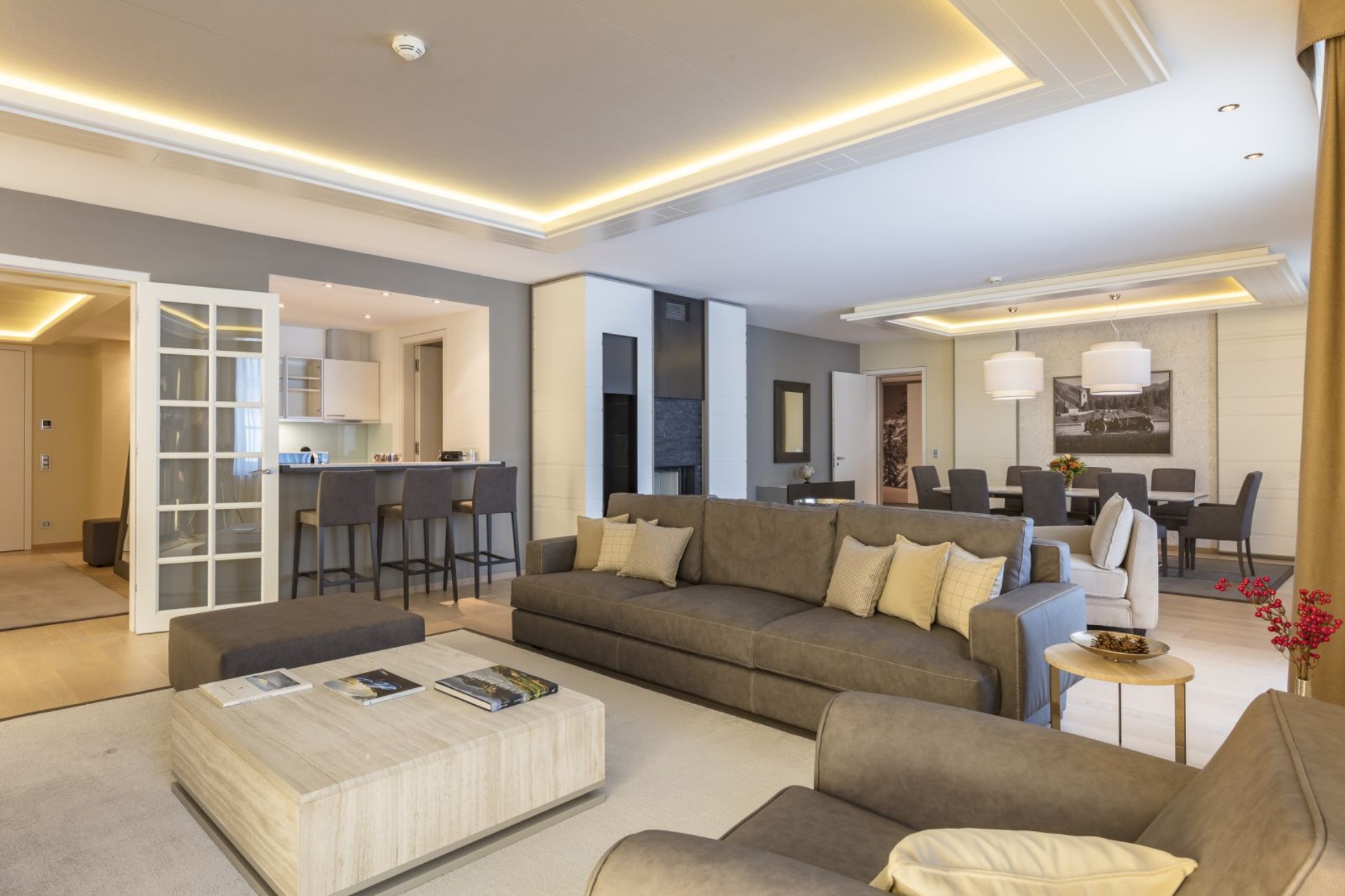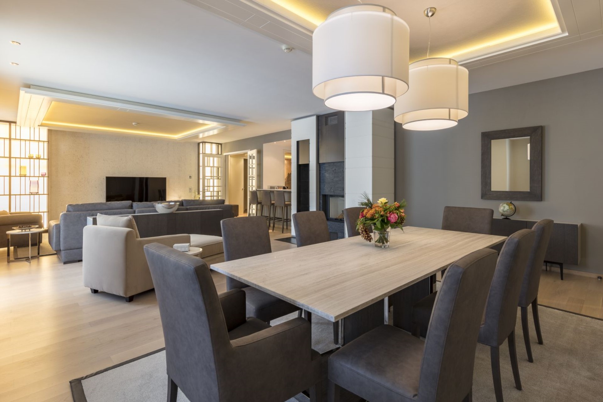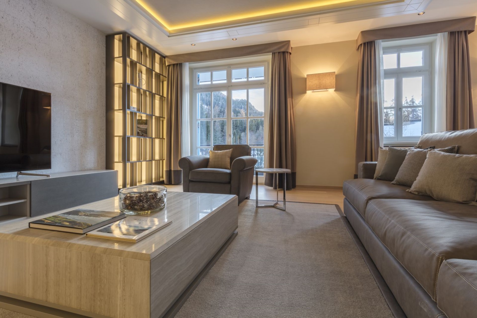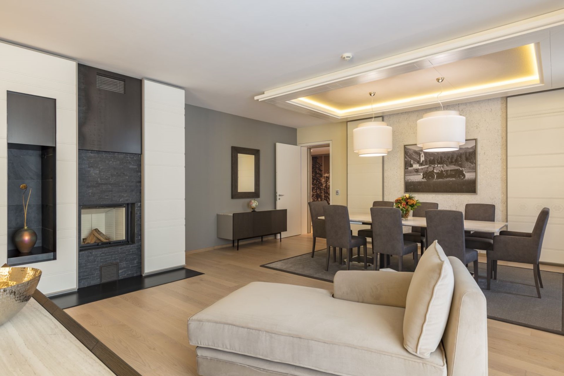 An ultra-luxurious alpine apartment with spacious living areas and balconies with mountain views