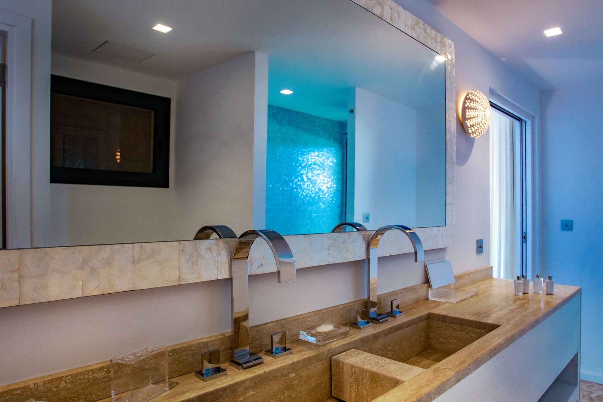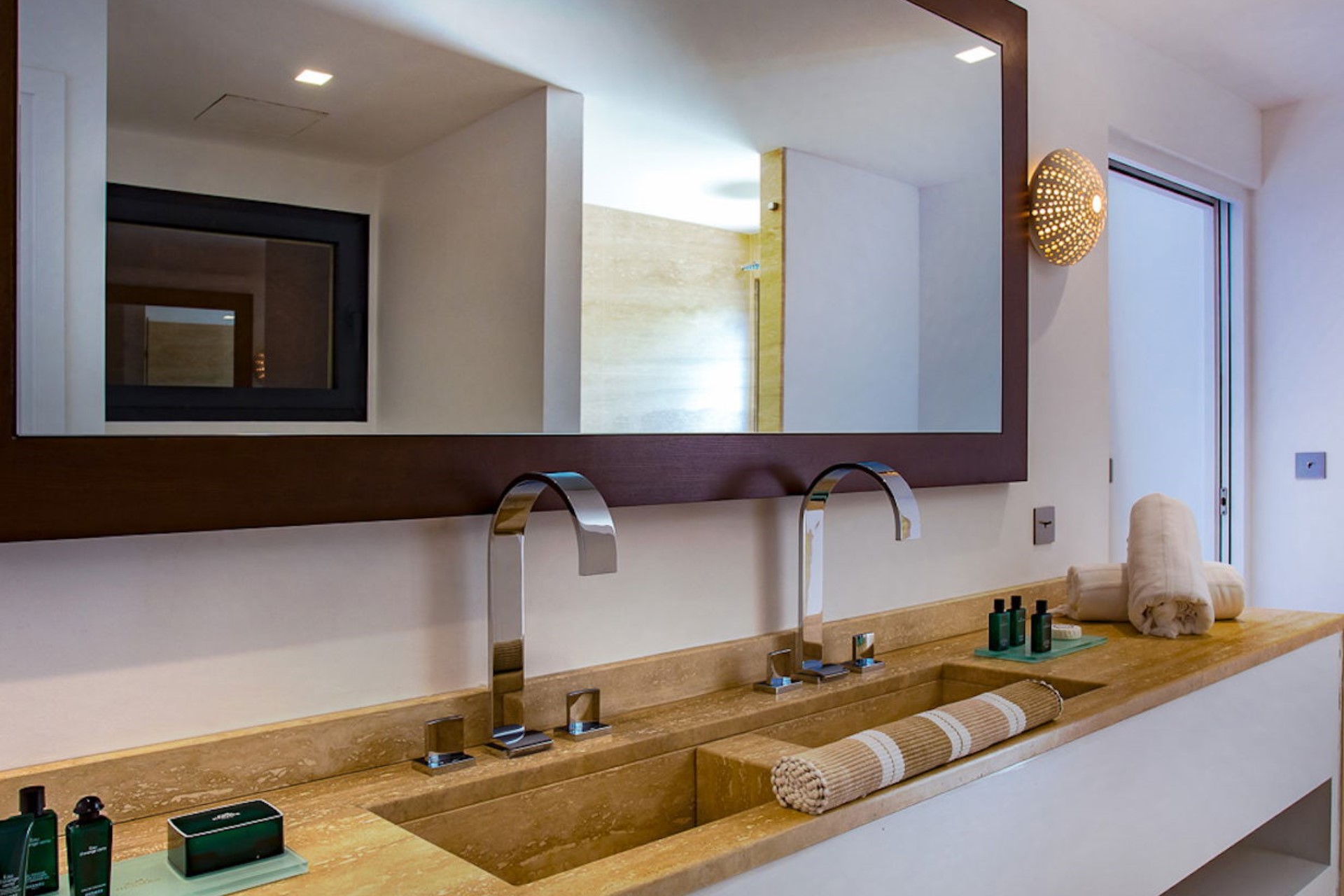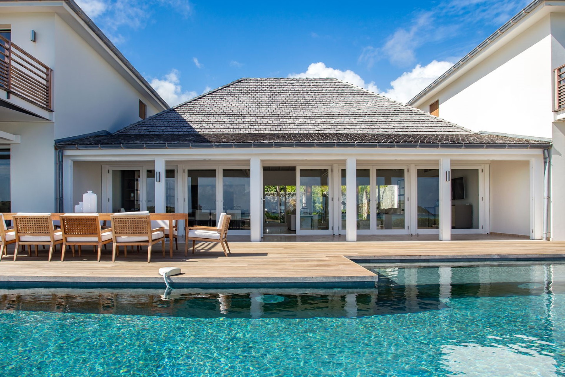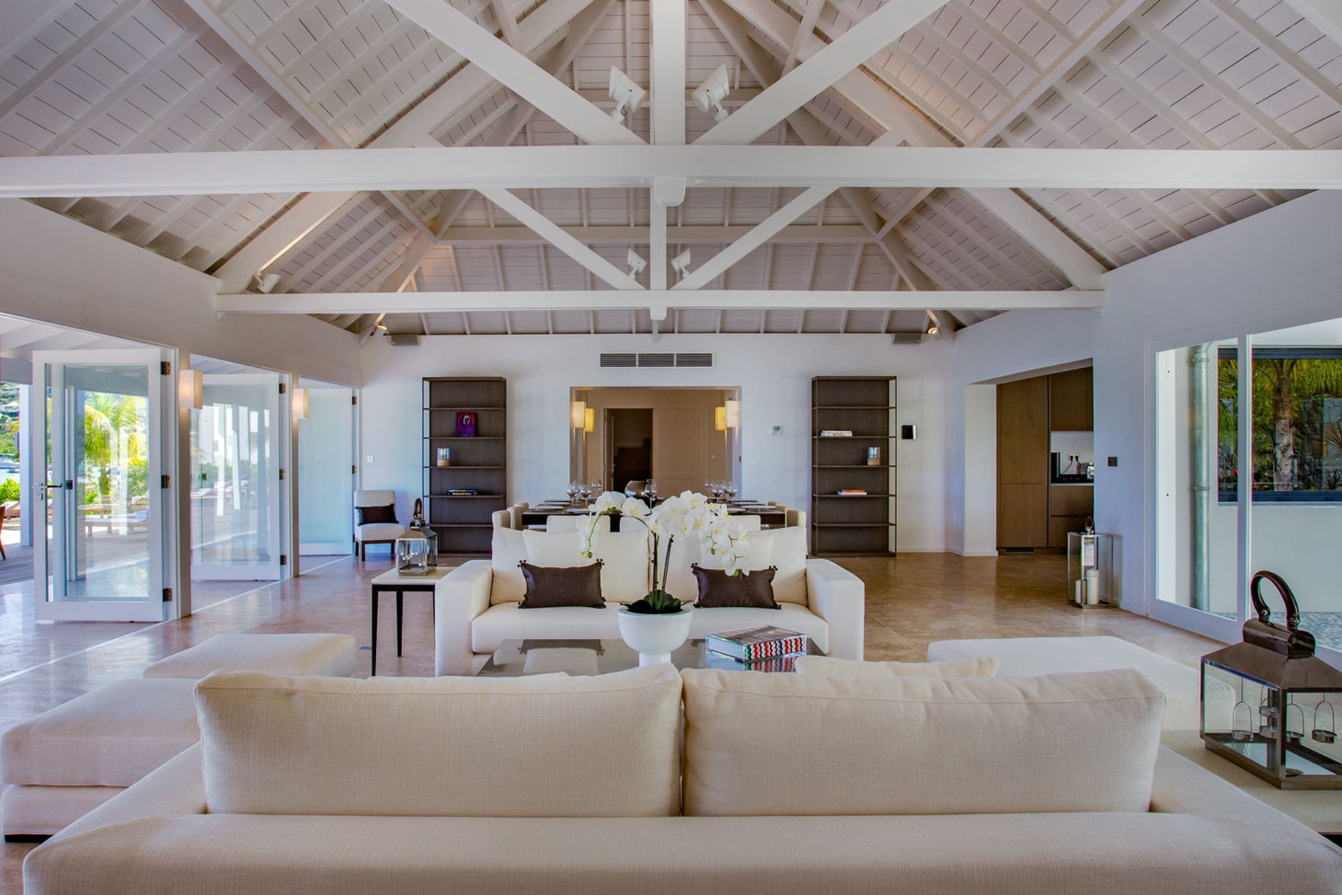 The villa’s design seamlessly integrates indoor and outdoor living, creating a soothing retreat in the heart of paradise. At its centre, the spacious living room boasts plush off-white furnishings and panoramic views of the turquoise lagoon. Large glass doors invite the Caribbean breeze inside, while the adjoining dining area comfortably seats up to 12 guests for elegant meals overlooking the ocean.
