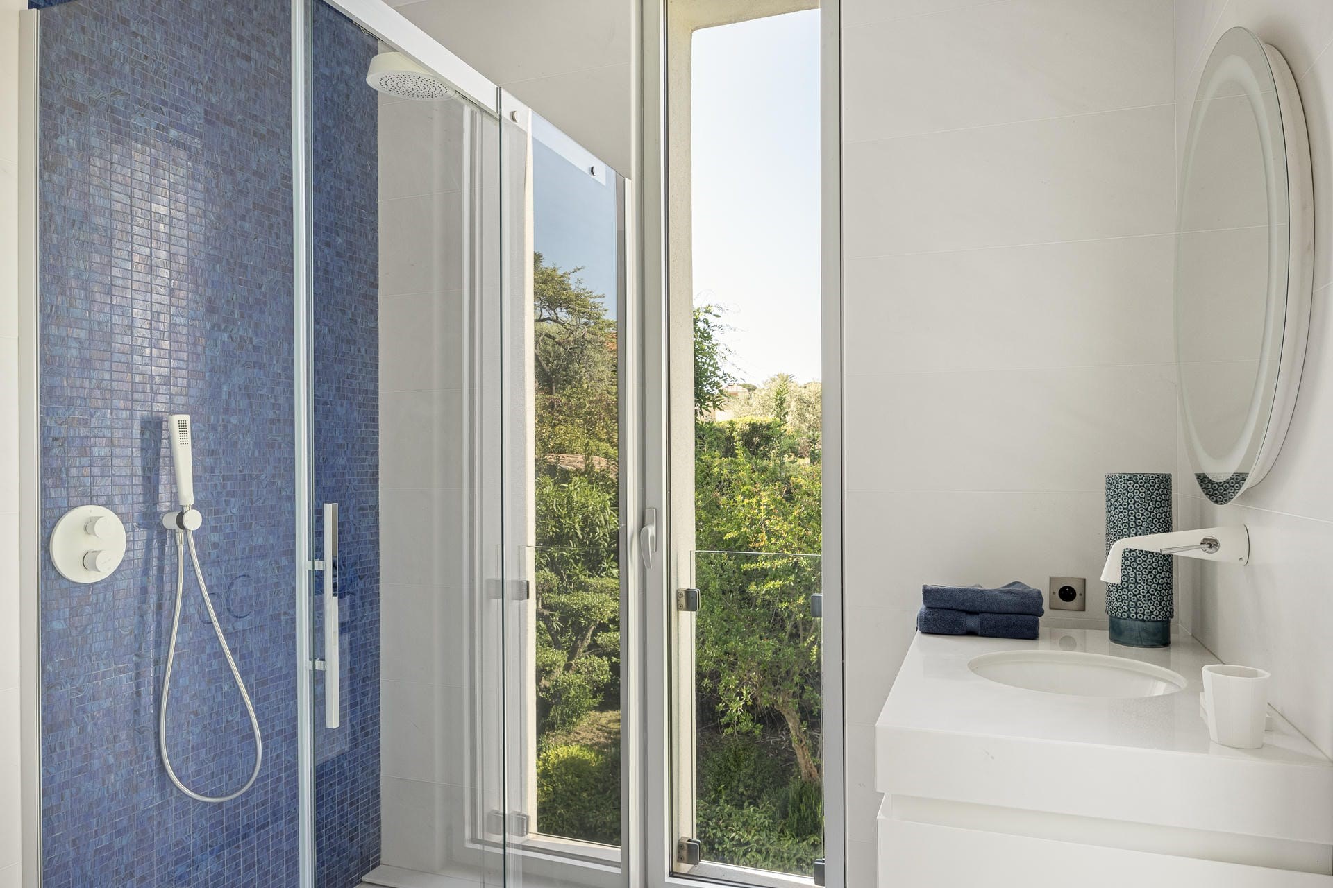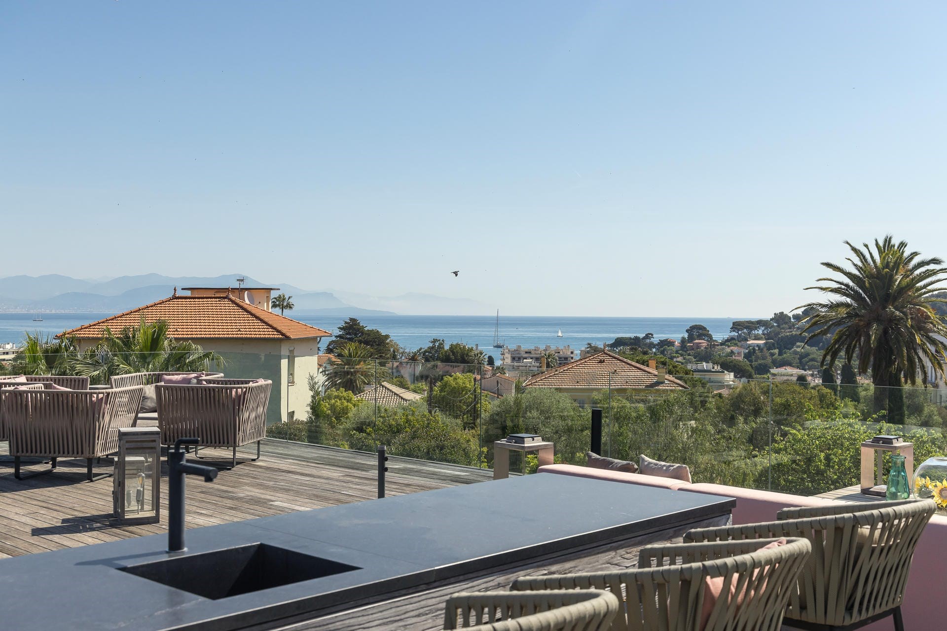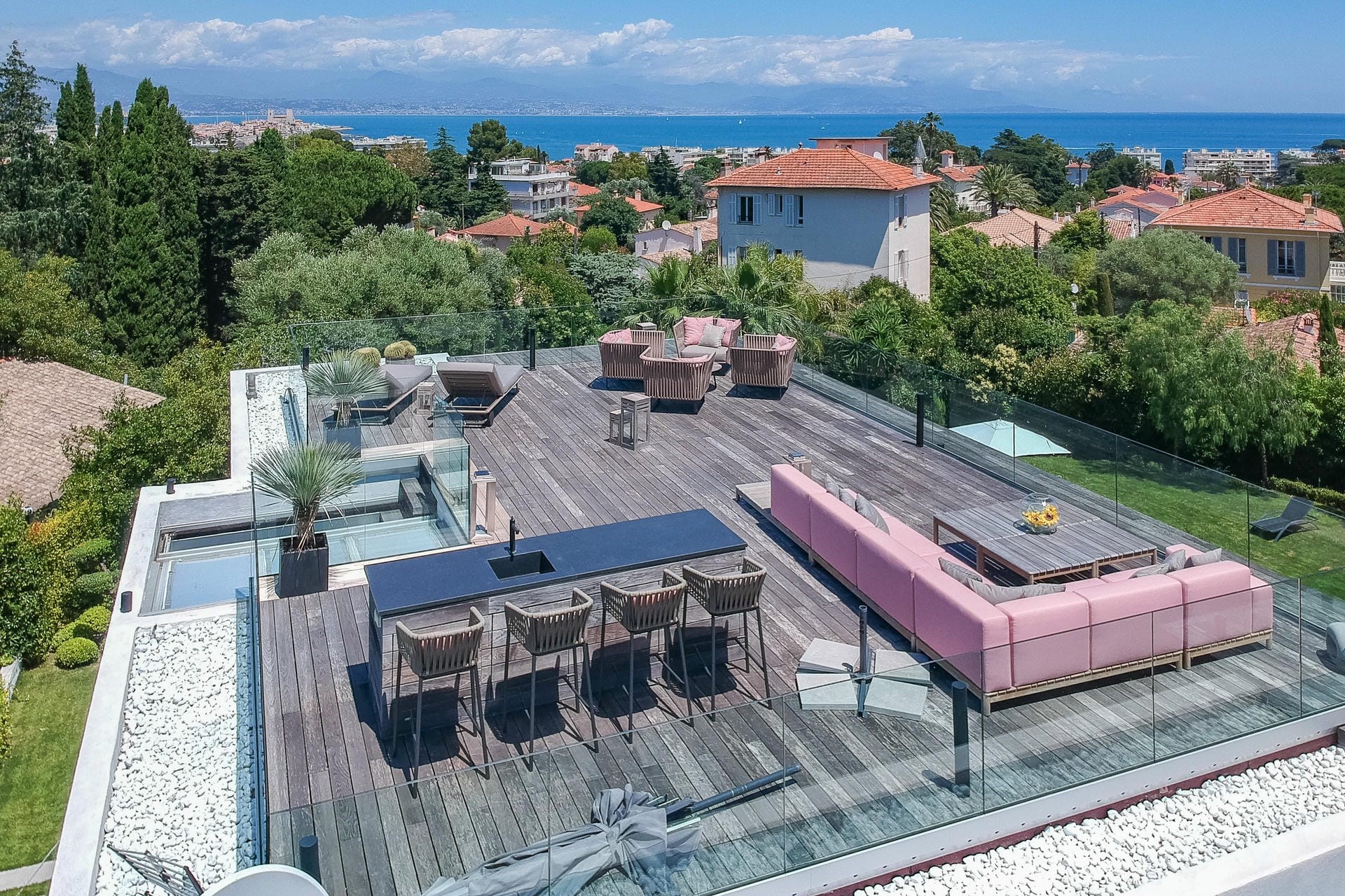 The villa’s standout feature is undoubtedly its vast, 100 square metre roof terrace. Fully furnished with designer pieces including a large corner sofa, armchairs, sun loungers, and a stylish bar, it’s an idyllic setting for relaxing and socialising. This privileged vantage point offers breathtaking panoramic views stretching over the Cap d’Antibes lighthouse, the sparkling Mediterranean Sea, and the snow-capped Alps in the distance.
