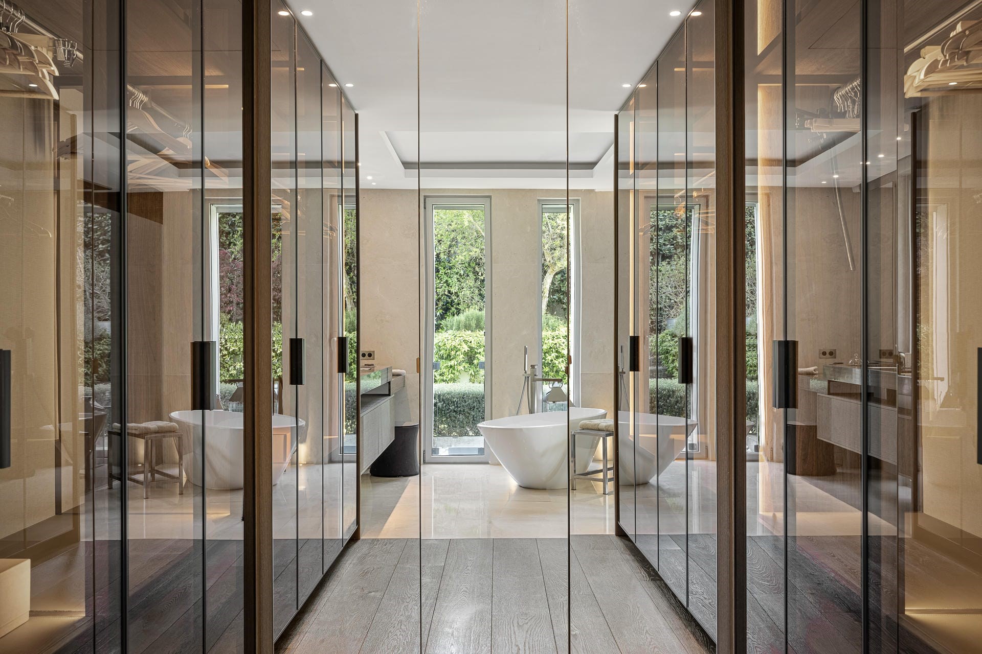 Master Bedroom 1 – super-king-size bed, dressing room, en-suite bathroom with dual vanity, bathtub & separate shower, and direct garden access