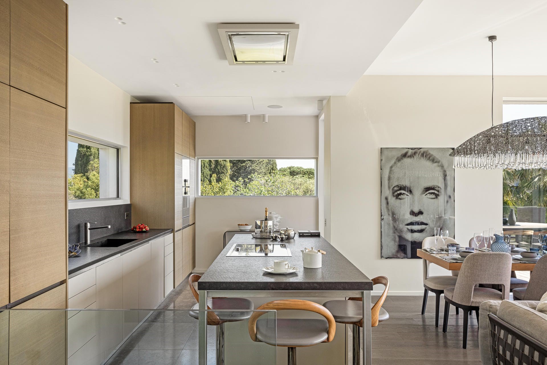 A contemporary stone fountain at the villa’s entrance welcomes guests indoors. Spanning over 330 square metres across three elegantly appointed levels, the villa is a modern masterpiece combining glass, natural stone, and designer furniture. The main living room on the first floor is a bright, open-plan space with a lounge area, an elegant dining table, and a state-of-the-art Gaggenau kitchen, which is a chef’s dream. Retractable glass walls seamlessly merge the expansive indoor space with the outdoors, including an al fresco dining setting with a barbecue, sunshades, and stunning views.