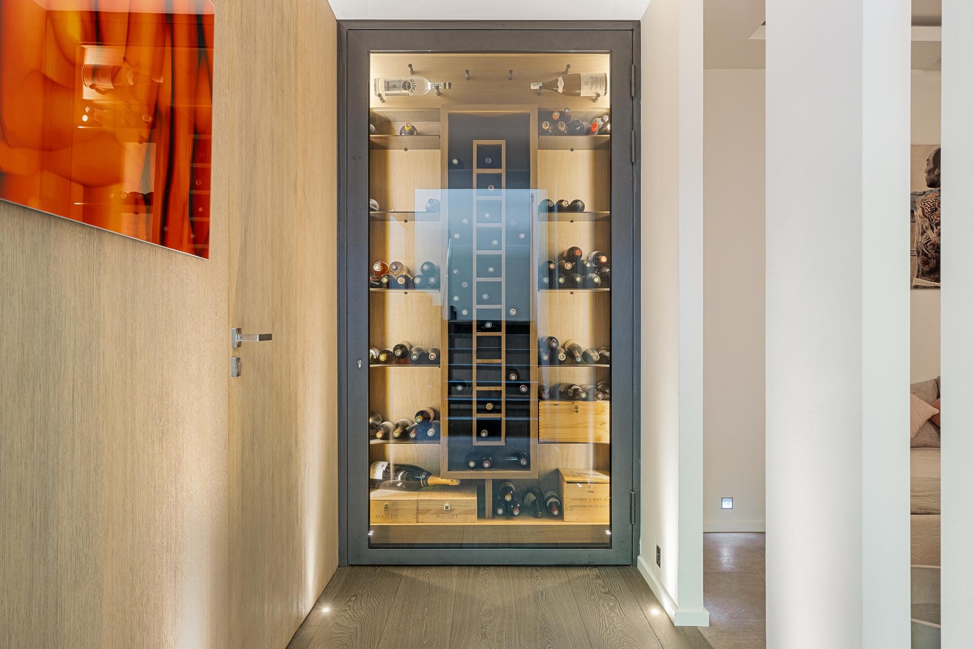 Heading down to the lower ground floor, guests will find a luxurious wellness room with a beautiful glass sauna, a stone shower, and a relaxation area. There is also a piano area for the musically inclined, a convenient second kitchen, and a private cellar for wine connoisseurs to peruse.