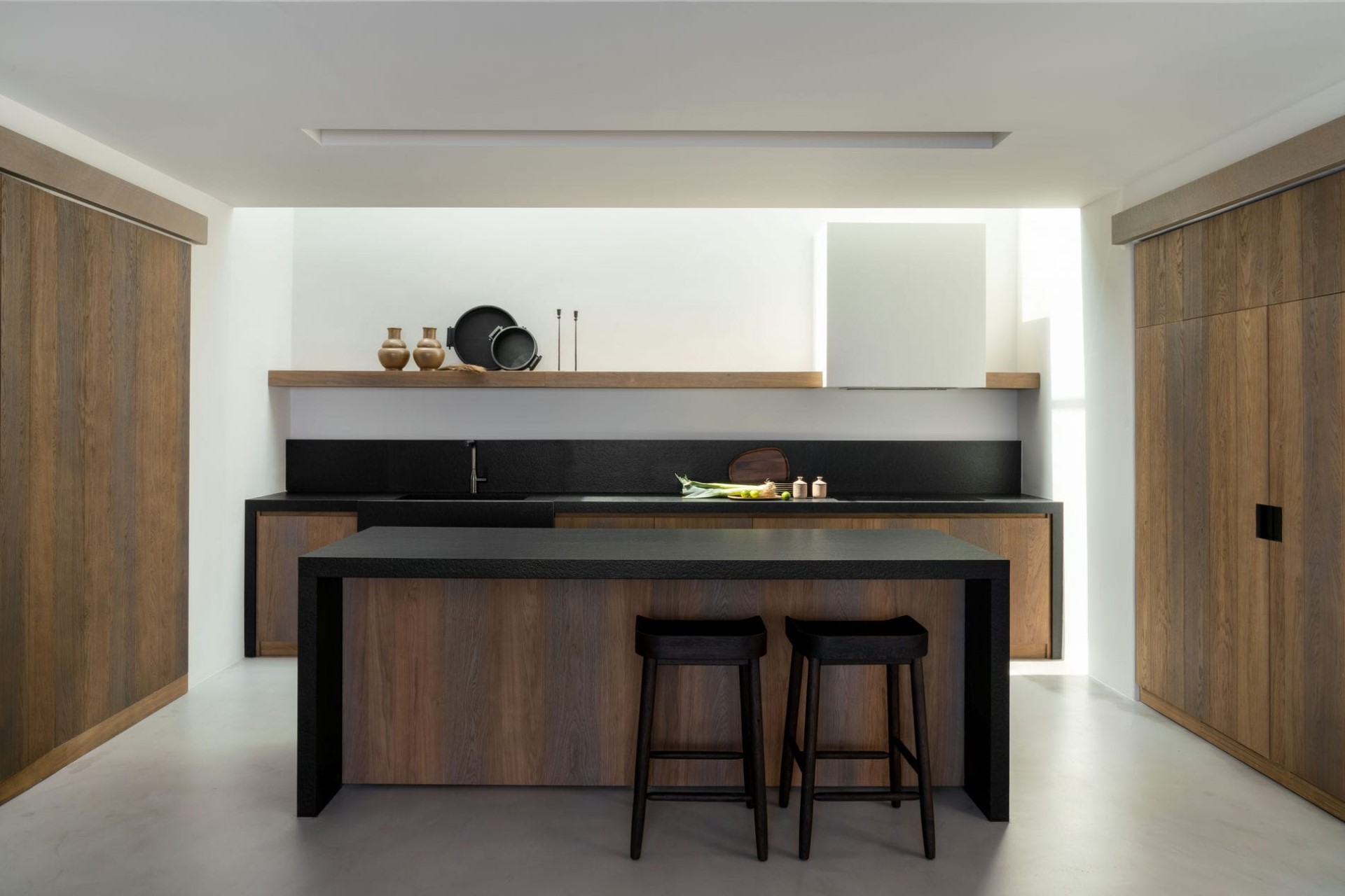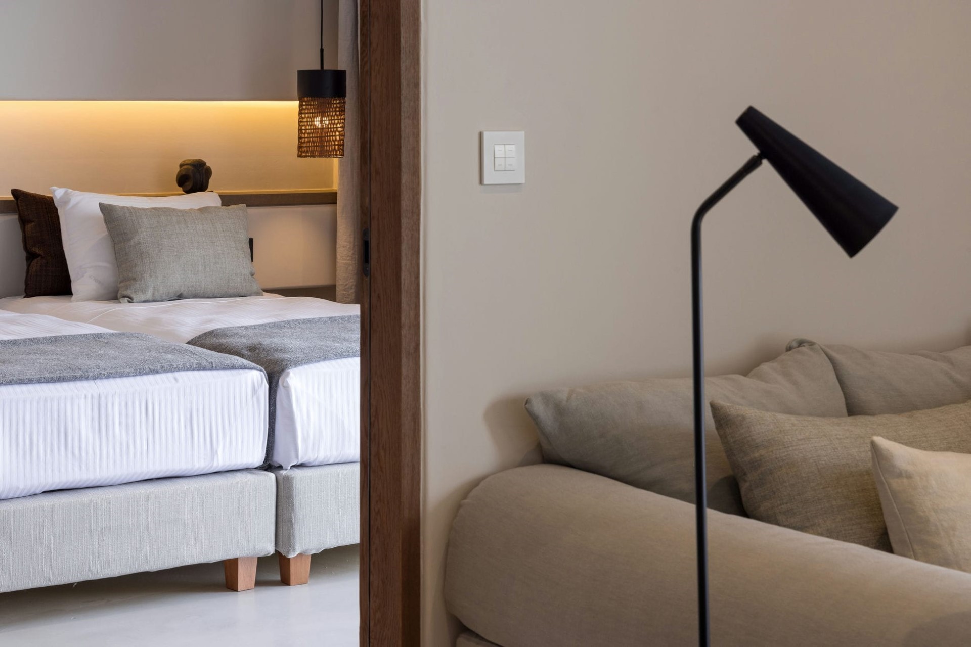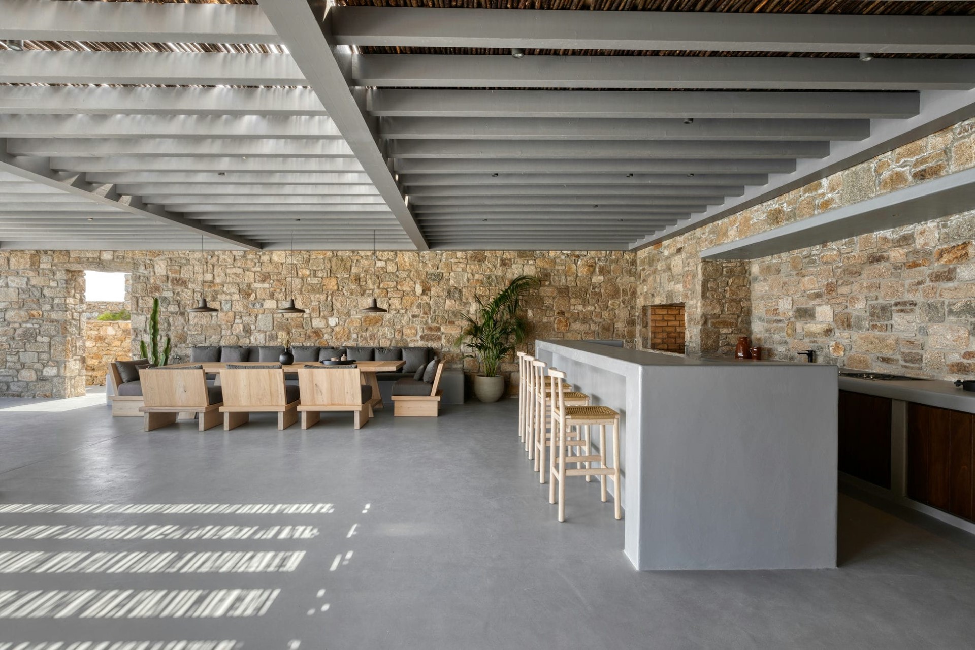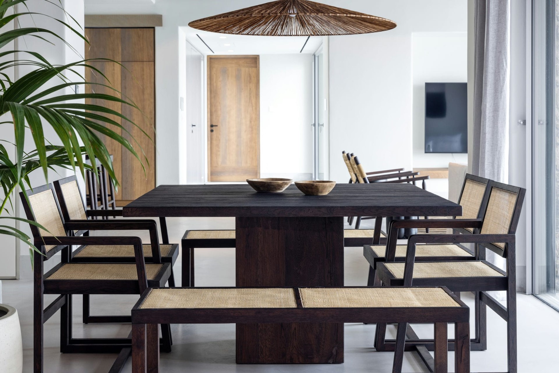 Inside the villa, natural materials such as solid wood, bamboo, linen, and exposed stone complement each room’s clean, white, and modern design. The open-plan kitchen, living, and dining space opens to the outdoor area, making the transition from indoor to outdoor living feel seamless.