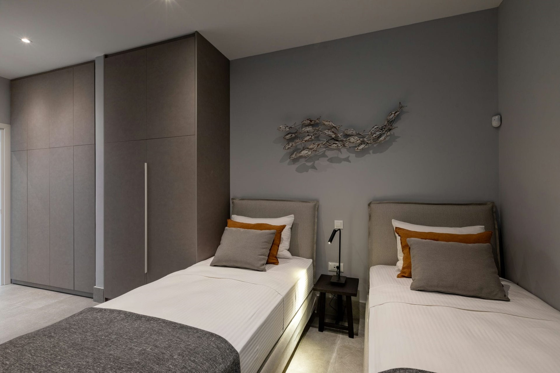 Suite 2 – twin beds (converted to queen-size on request), en-suite bathroom with shower, terrace access, and sea views