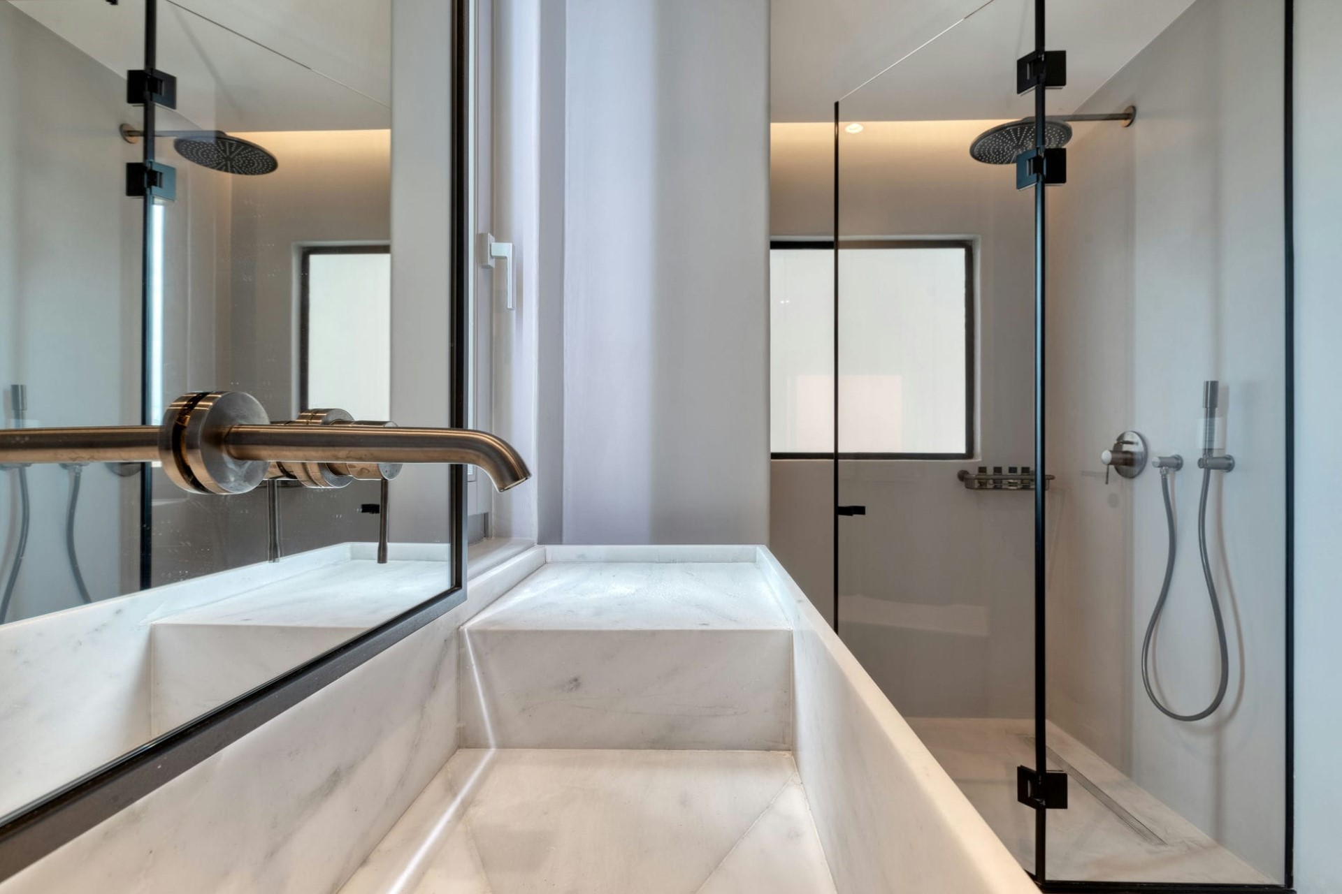 Master Suite – queen-size bed, en-suite bathroom with dual vanity, bathtub & separate shower, private terrace, and sea views