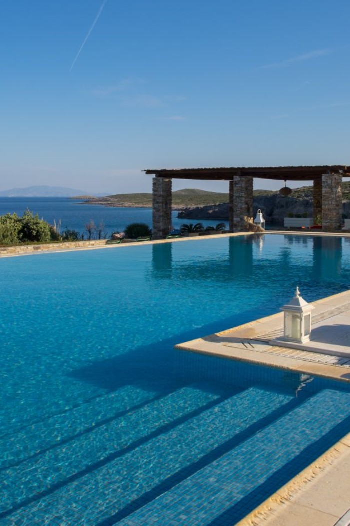Villa Astir is a luxurious four-bedroom villa with a swimming pool and large terraces overlooking Soros Beach on the island of Antiparos.