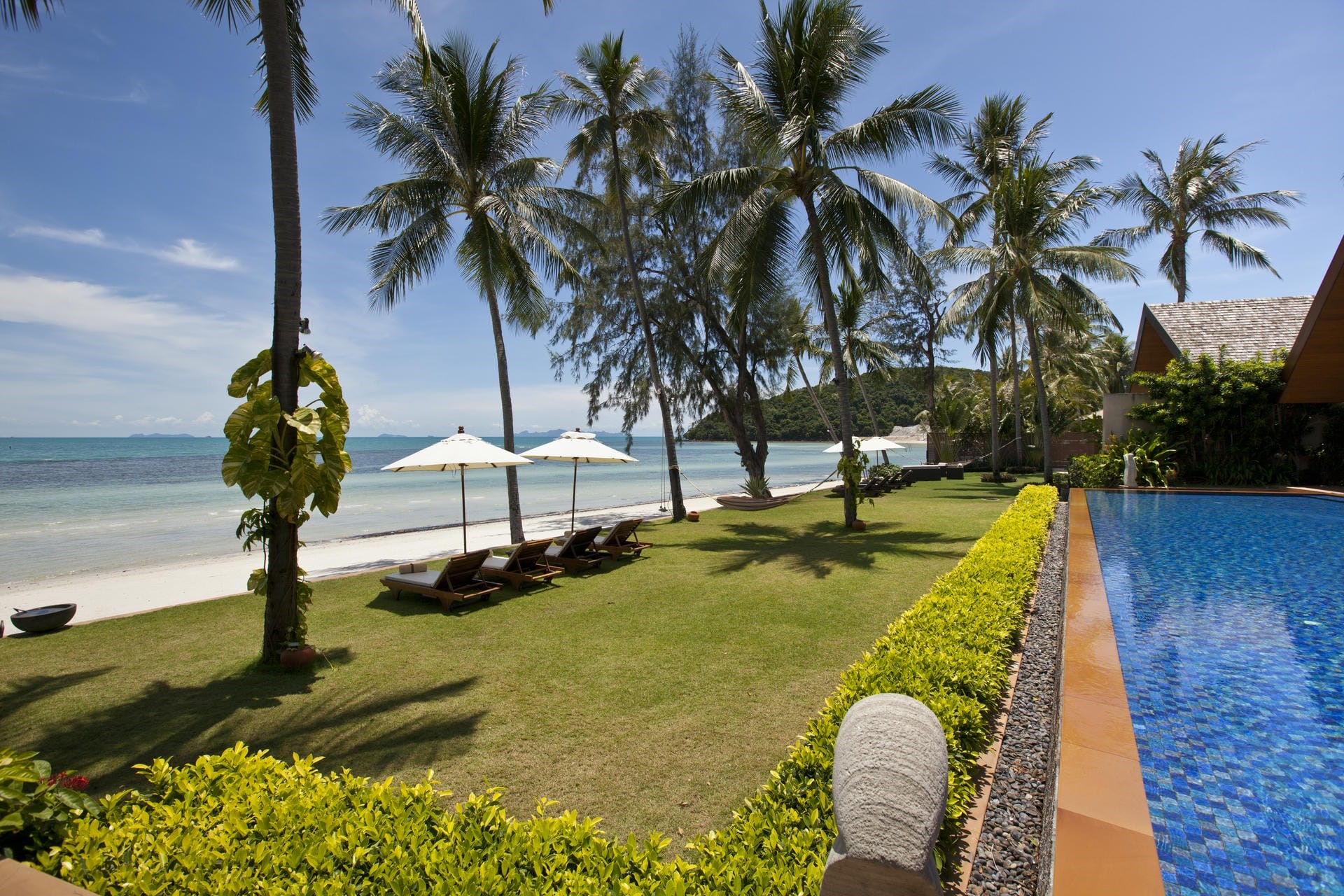 A beachfront villa offering luxury for all ages with everything from a swim-up bar to a children’s playground