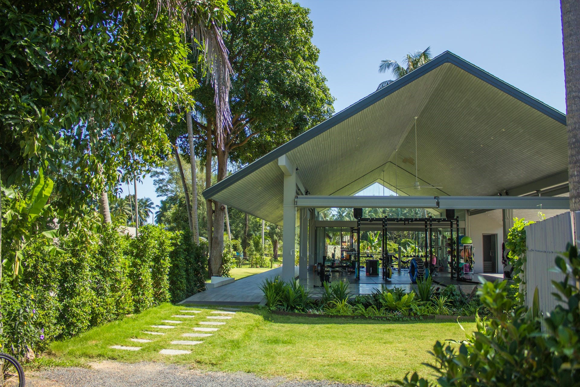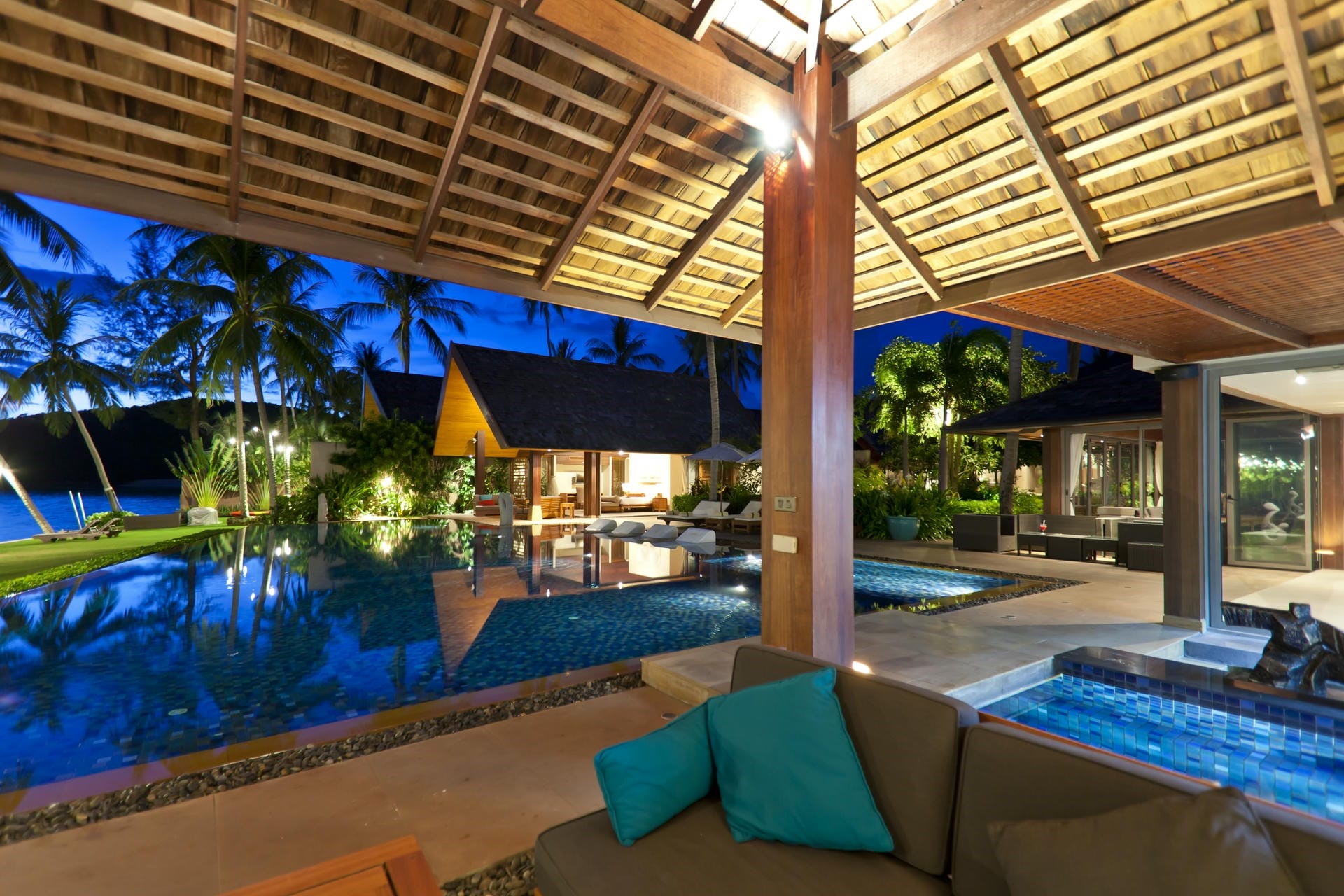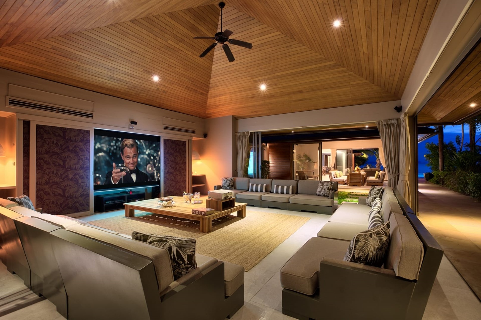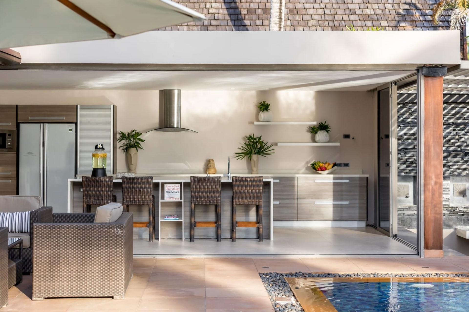 The property boasts a stunning 22-metre infinity pool stretching parallel to the beach. Surrounded by lush tropical landscaping, the pool offers a refreshing oasis with uninterrupted views of the turquoise waters and picturesque sunsets. Sun loungers line the pool edge, both in and out of the water, providing the perfect setting for soaking up the rays. Beside the main pool is a smaller plunge pool with a swim-up bar where guests can enjoy a drink or even an outdoor movie on the pull-down projector screen.