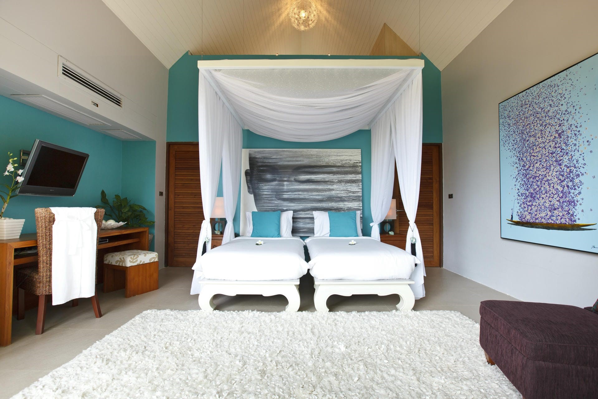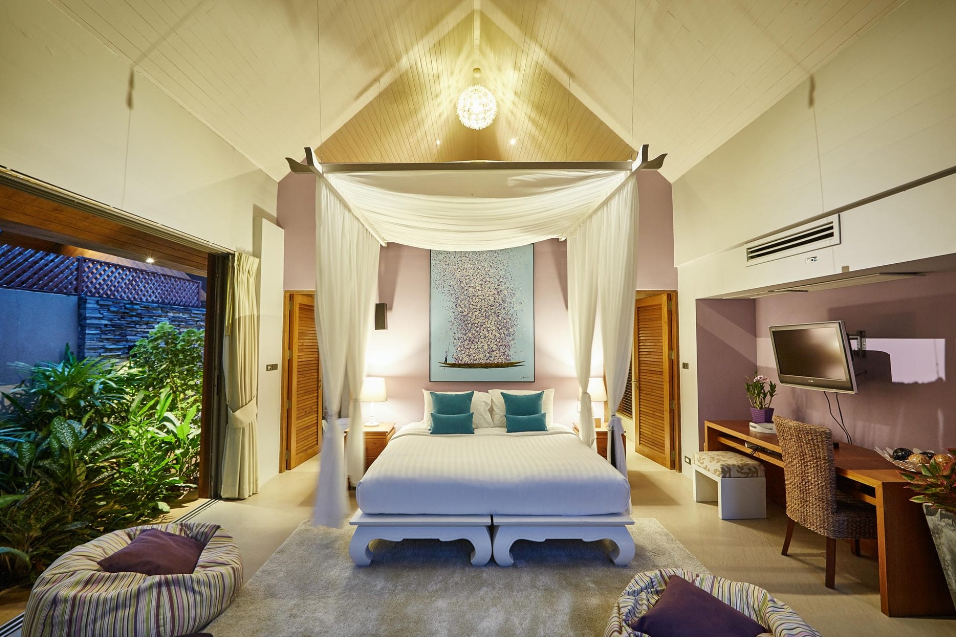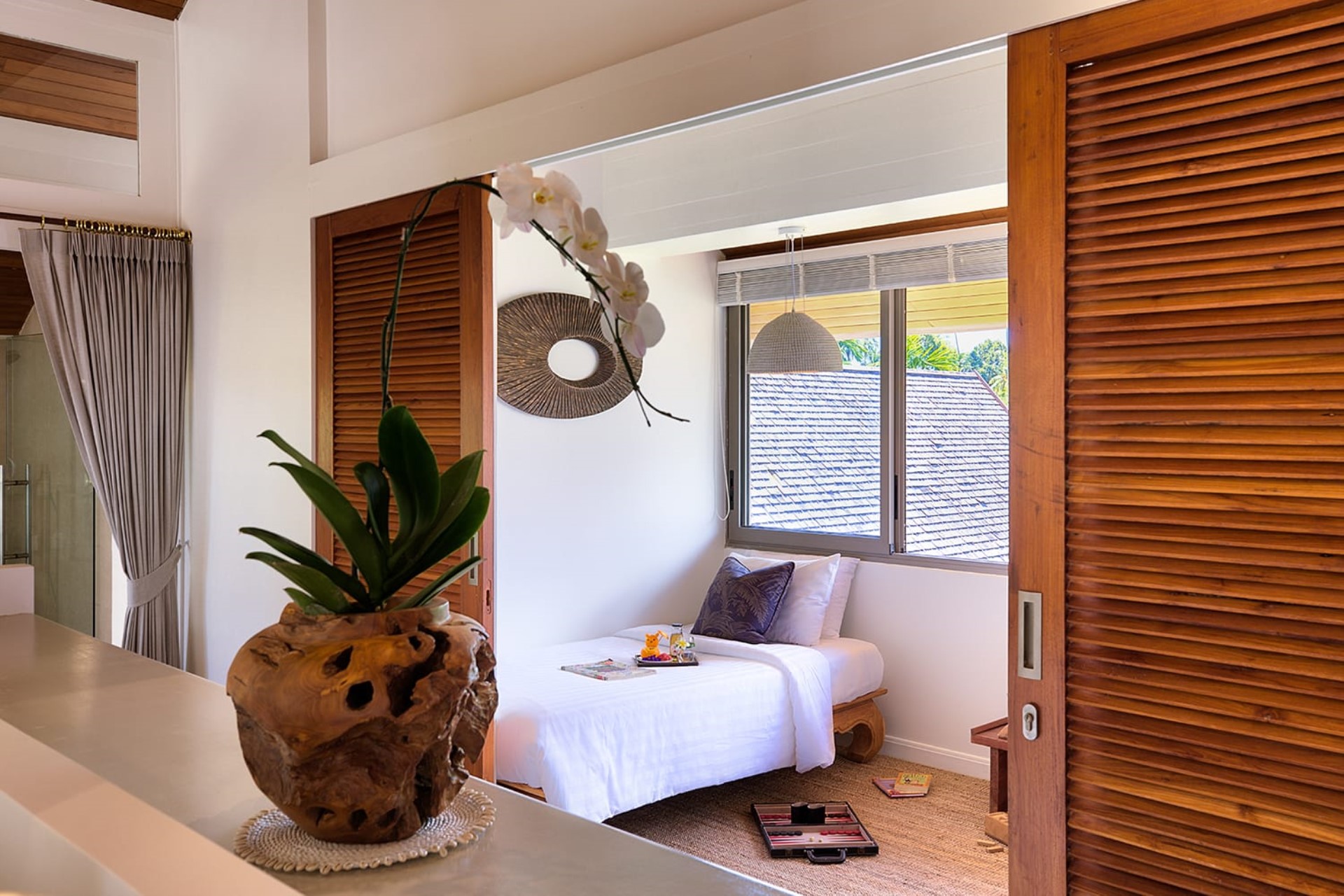 Lily Pond Suite 6 (Children's Bedroom) – twin beds + sofa bed, en-suite bathroom with dual vanity & shower + outdoor shower, terrace access, and garden views