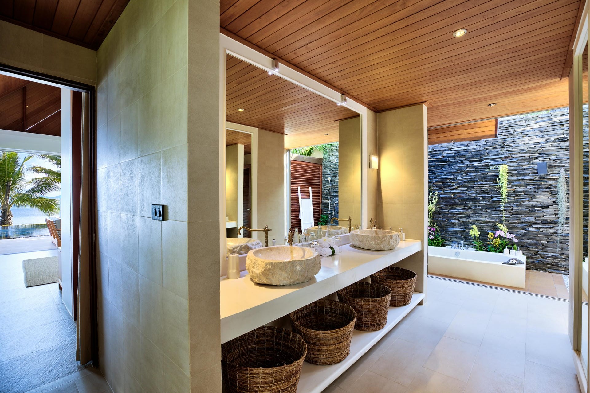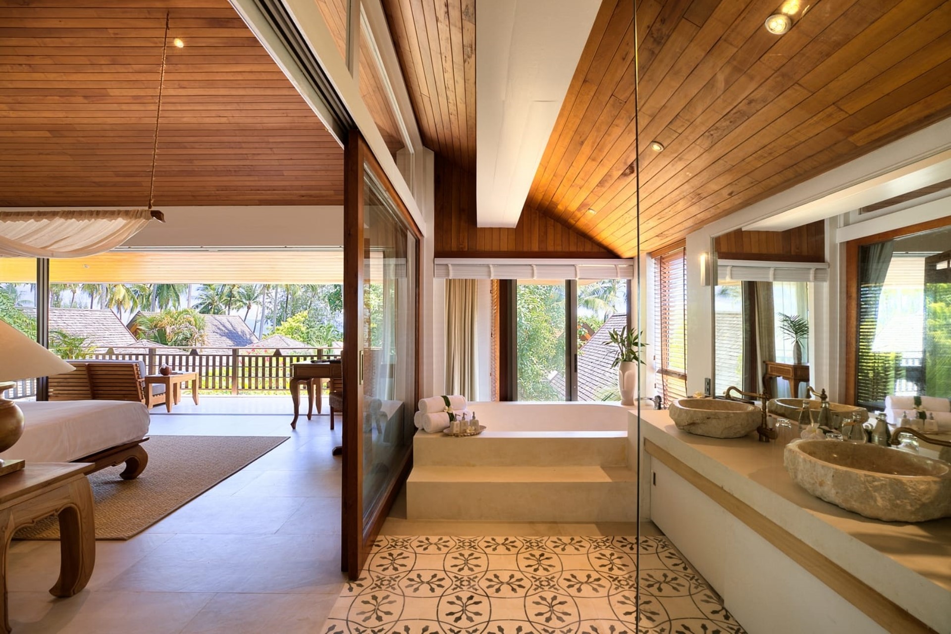 Mezzanine Suite 4 – king-size bed (converted to twins on request) + mezzanine bedroom with twin beds (converted to one king-size on request), shared en-suite bathroom with dual vanity, bathtub & separate shower + outdoor shower, terrace access, and garden views