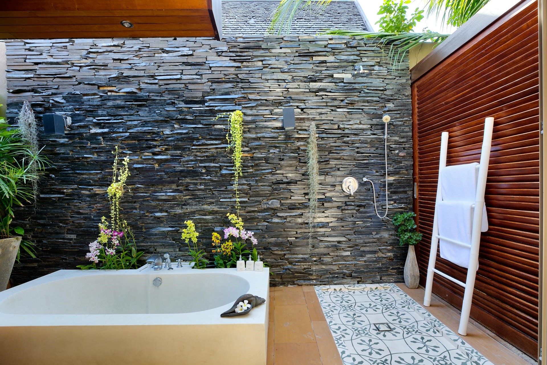 Mezzanine Suite 5 – king-size bed (converted to twins on request) + mezzanine bedroom with twin beds (converted to one king-size on request), shared en-suite bathroom with dual vanity, bathtub & separate shower + outdoor shower, terrace access, and garden views