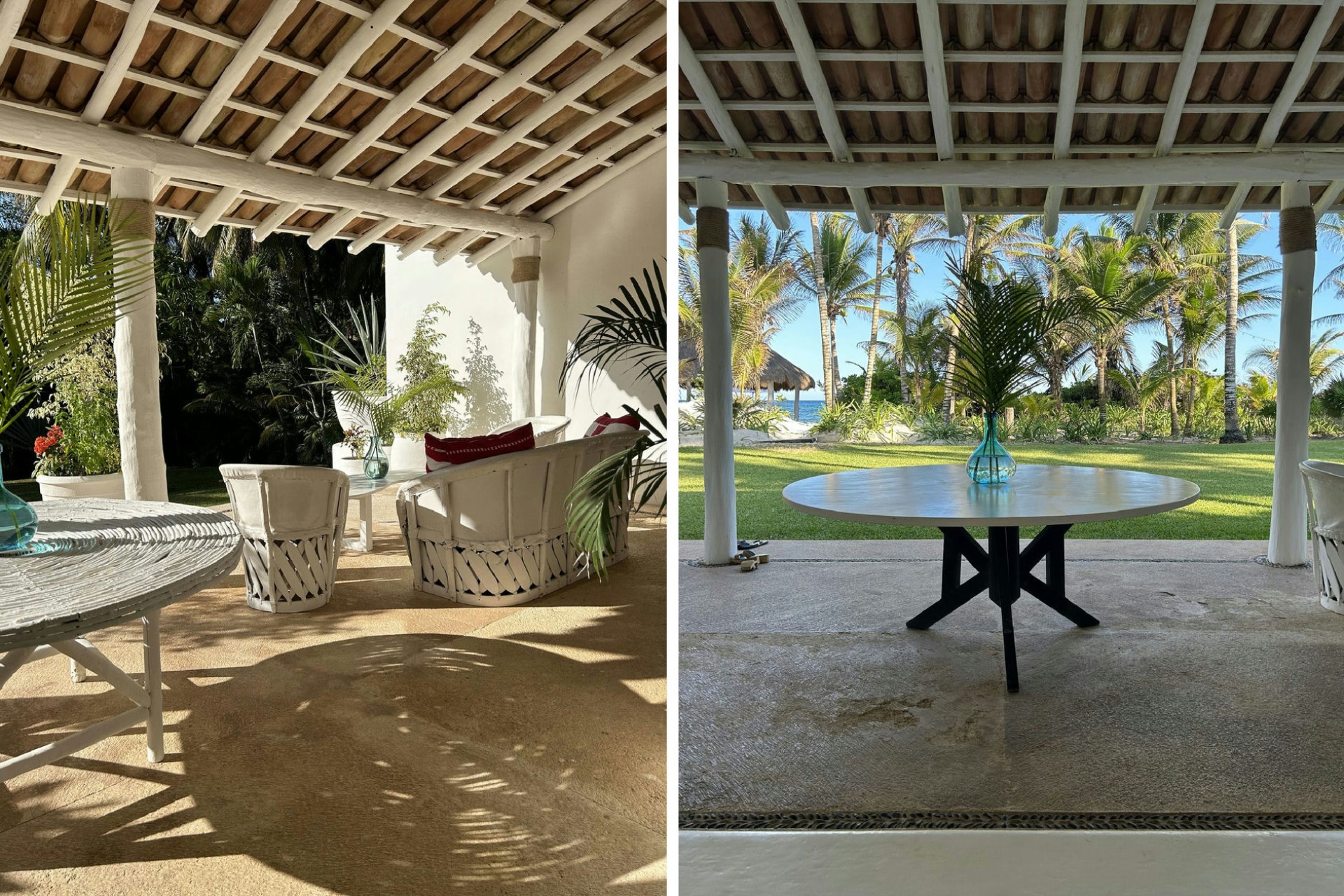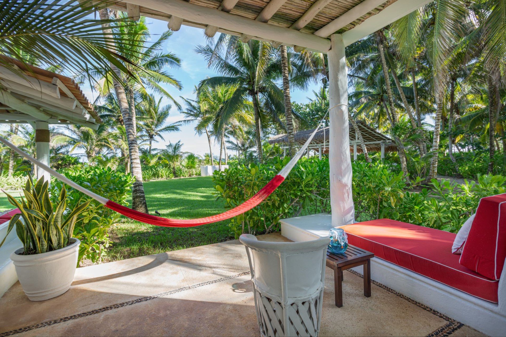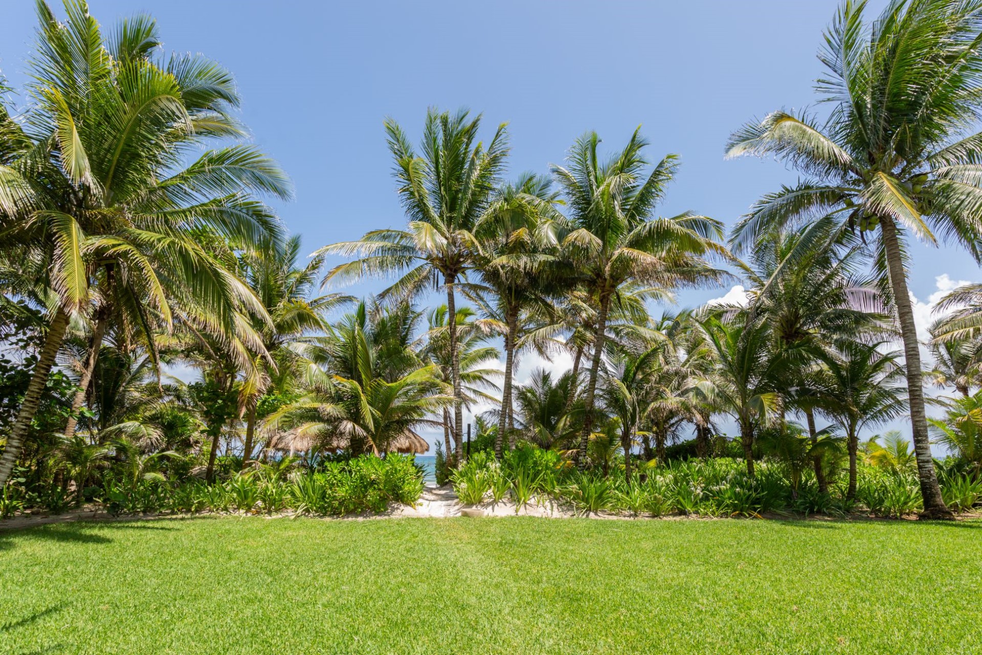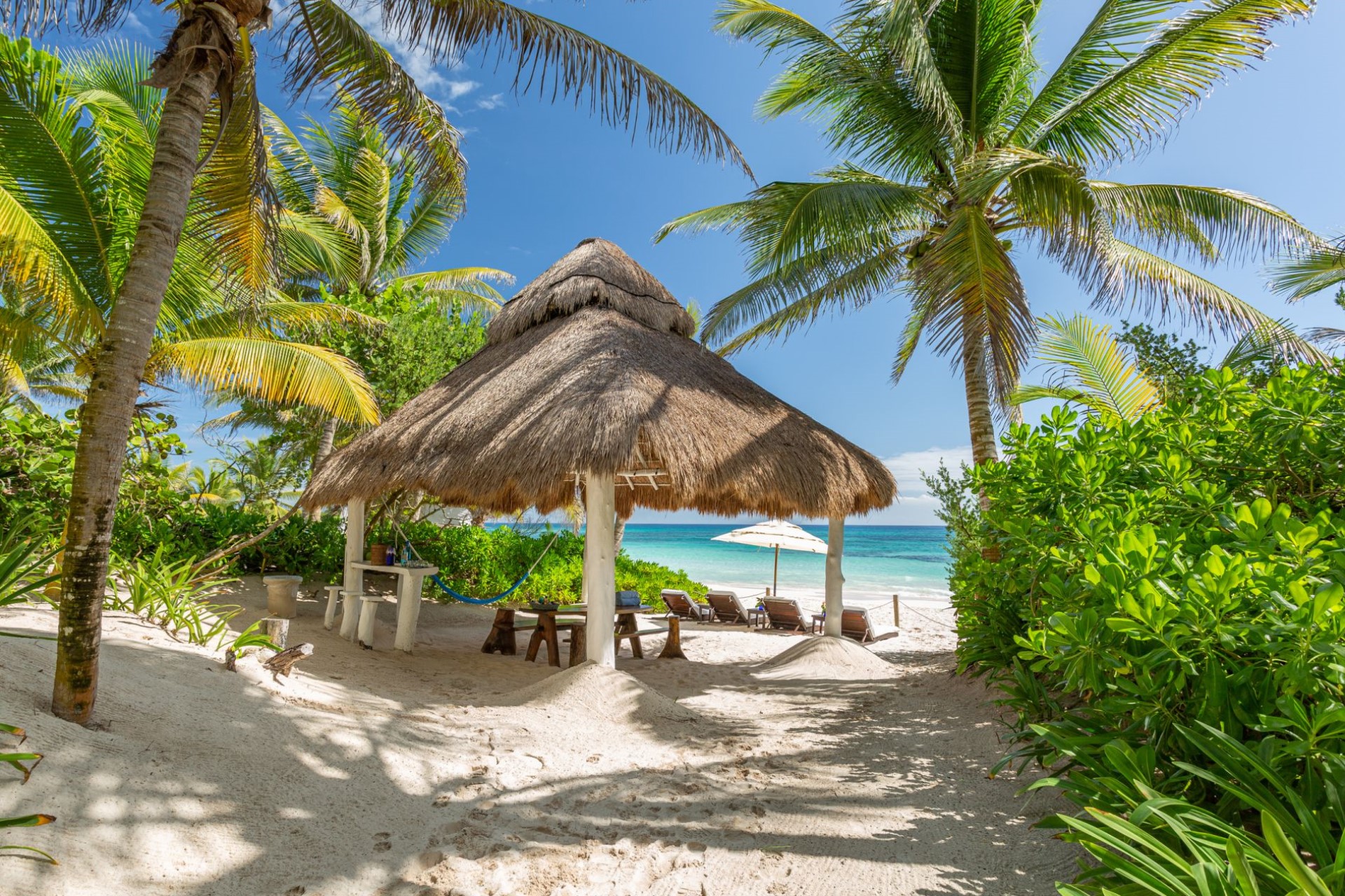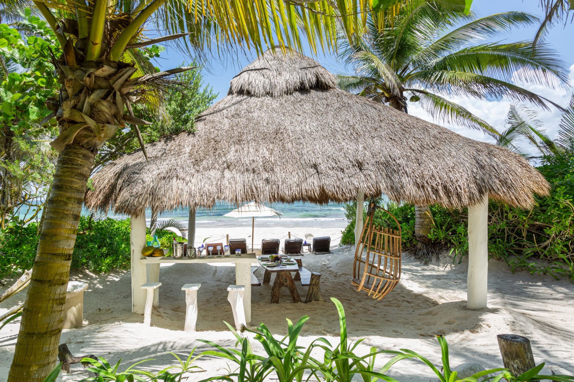 The villa is located on Xpu-Ha Beach, a beautiful white-sand beach with turquoise waters. Guests can enjoy a private section of beach with sun loungers and a shady palapa surrounded by palm trees and sea grapes, ideal for seaside picnics or evening drinks.