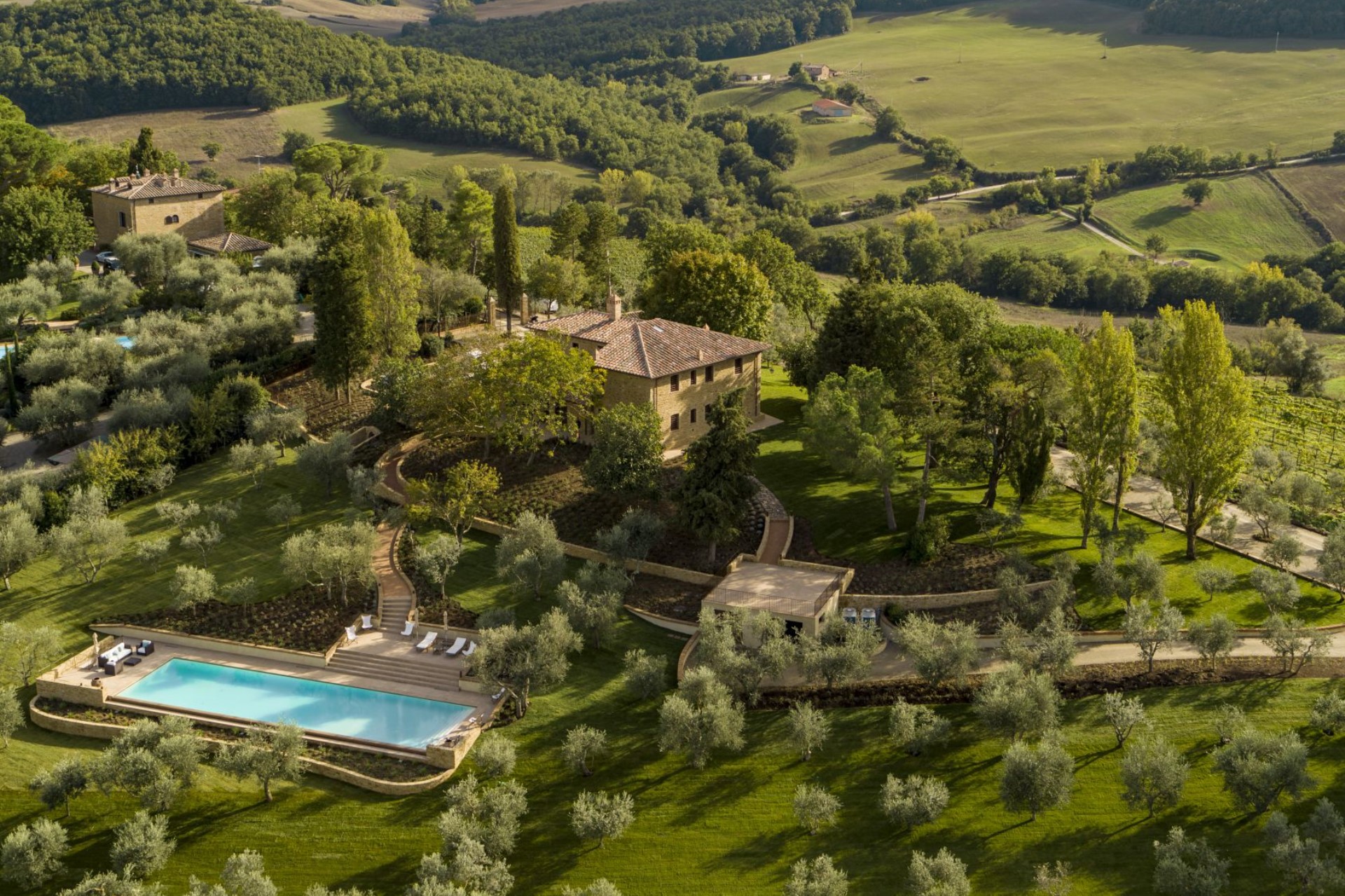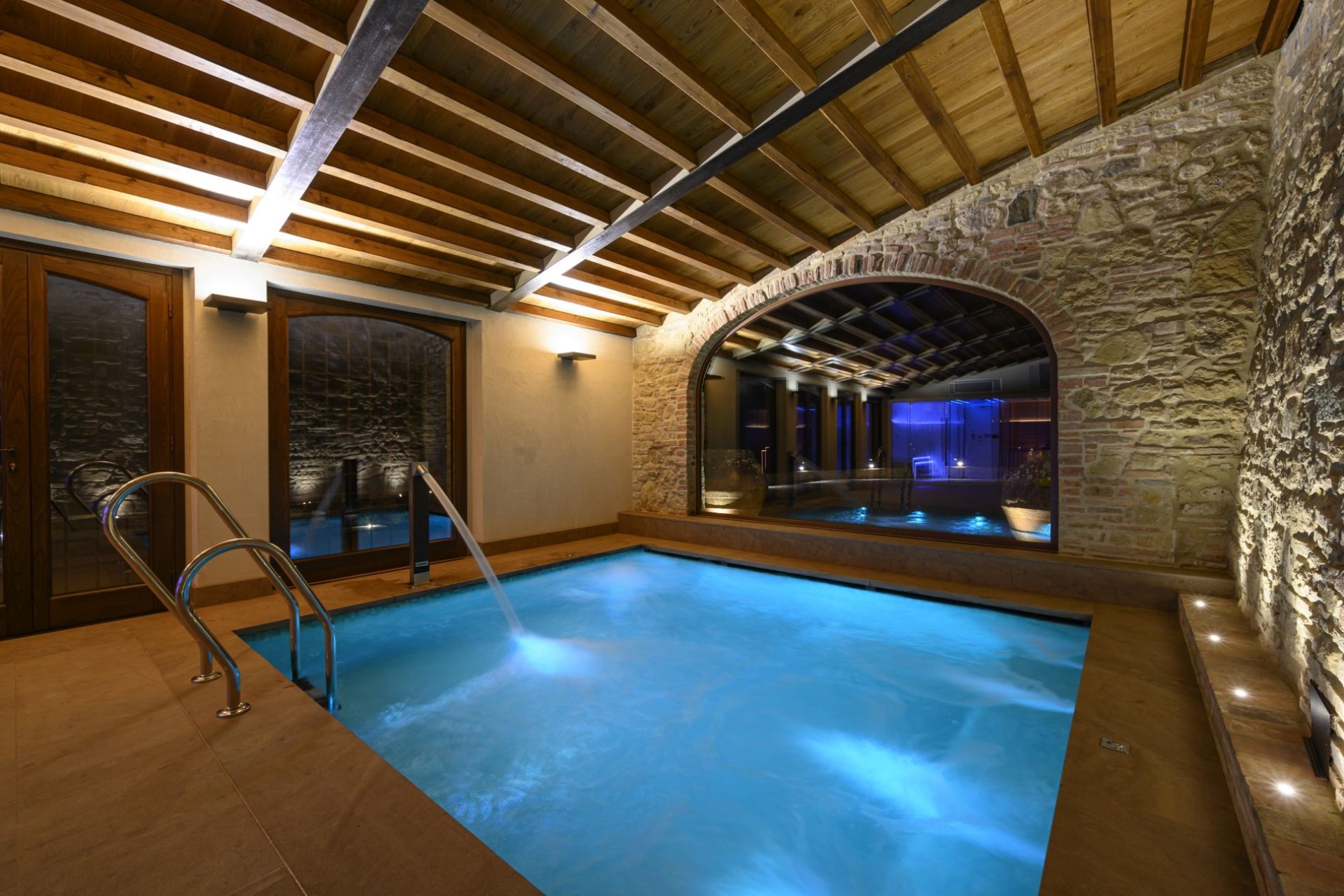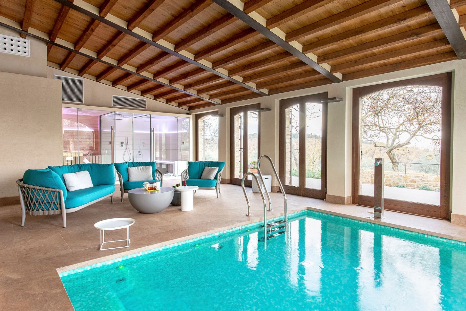 Luxurious villa in the Tuscan countryside, featuring a swimming pool and indoor spa