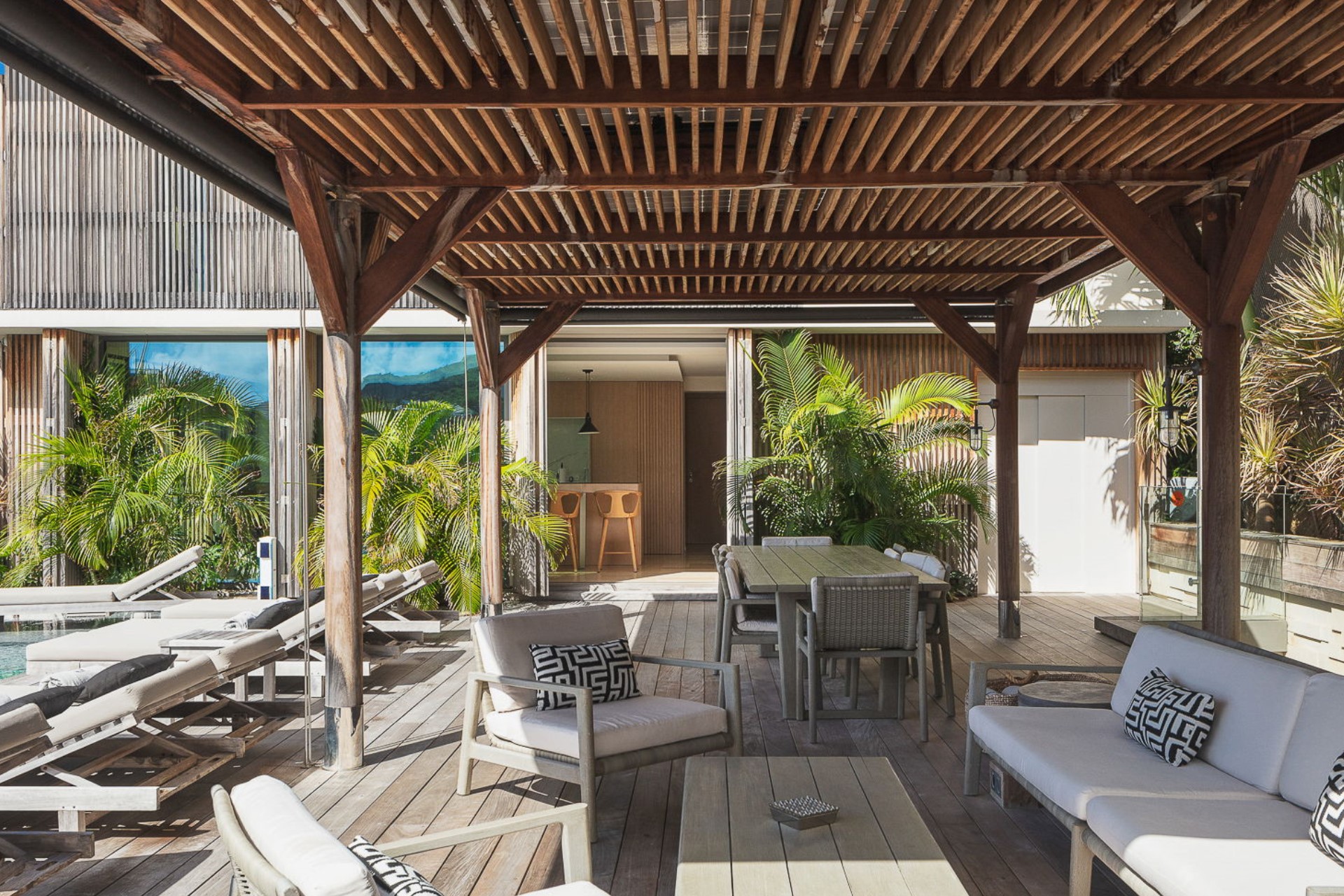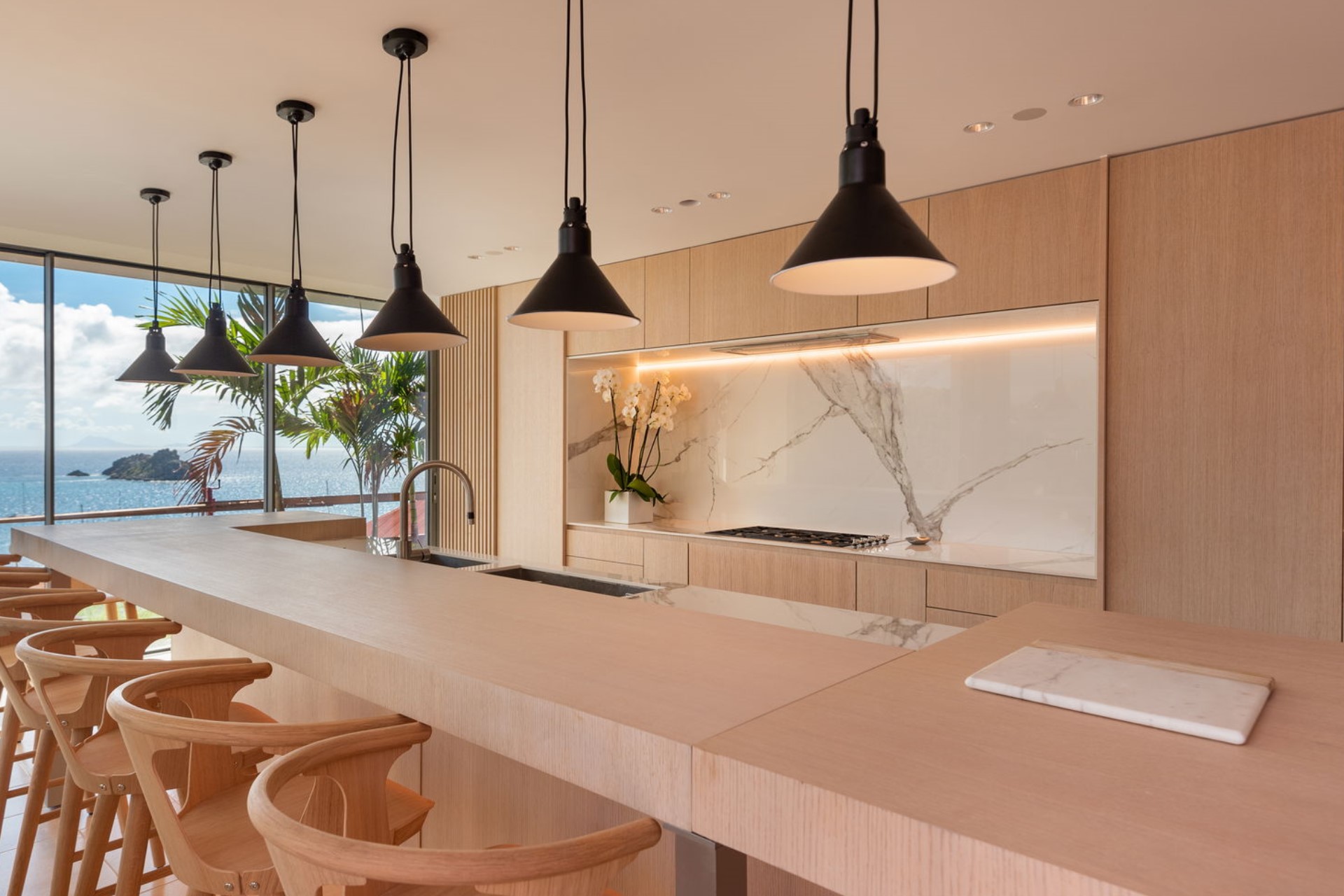 Additional outdoor features include expansive terraces and landscaped gardens, offering serene spaces to unwind while taking in the spectacular surroundings. Every detail of the exterior is designed to harmonise with the natural beauty of the island.
