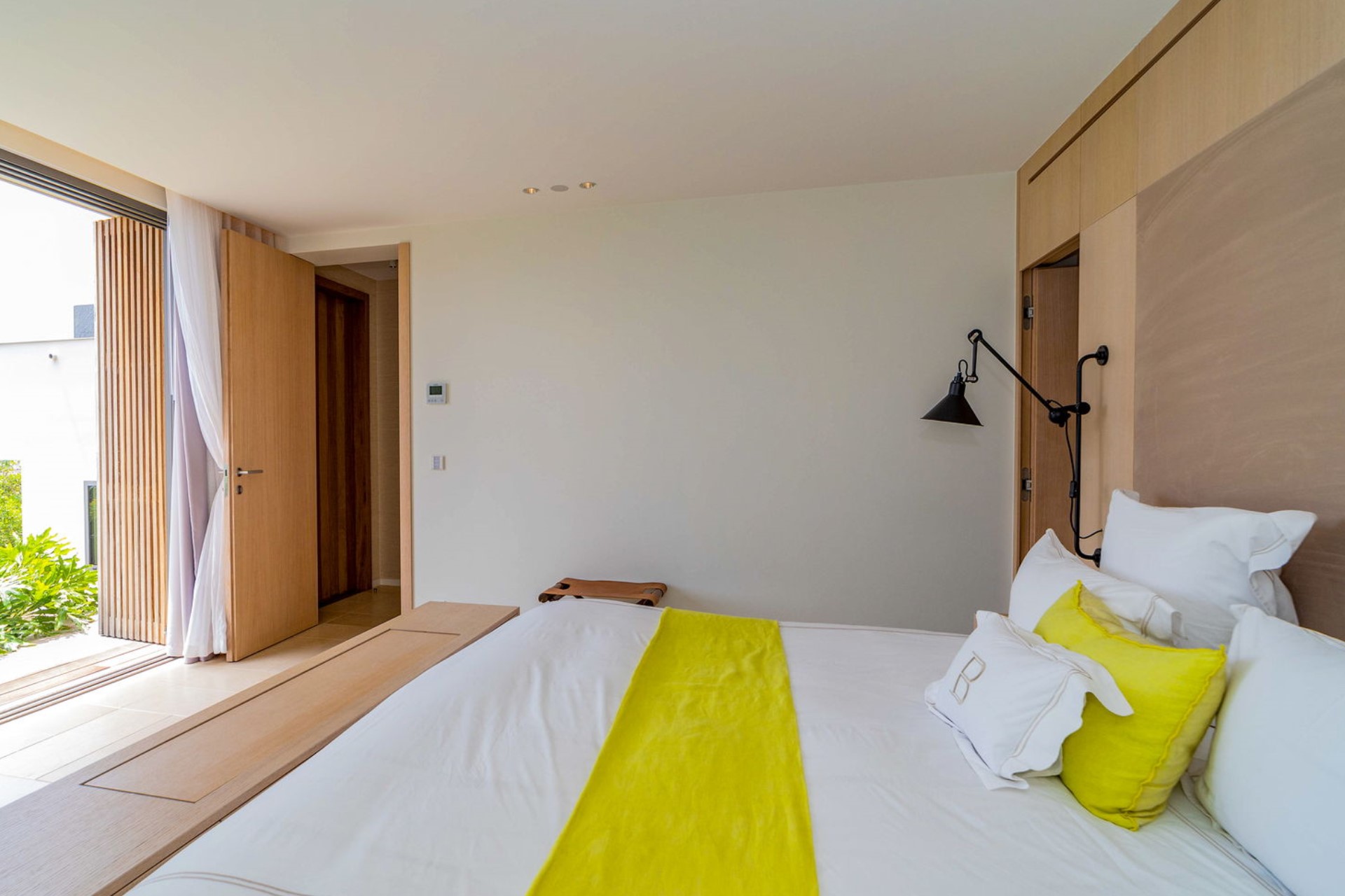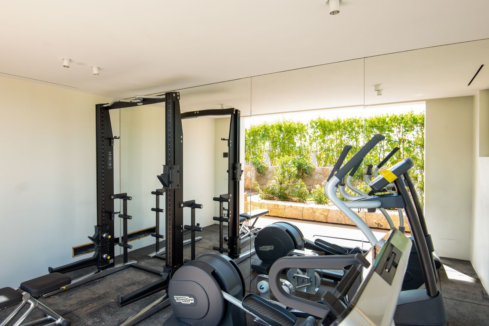 Indoors, the minimalist décor emphasizes bright tones and natural light, creating a calm and inviting ambiance. The air-conditioned living room offers plush sofas and high-tech entertainment, including HD TV, Apple TV, and a Sonos sound system. The kitchen is equipped with state-of-the-art appliances and a breakfast bar for casual meals, while the fully equipped fitness room provides a treadmill, elliptical, and weight training equipment to cater to wellness enthusiasts.