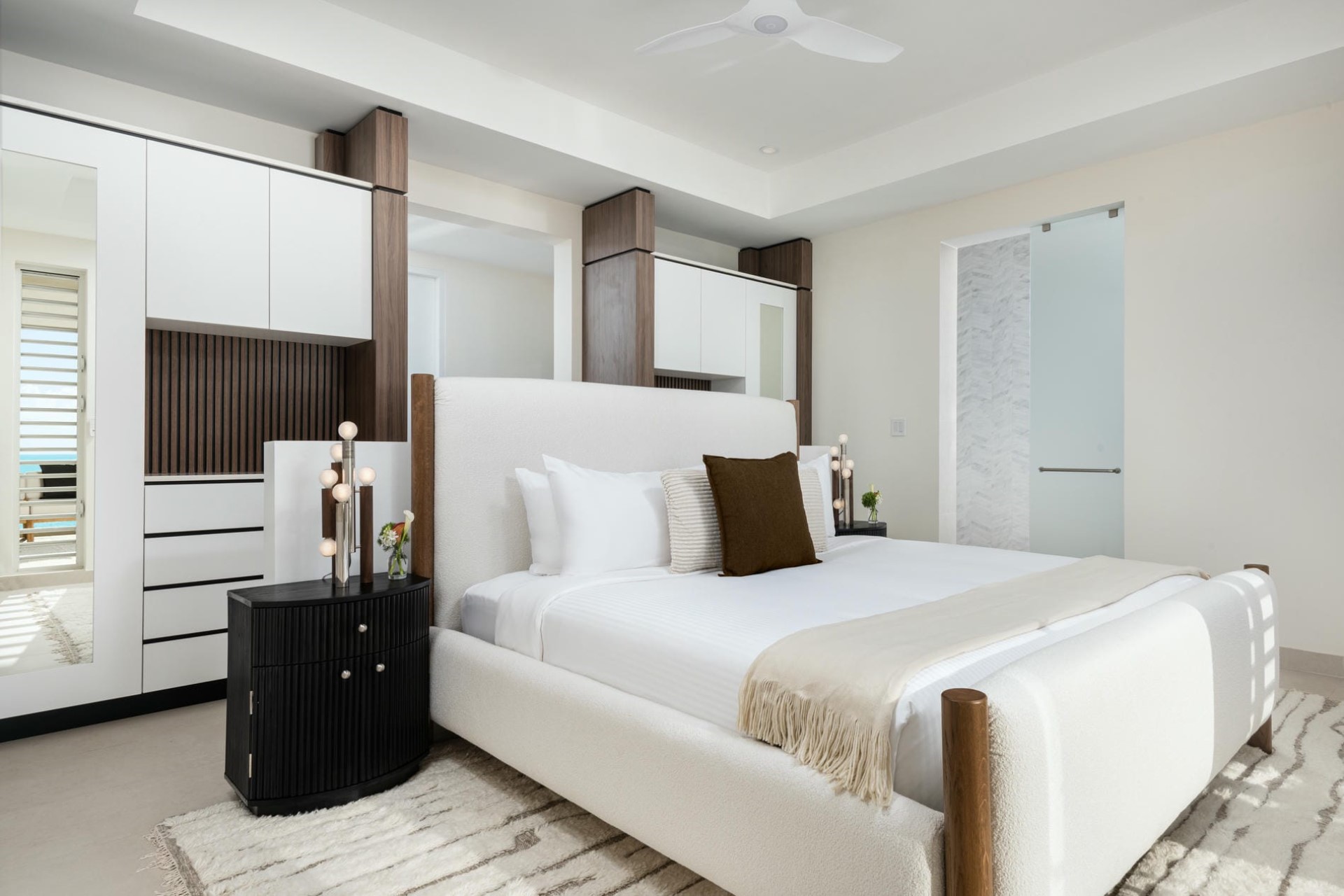 Bedroom 3 – king-size bed, en-suite bathroom with dual vanity & shower, private terrace, and ocean views