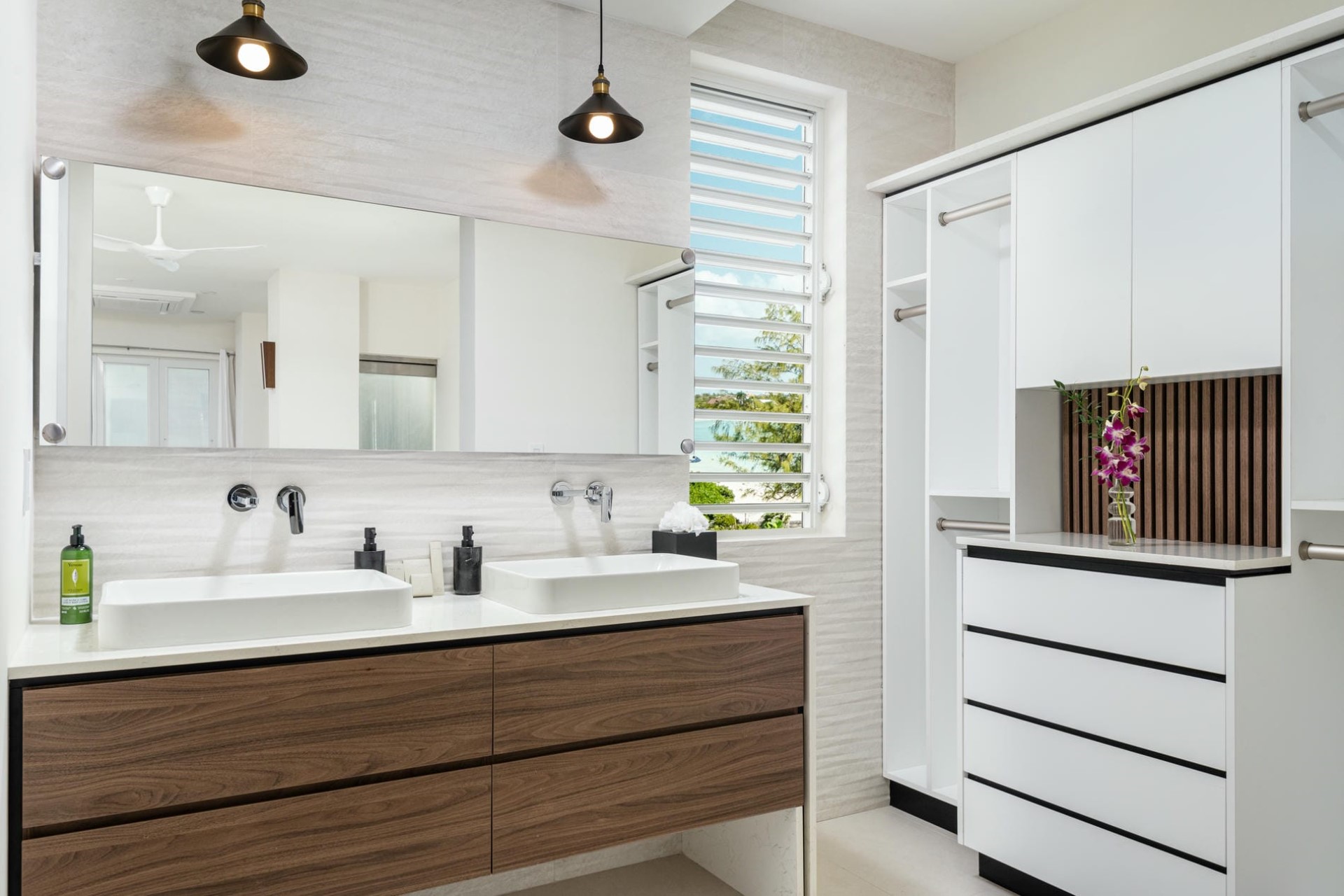 The villa offers five elegantly appointed bedrooms, each designed for privacy and relaxation. On the ground level, three king-size suites feature en-suite bathrooms with dual vanities and showers, with two offering terrace access and ocean views, while one enjoys a peaceful garden view. One of the rooms includes an additional sofa bed, making it an ideal space for families. On the upper level, two king-size bedrooms offer private outdoor spaces with ocean views, one featuring a private balcony and the other a private terrace, both with en-suite bathrooms and showers.
