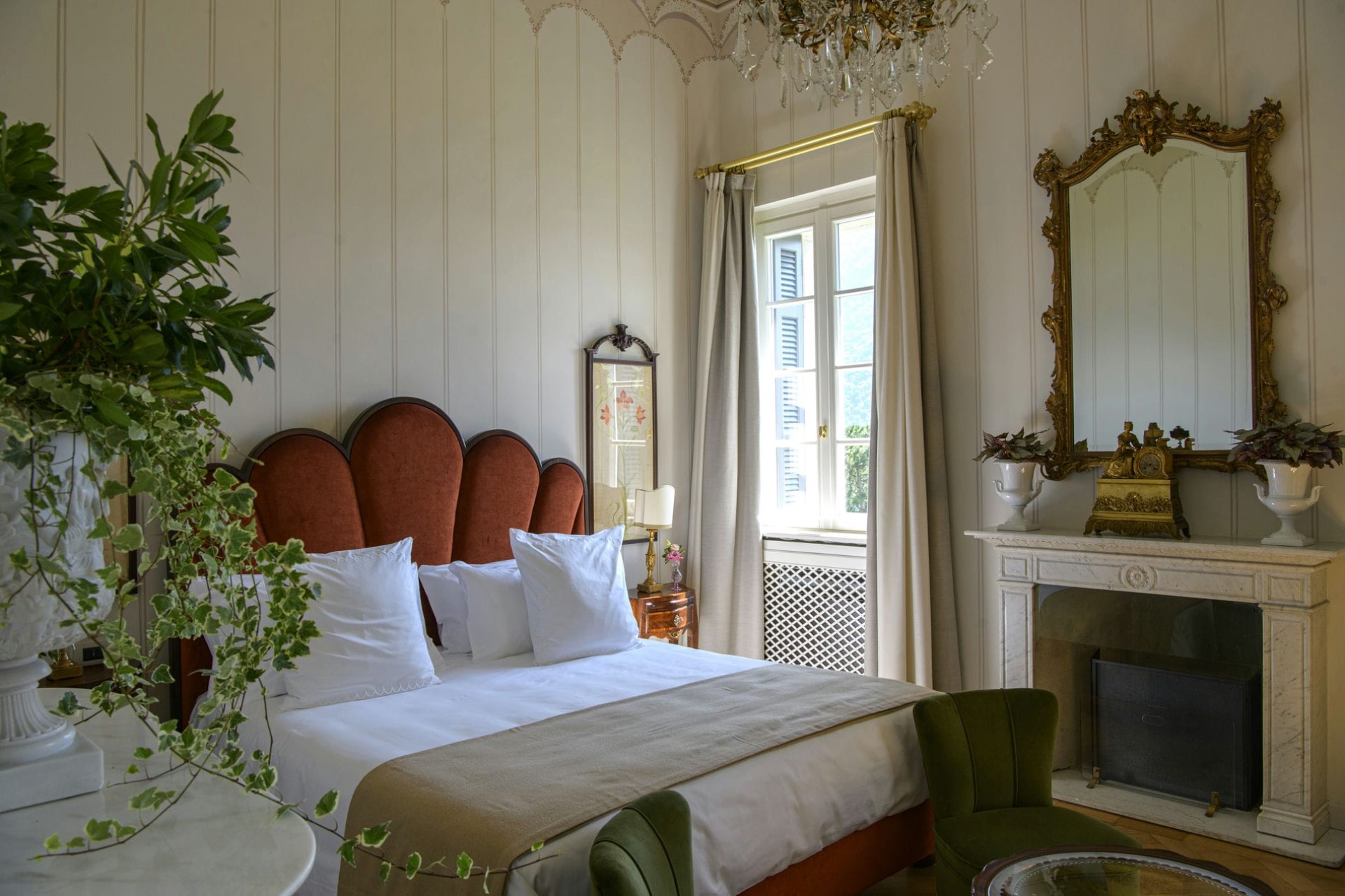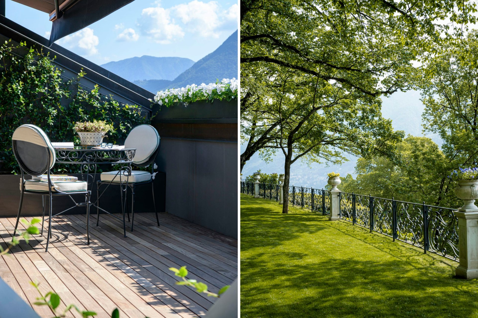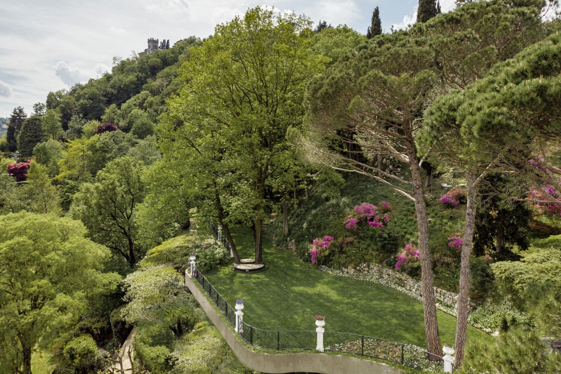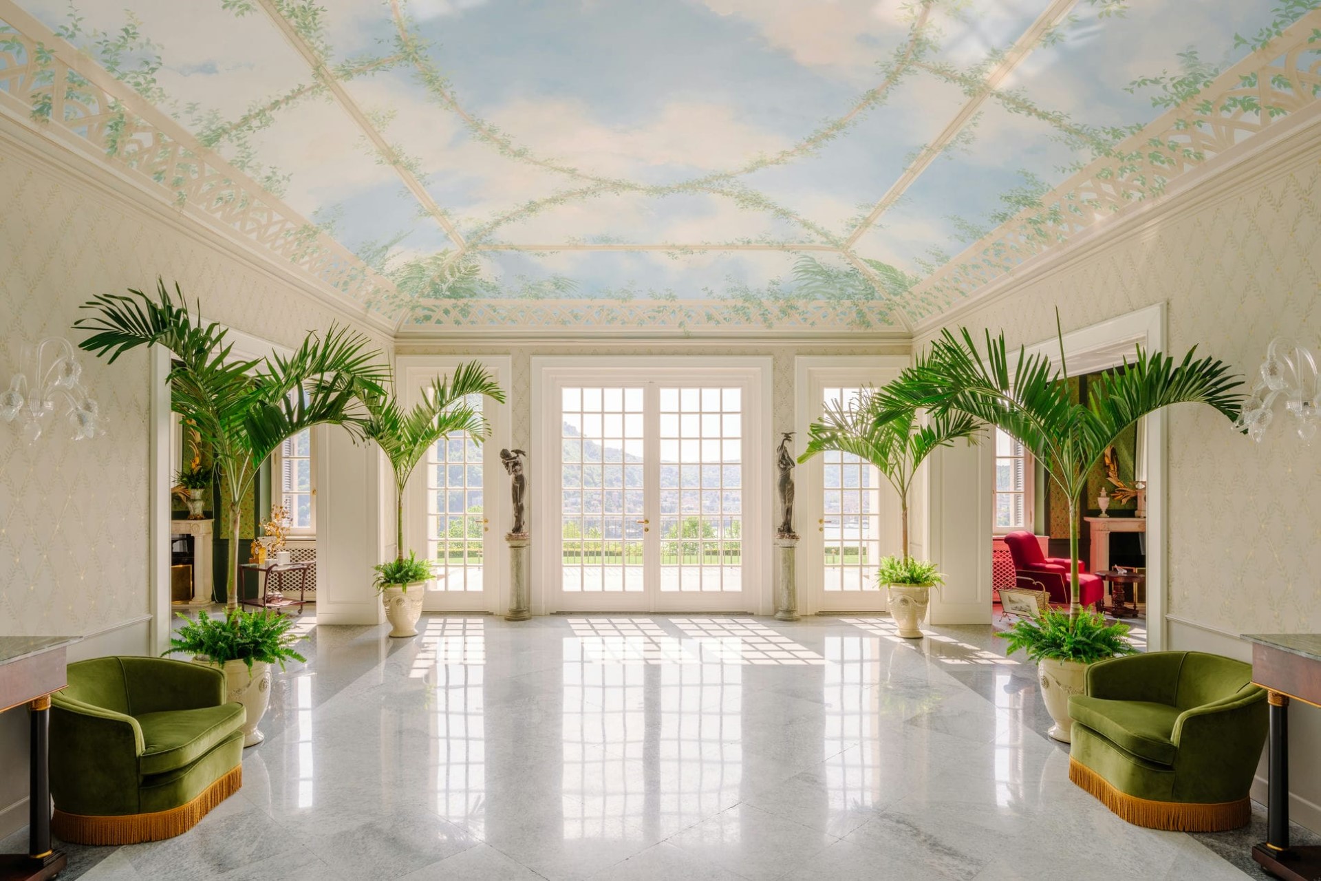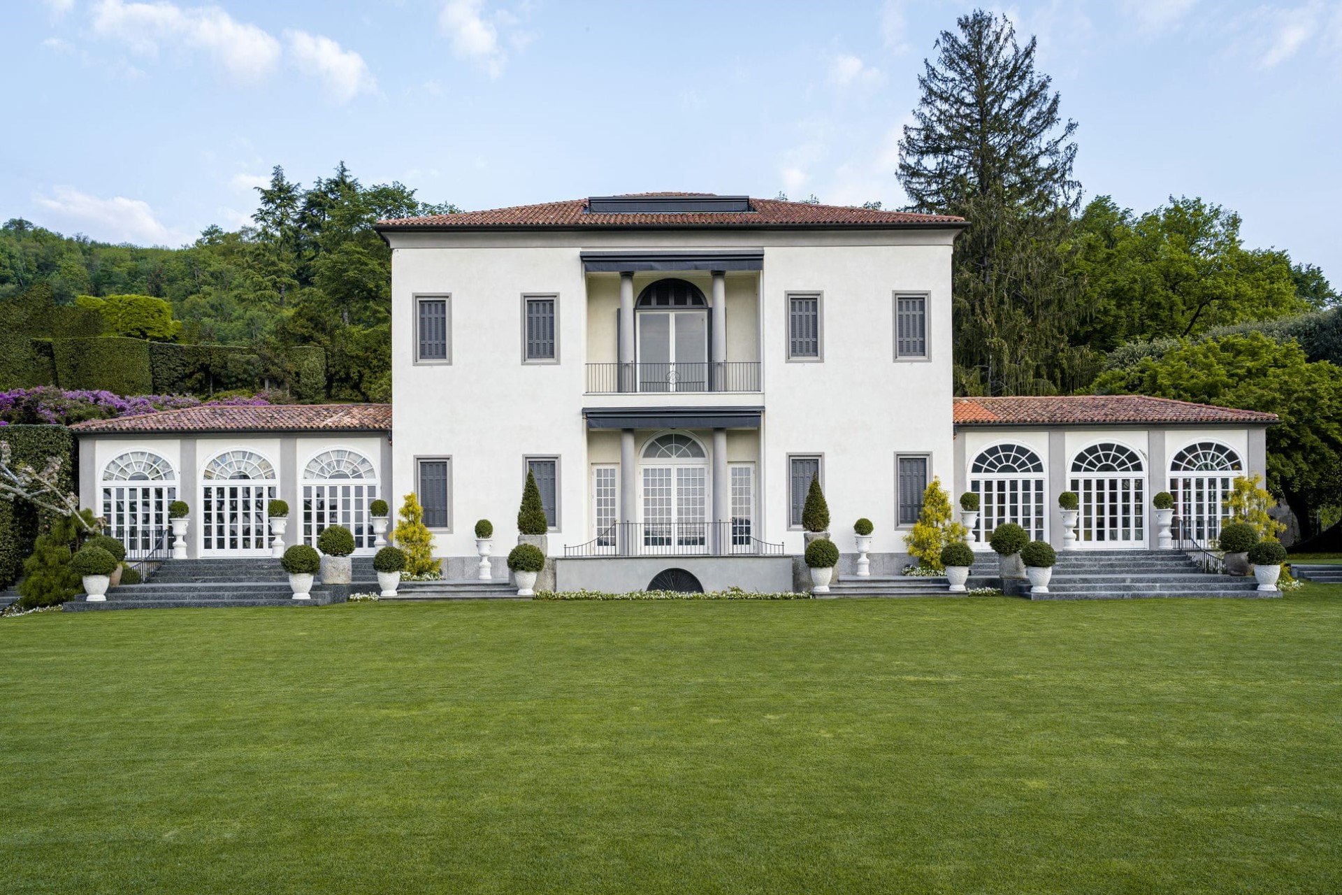 The verdant expanse of the parterre in front of the villa offers some of the most spectacular views of the lake and rolling hills behind. To the side of the villa, an elegant loggia lined with statues and climbing plants offers another space to enjoy the natural surroundings.