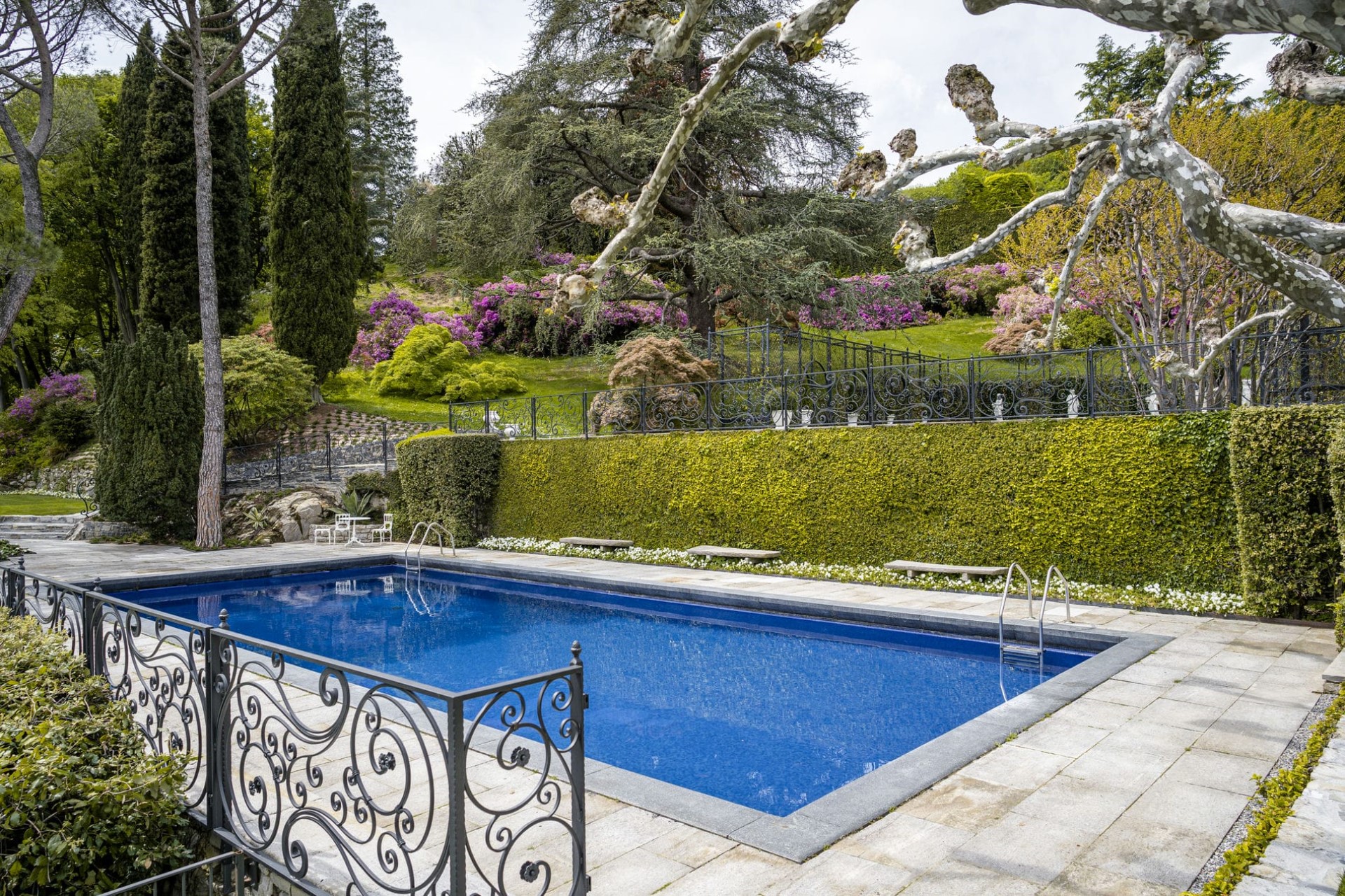 In one corner of the gardens is a large swimming pool, tiled with beautiful blue mosaics specially designed to avoid harsh light reflections. Flanked by manicured hedges and lanky cedar trees, it’s the perfect space for cooling off in the heat of the day.