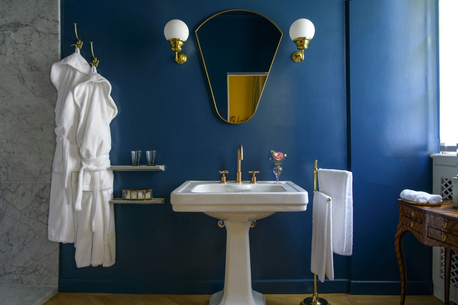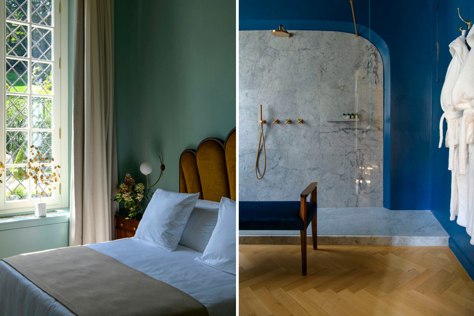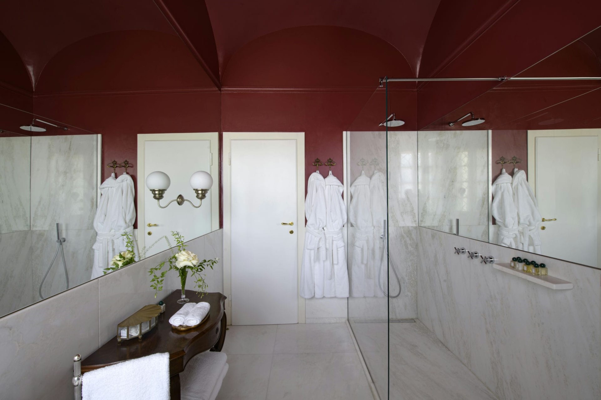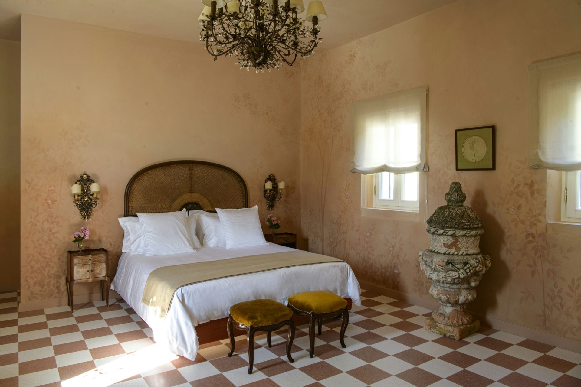 The impeccably restored villa interiors exude opulence with their high, domed ceilings, elegant lighting, and carefully selected furnishings. Polished marble floors welcome guests across the ground floor rooms.