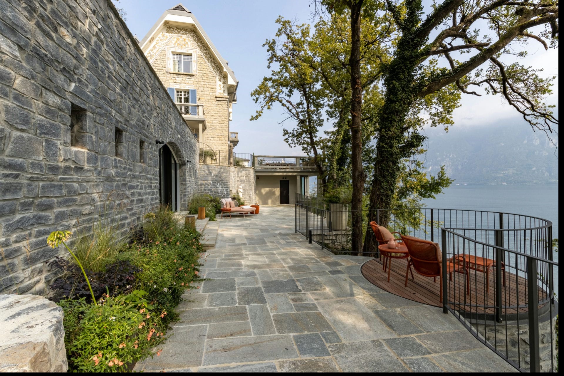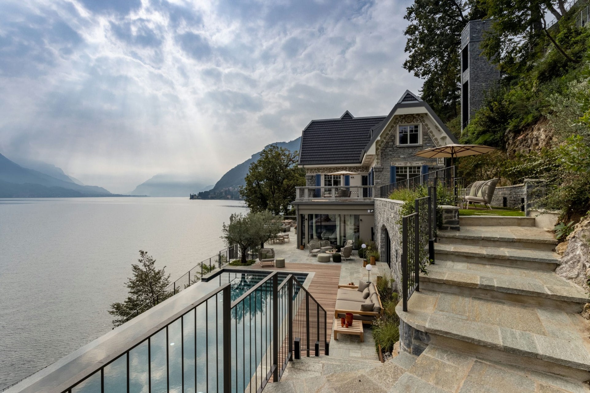 A beautifully-restored villa with sprawling terraces, a heated infinity pool, and direct lake access