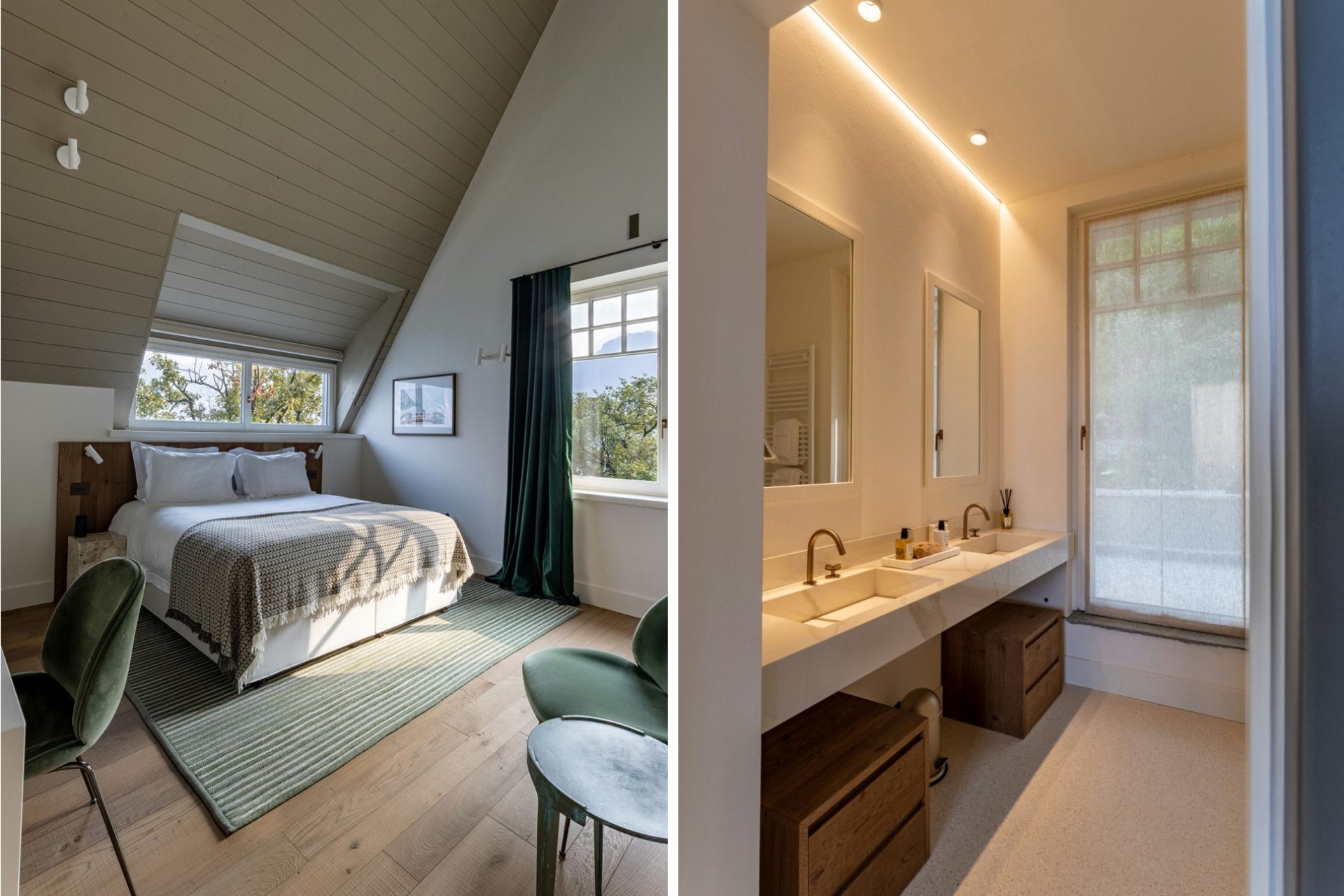Suite 6 – king-size bed, en-suite bathroom with dual vanity & shower, terrace access, and lake views