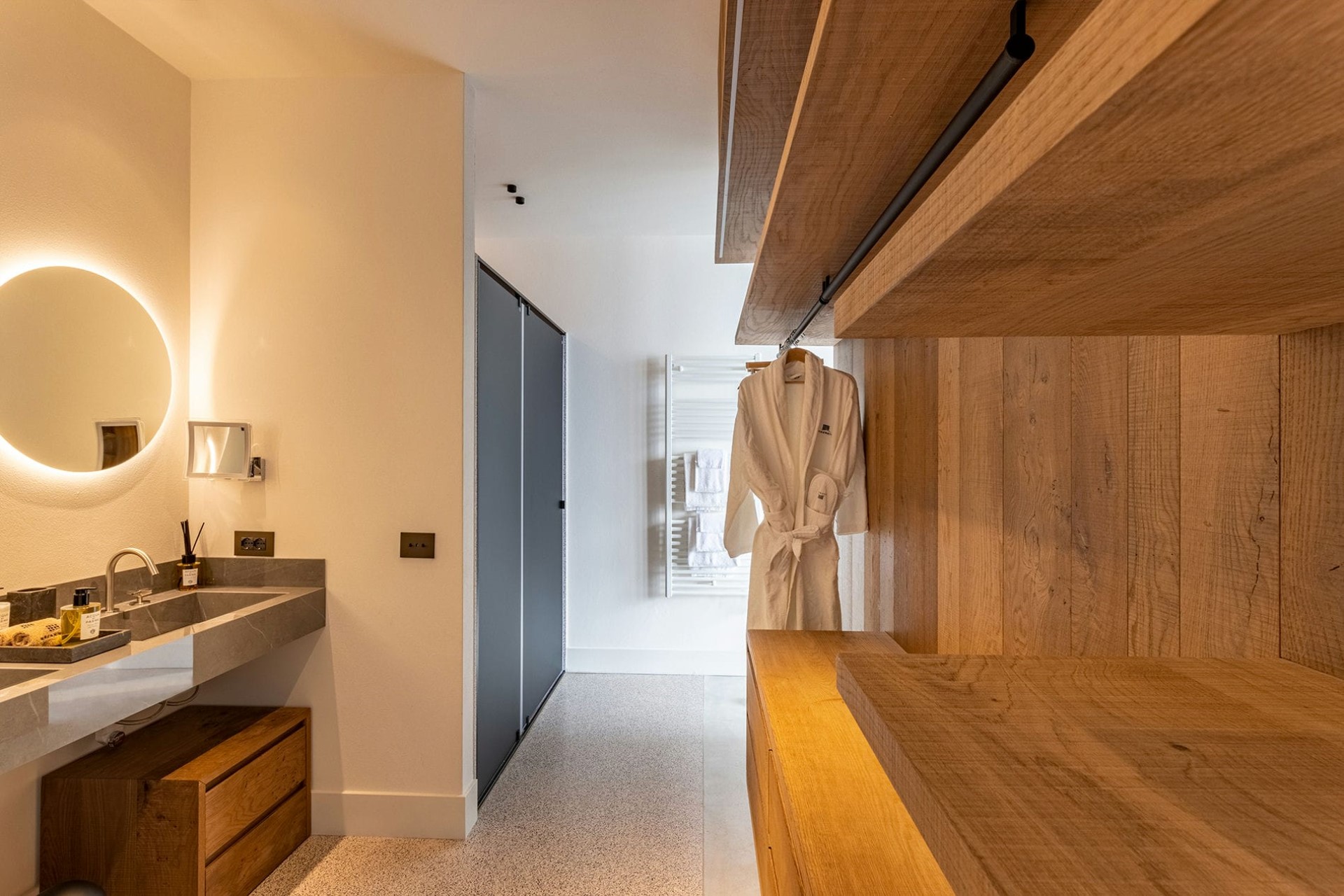 Suite 7 – king-size bed, en-suite bathroom with dual vanity & shower, terrace access, and lake views