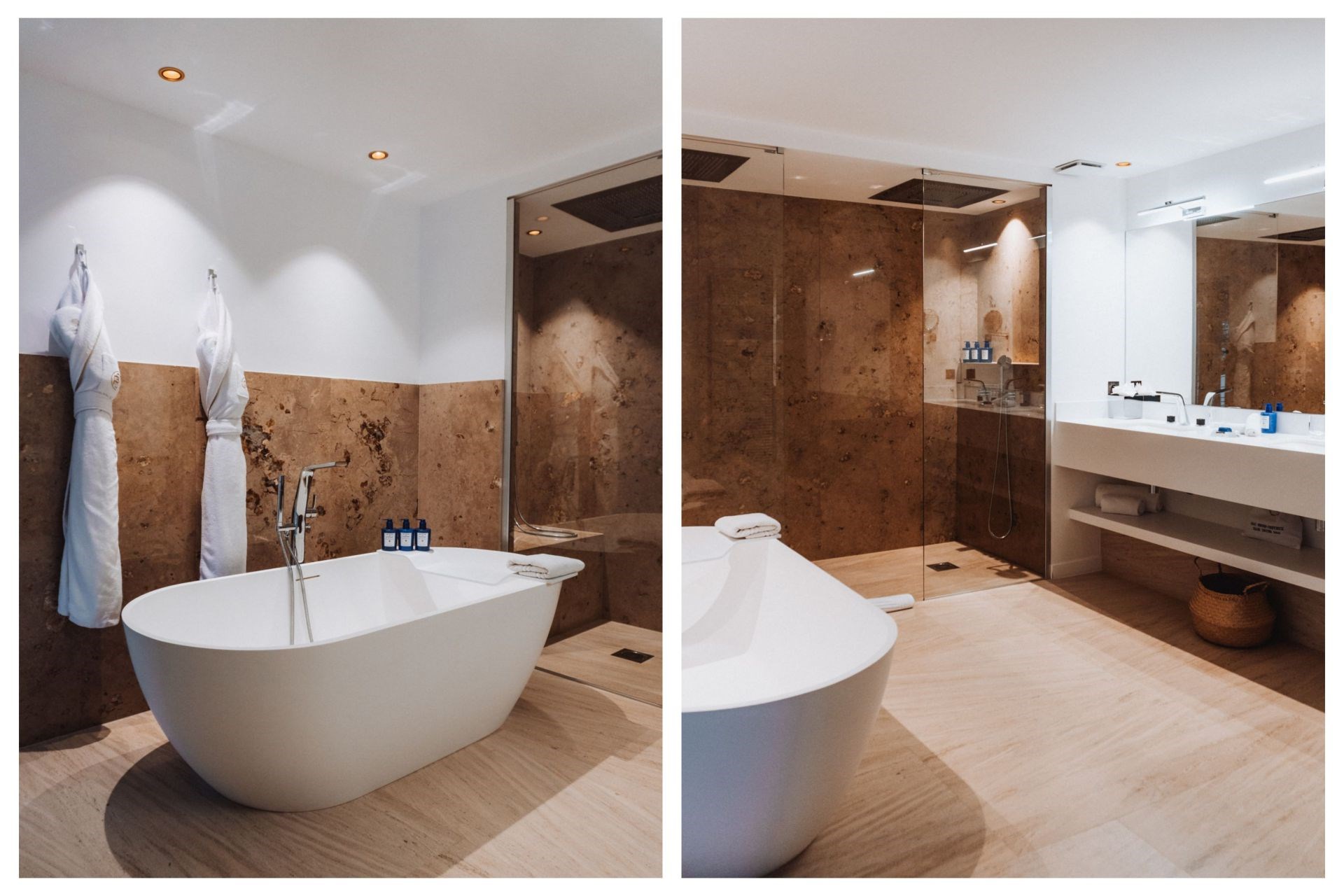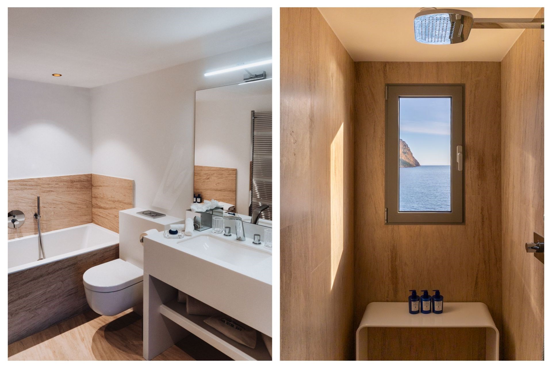 Bedroom 1 – king-size bed, en-suite bathroom with double vanity, bathtub & separate double shower, and private terrace with sea views
