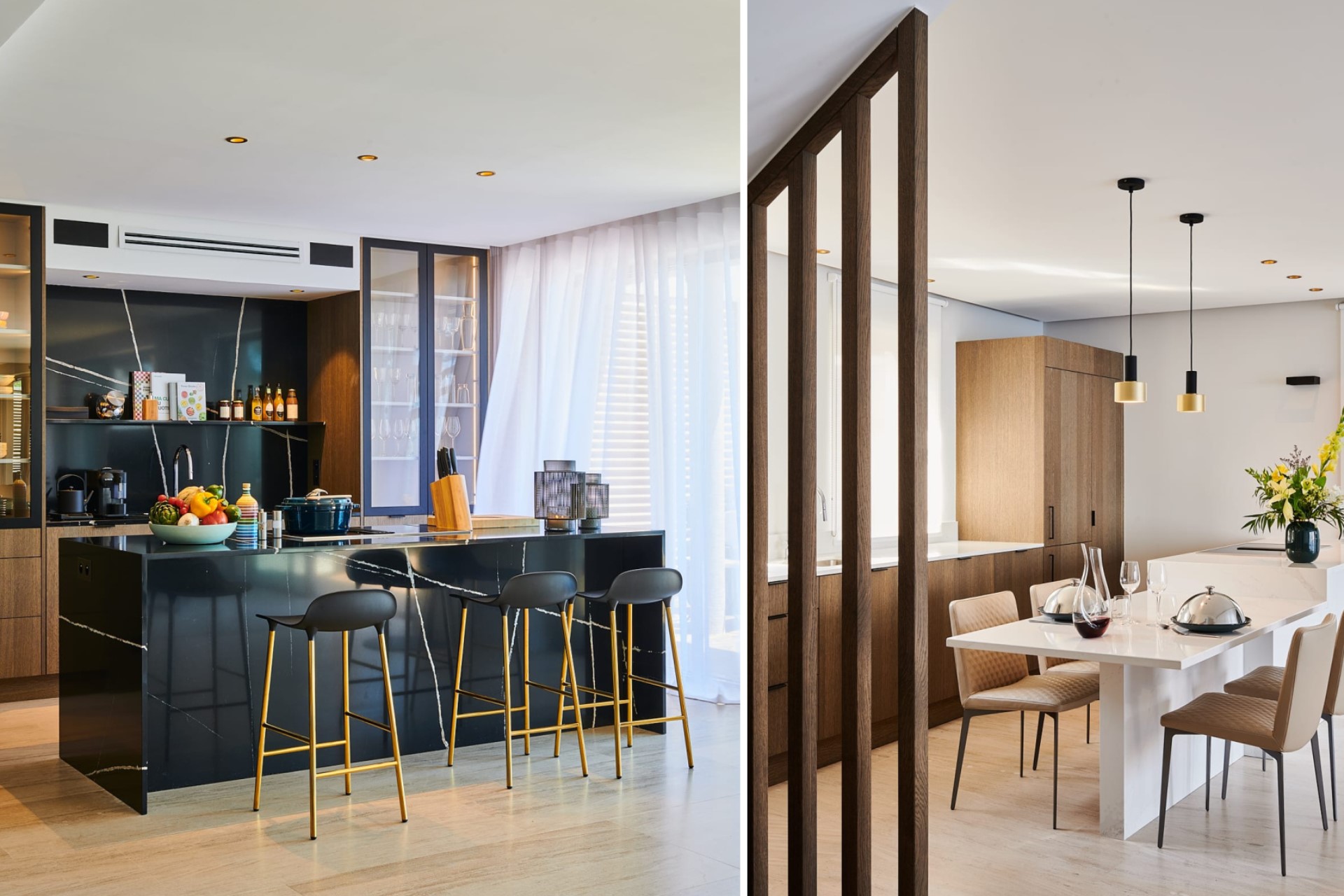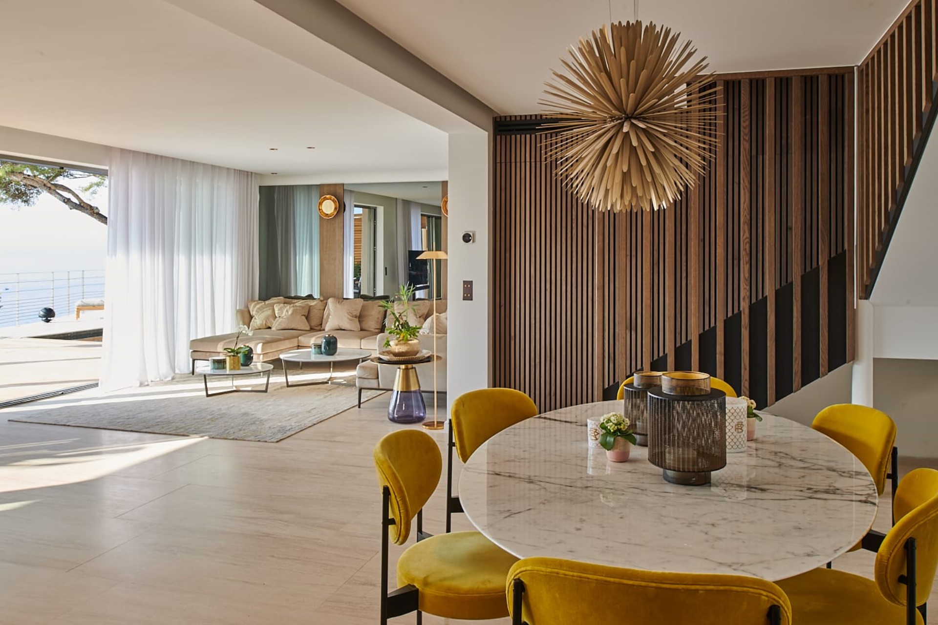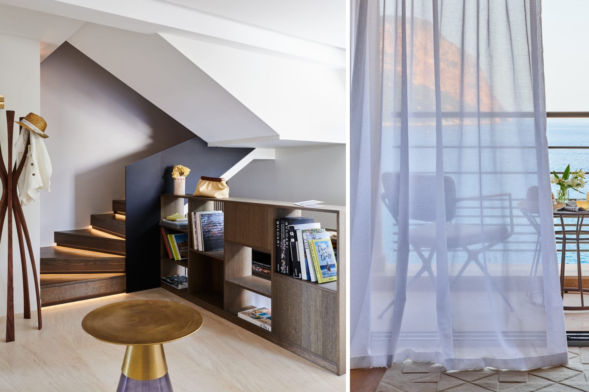 The villa is set across four levels, tastefully blending in with its rocky background. It is split into two apartments, making it ideal for families or groups of friends travelling together. Each floor features contemporary furniture, minimalist décor, and floor-to-ceiling windows, allowing for spectacular views.