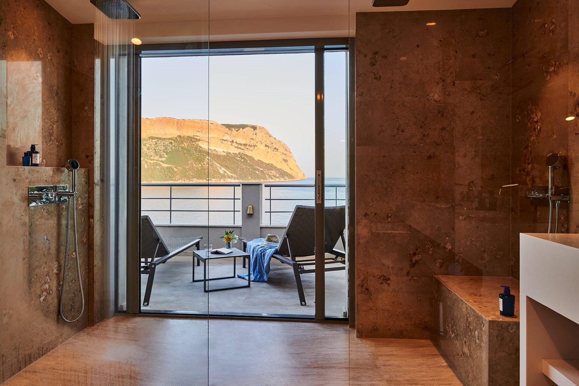 Moreover, guests can enjoy not just one but two heated swimming pools. One has been carved into the rocks, right down by the sea; the other – on a higher terrace – is ideal for swimming a few laps before soaking up the sun from a poolside lounger or relaxing in one of the shady outdoor lounge areas and taking in the panoramic views.